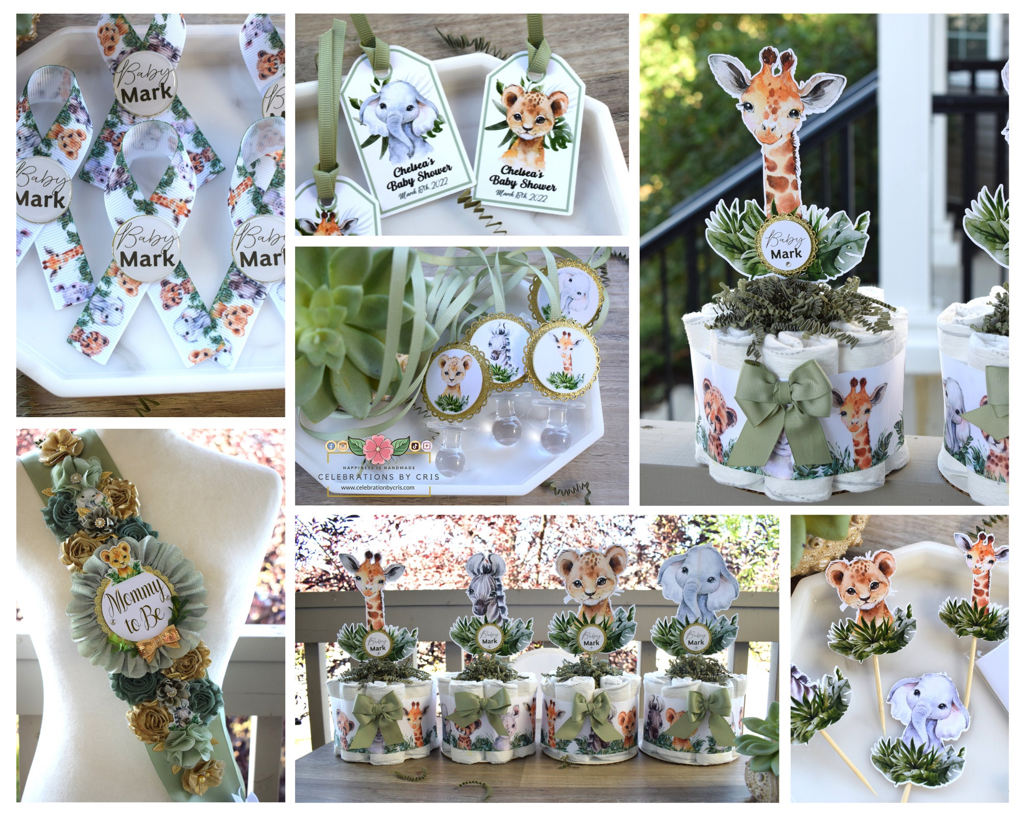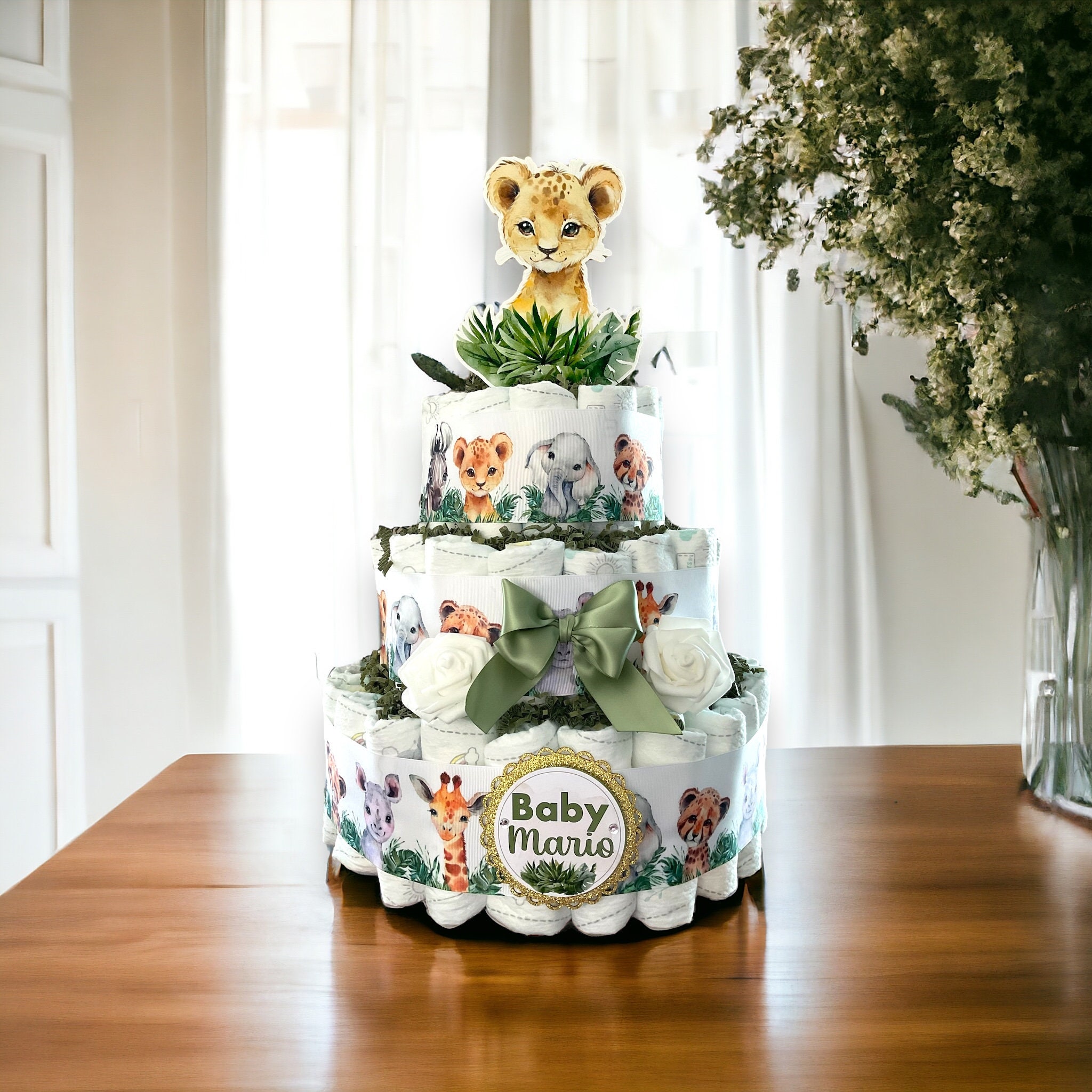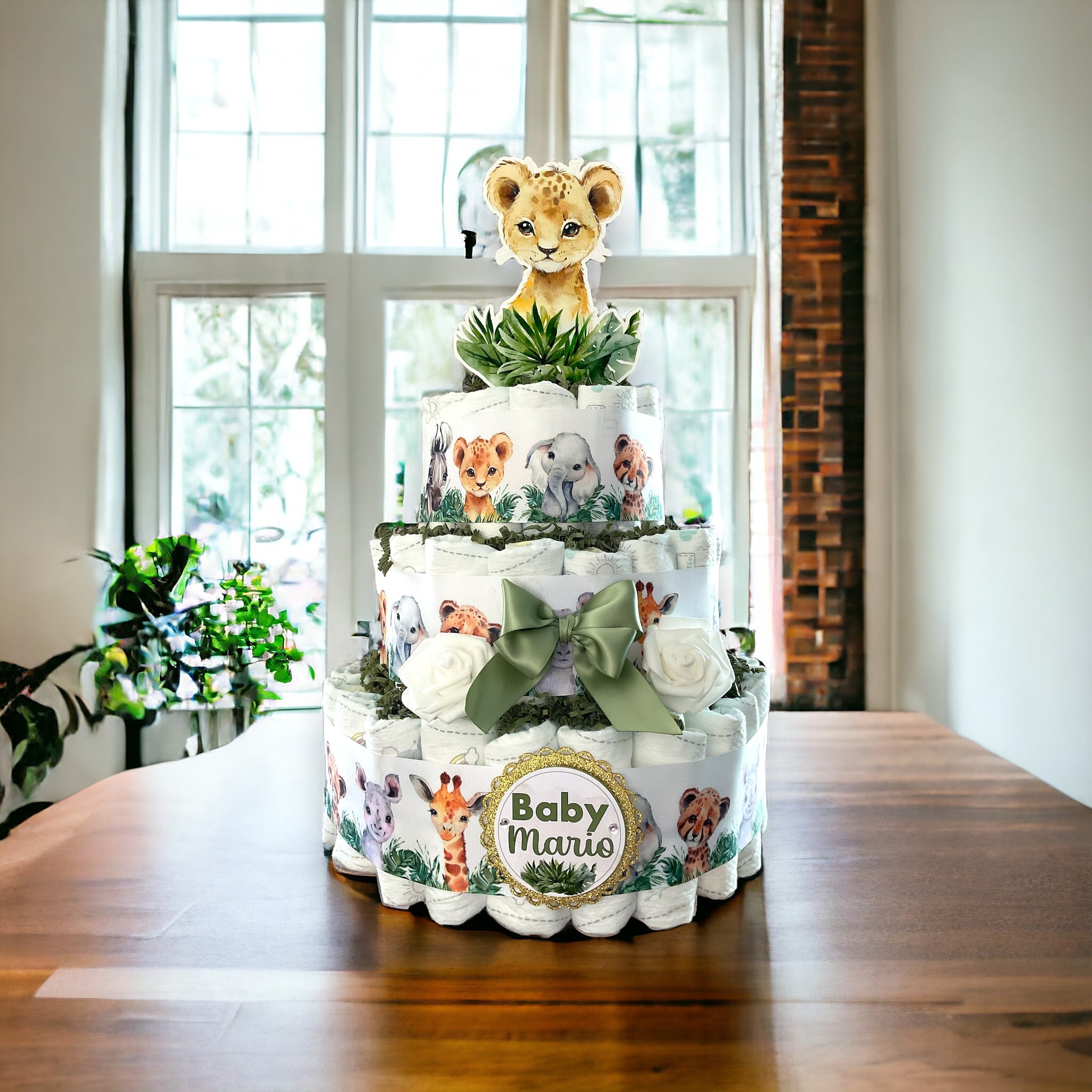 -. This DIAPER CAKE is decorated with safari colors in sage green & white.