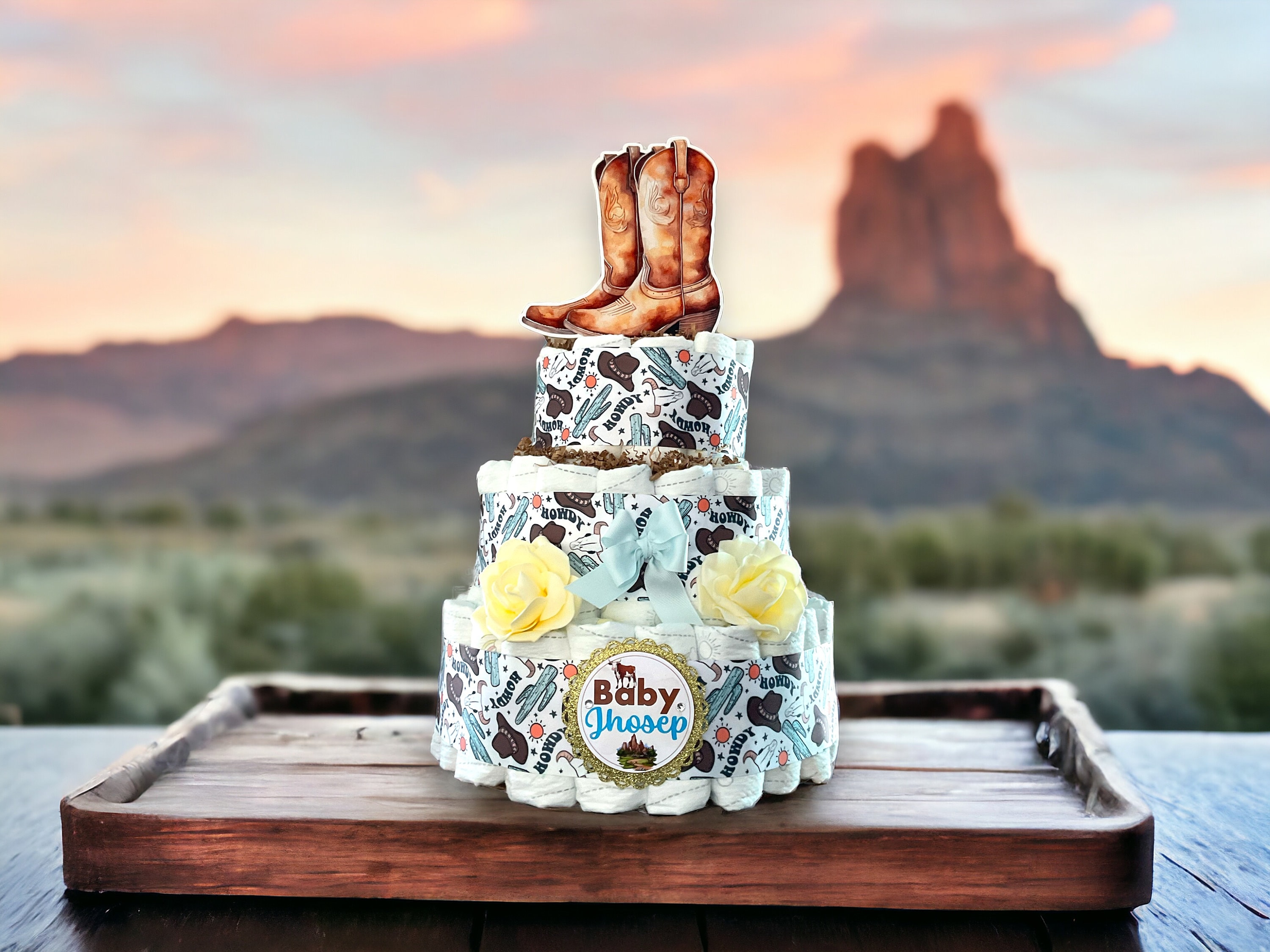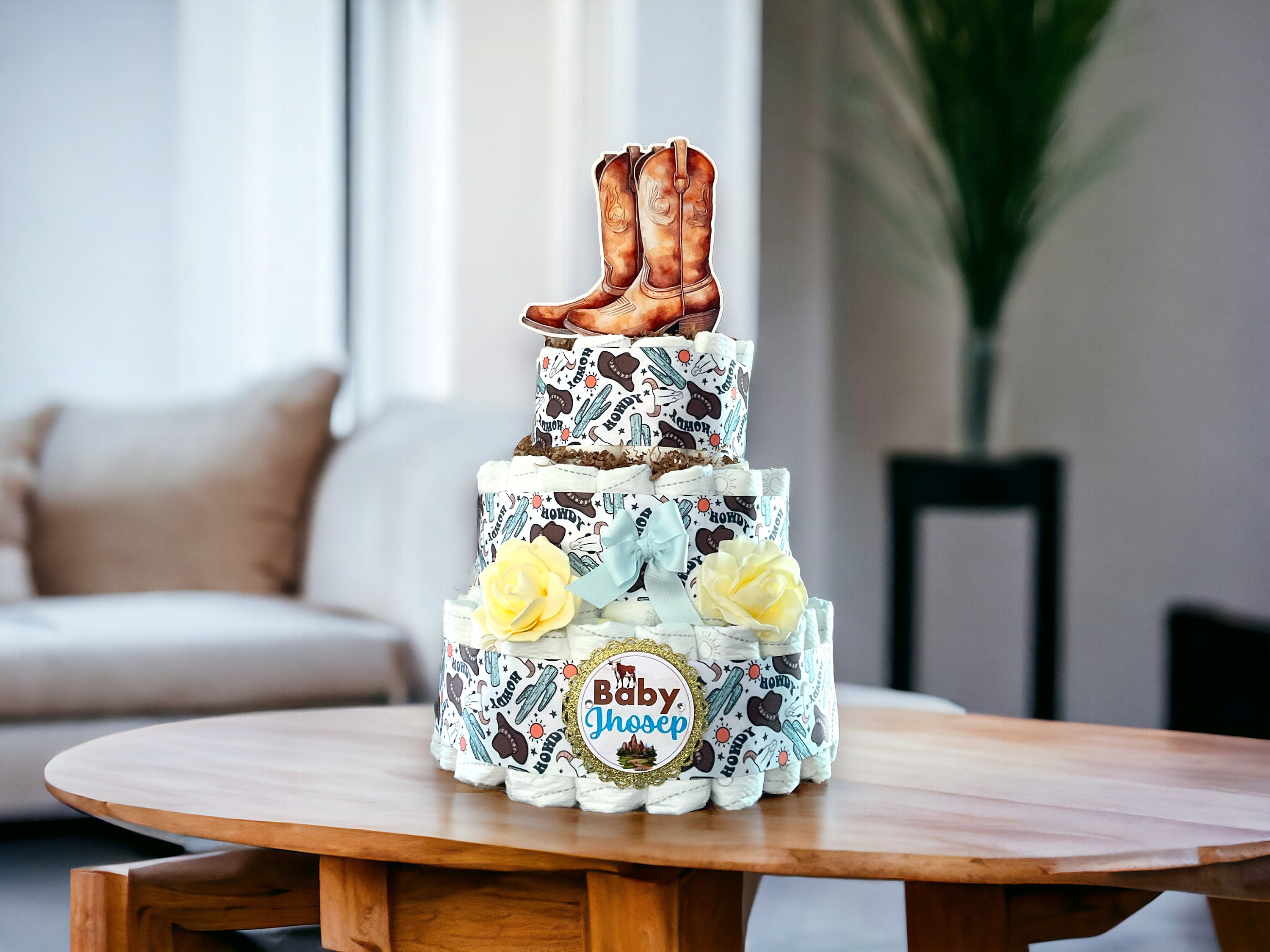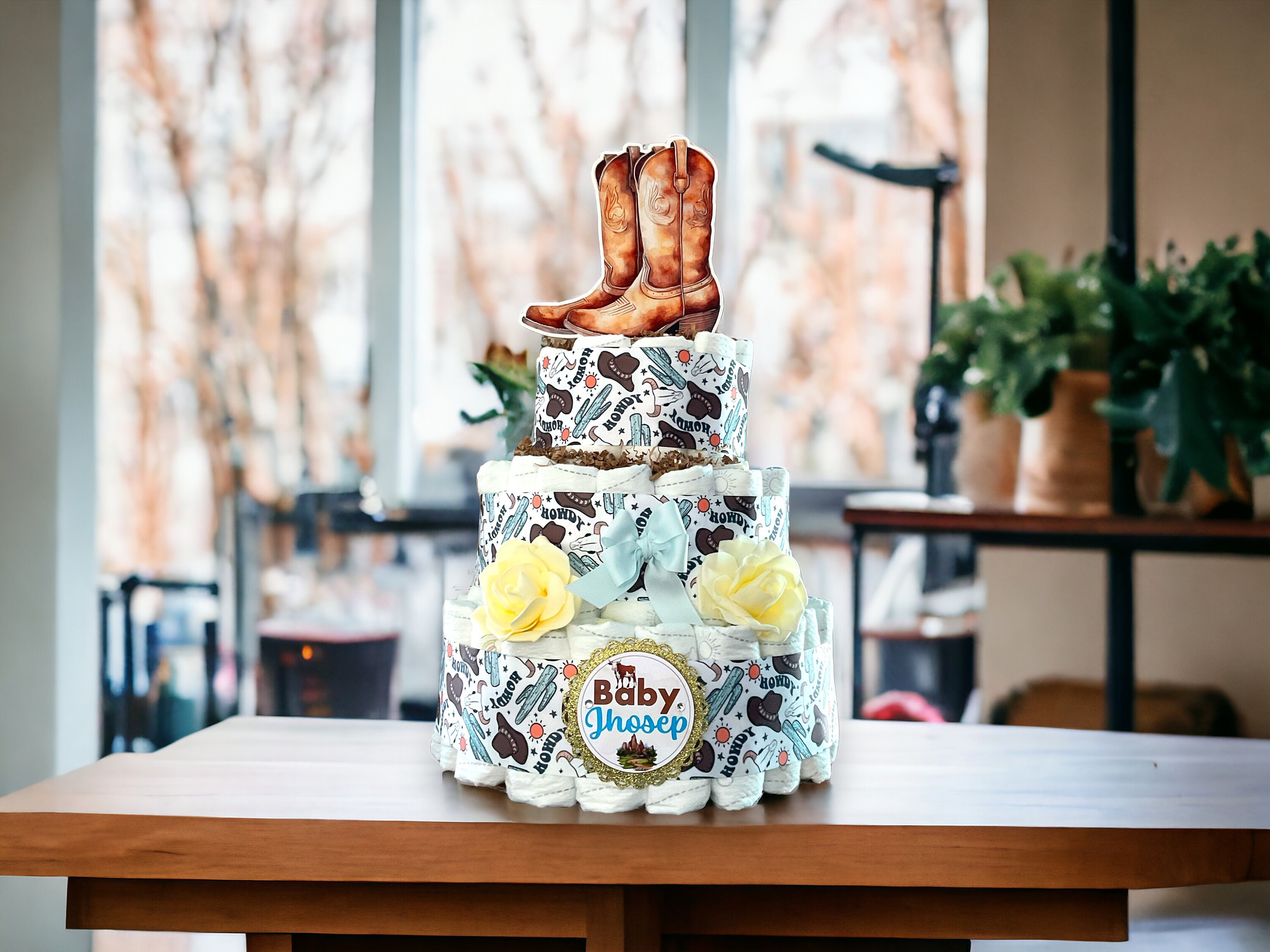 This Gorgeous Cowboy Diaper 3 Tiers Cake are the perfect centerpieces for your baby shower. We can match any shower theme.