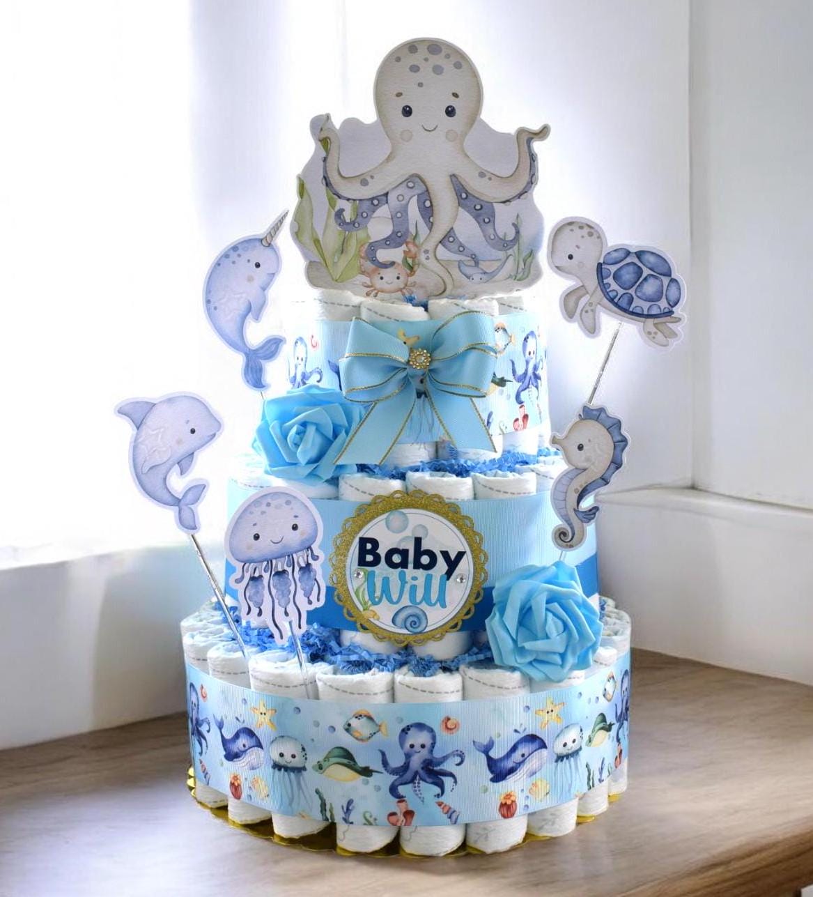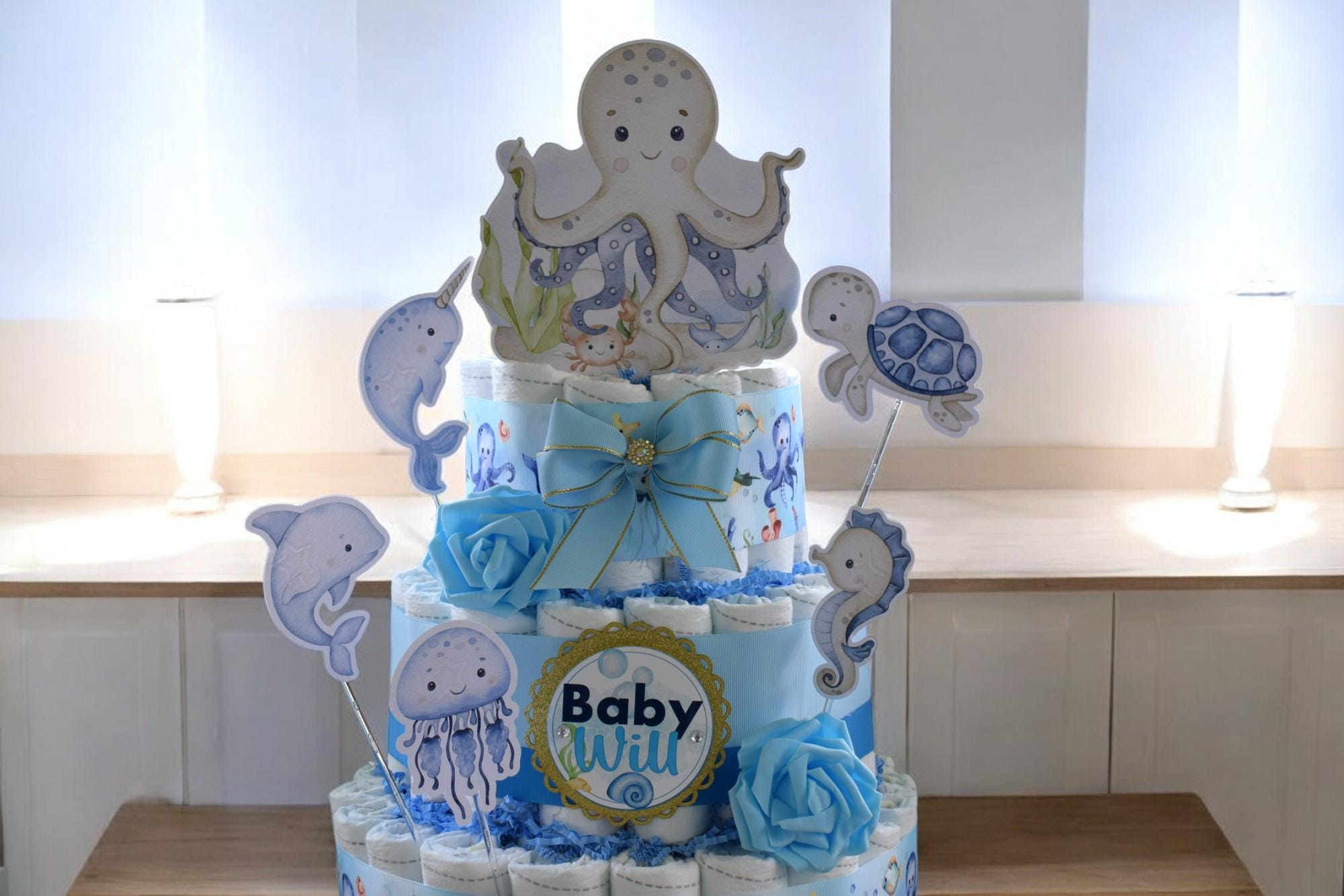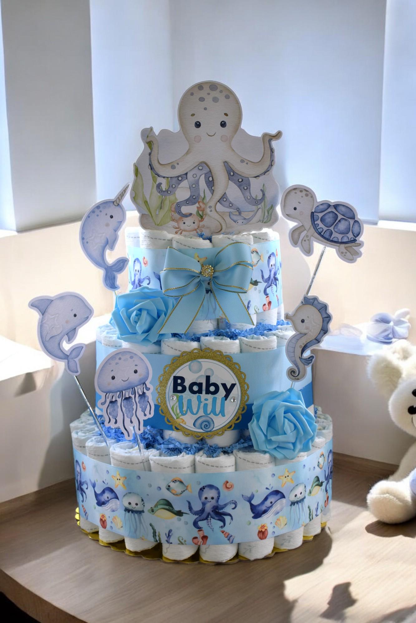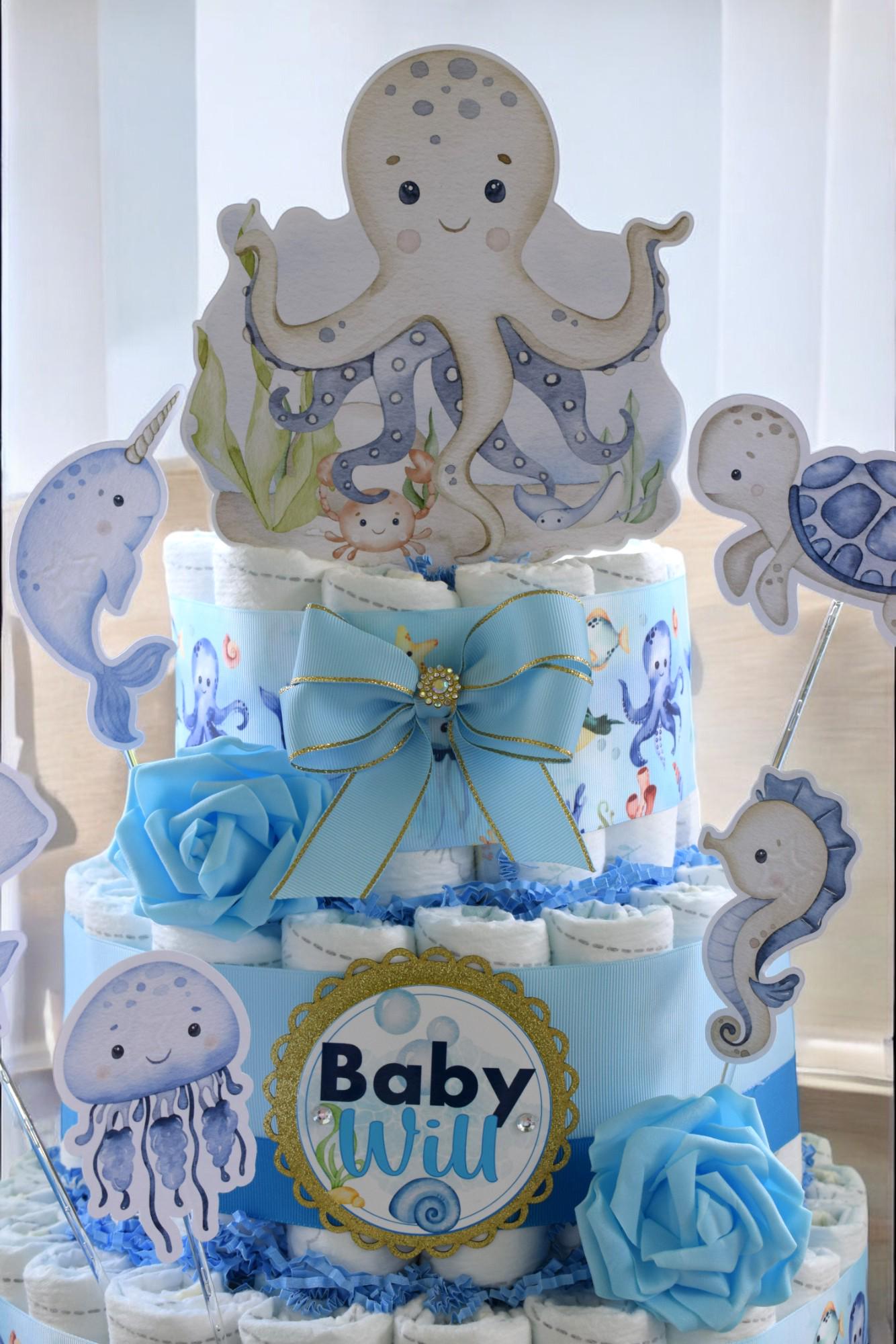Under The Sea Diaper Cake Baby Shower, Octopus Turtle Baby Shower Centerpieces Decorations, Boy Room Nursery Decor, New Mom Gifts - S00015