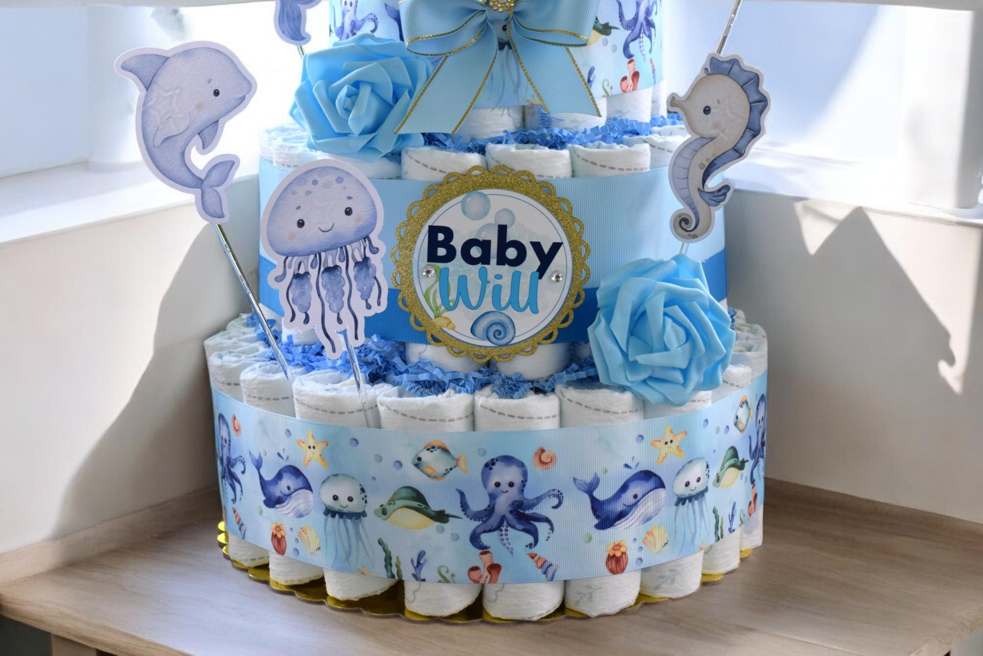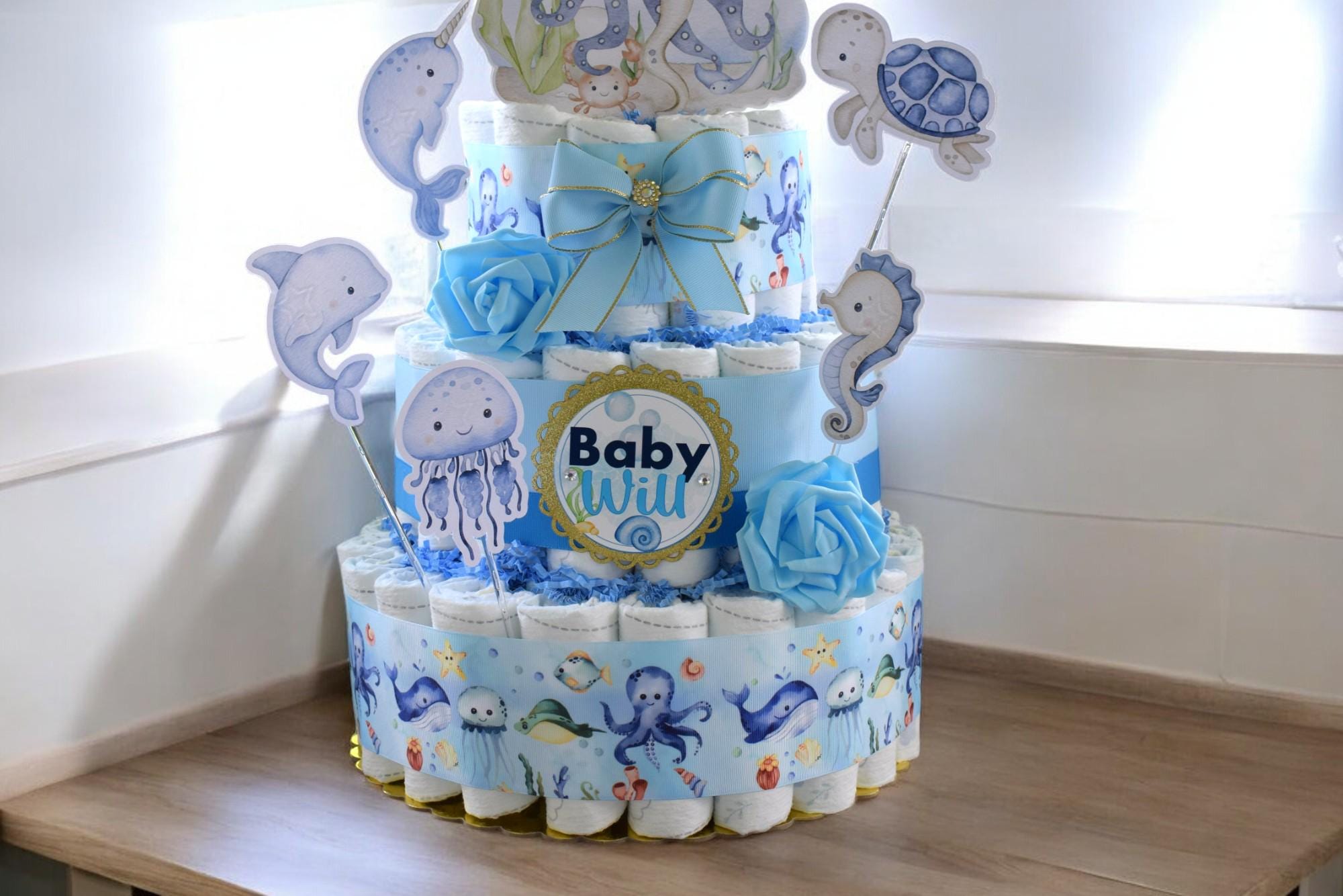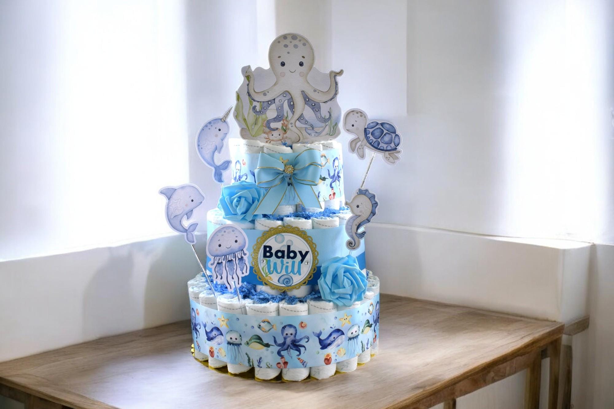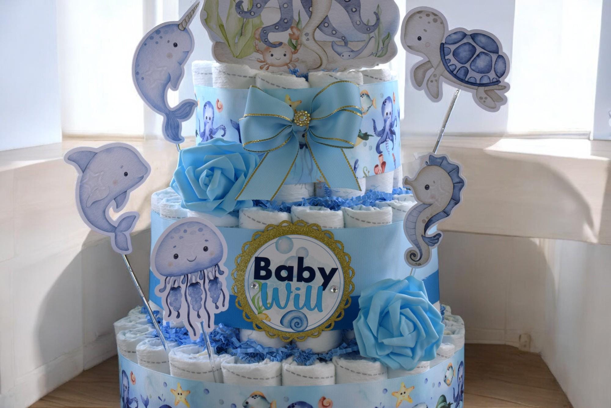 Under The Sea Diaper Cake Baby Shower, Octopus Turtle Baby Shower Centerpieces Decorations, Boy Room Nursery Decor, New Mom Gifts - S00015