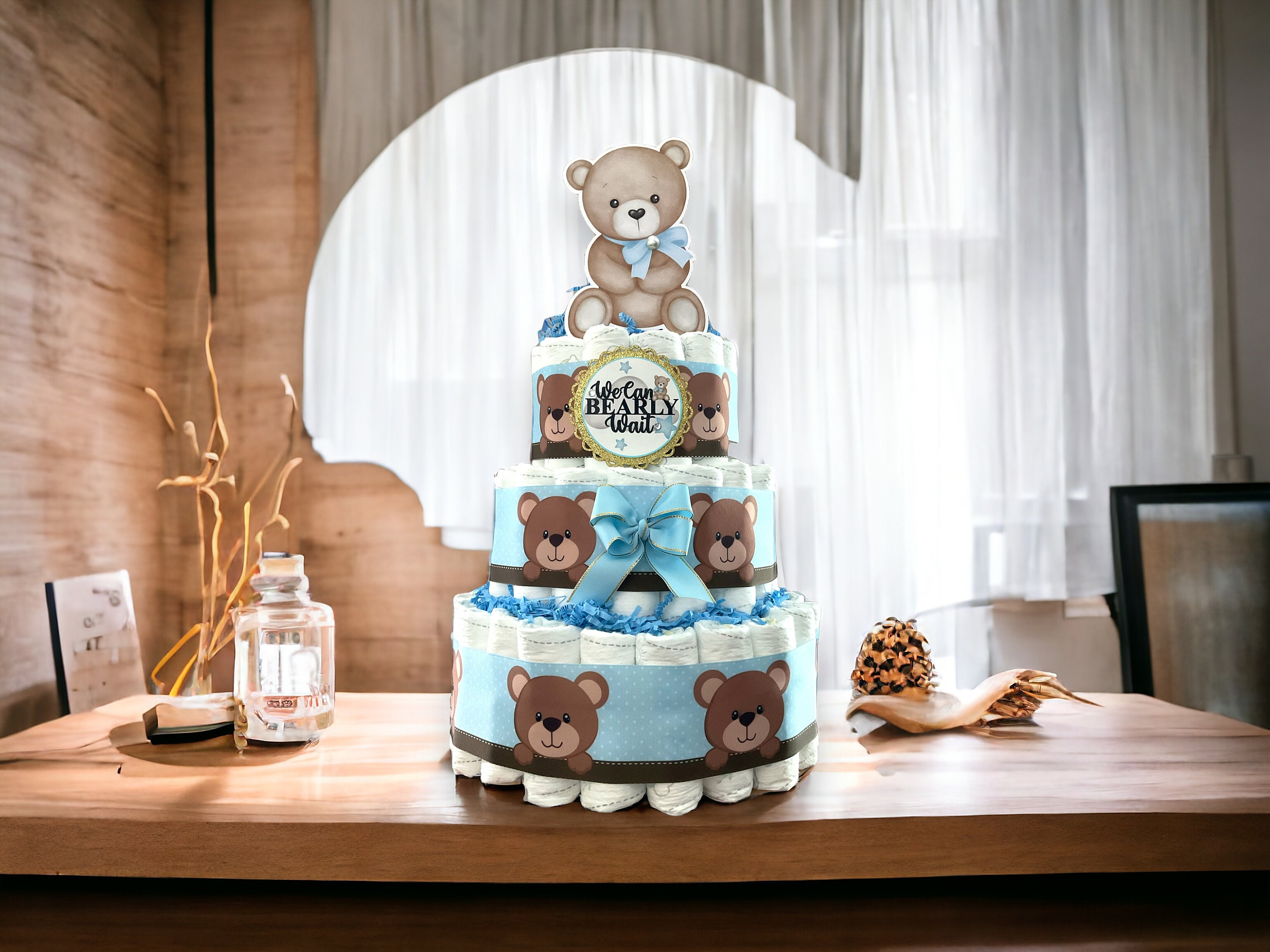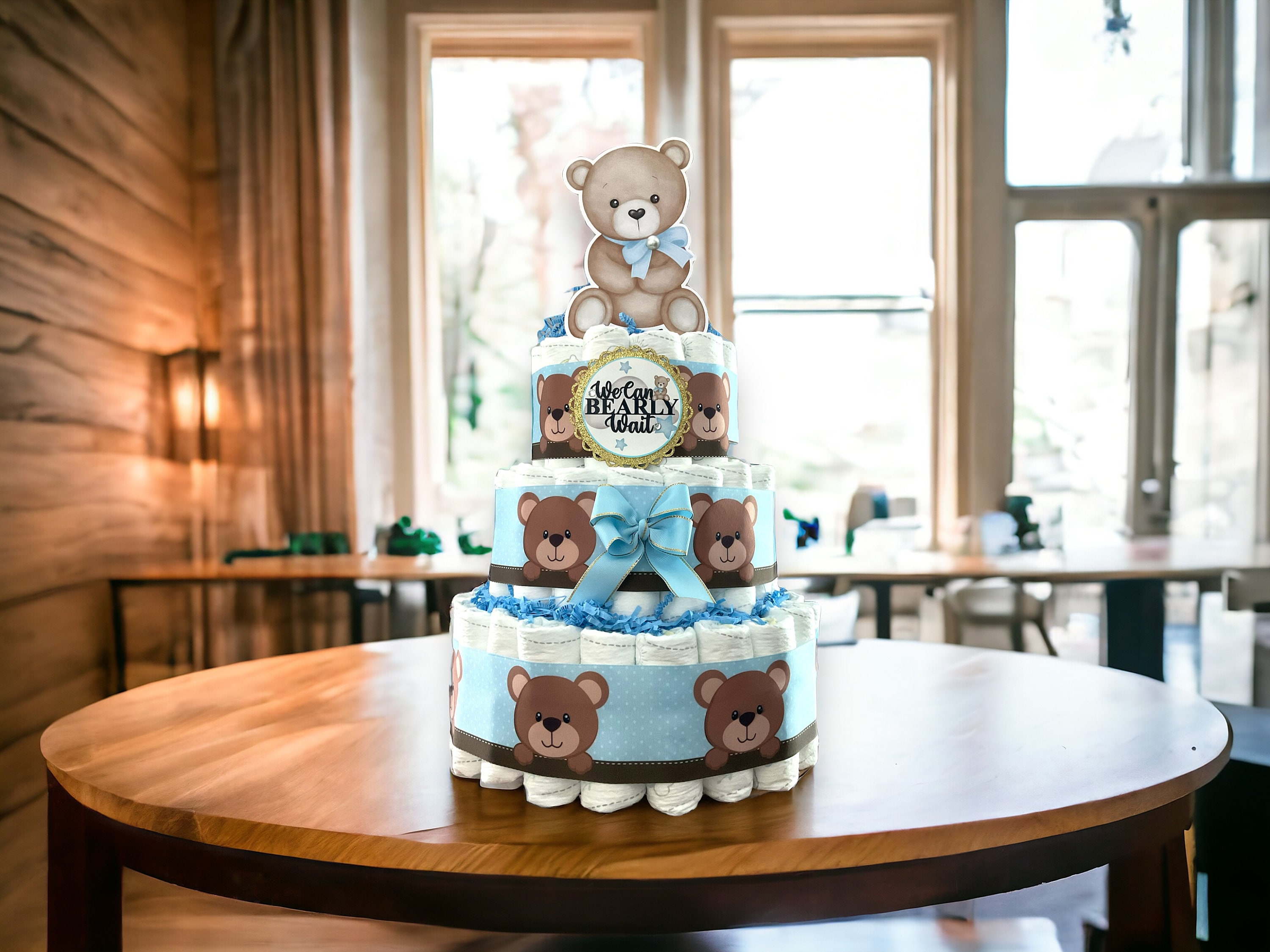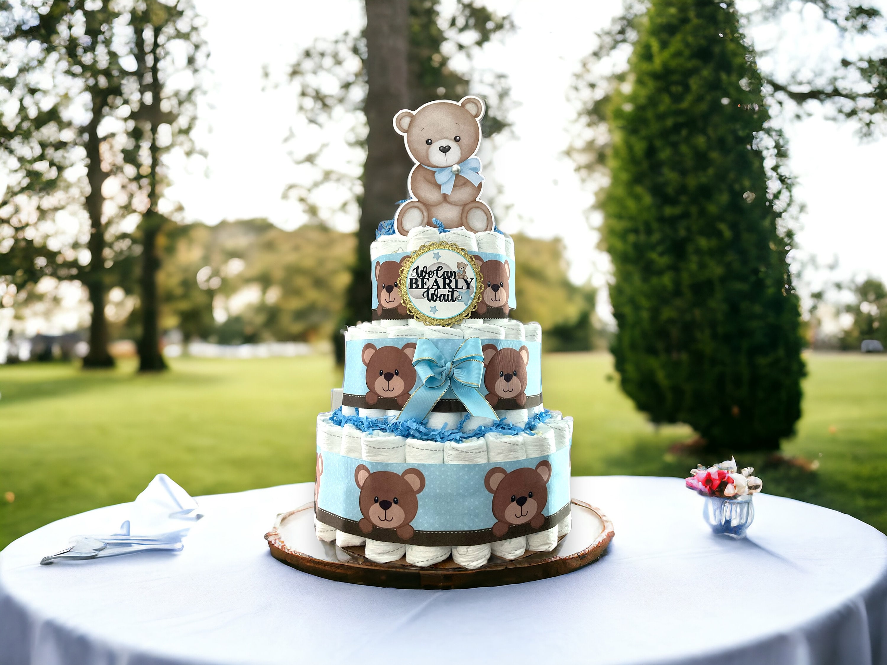 Boy Bear Diaper Cake Baby Shower, Blue Teddy Bear 3 Tier Diaper Cake Centerpieces Decorations, We Can Bearly Wait, Baby Shower Decor - S0011