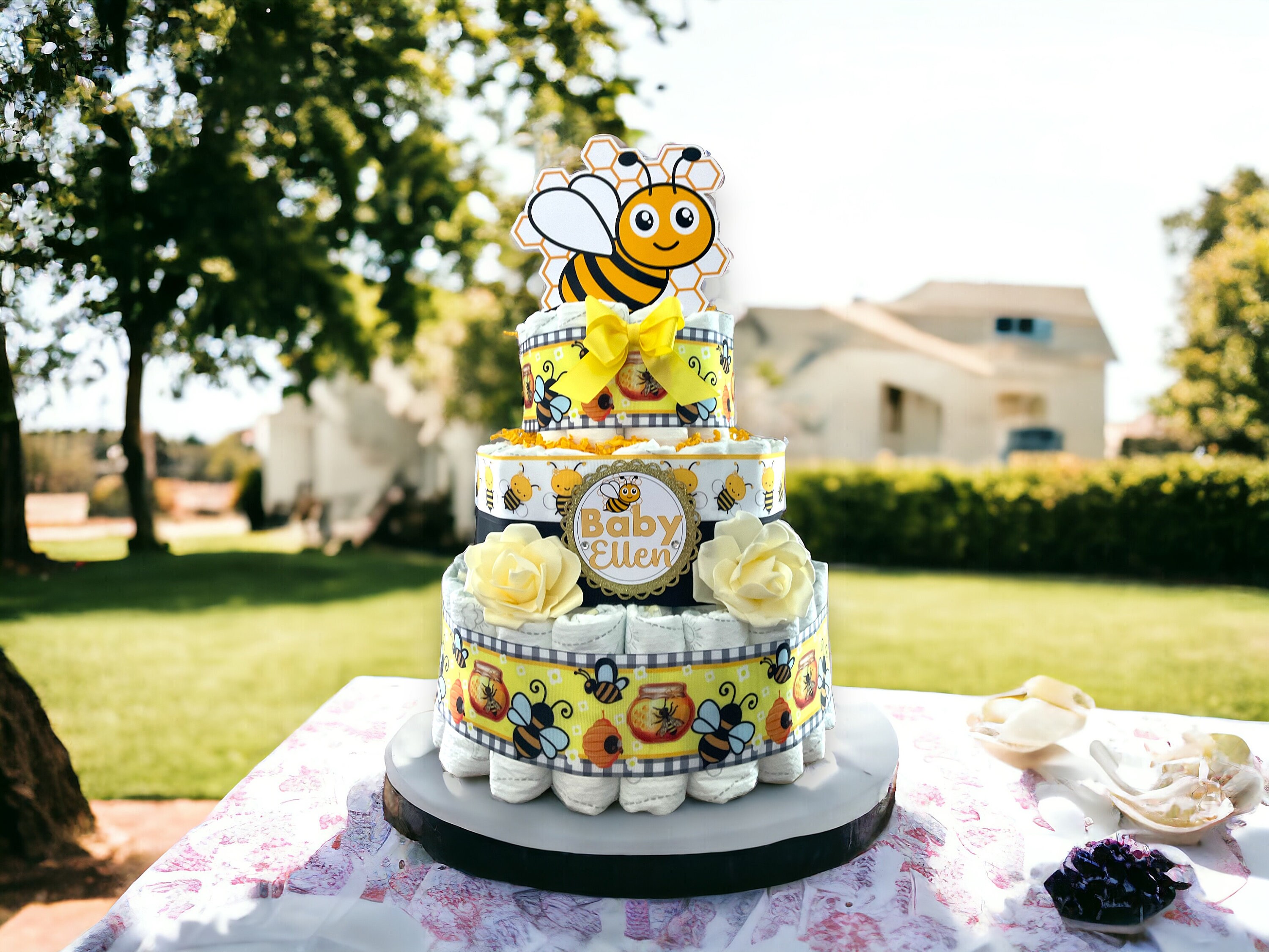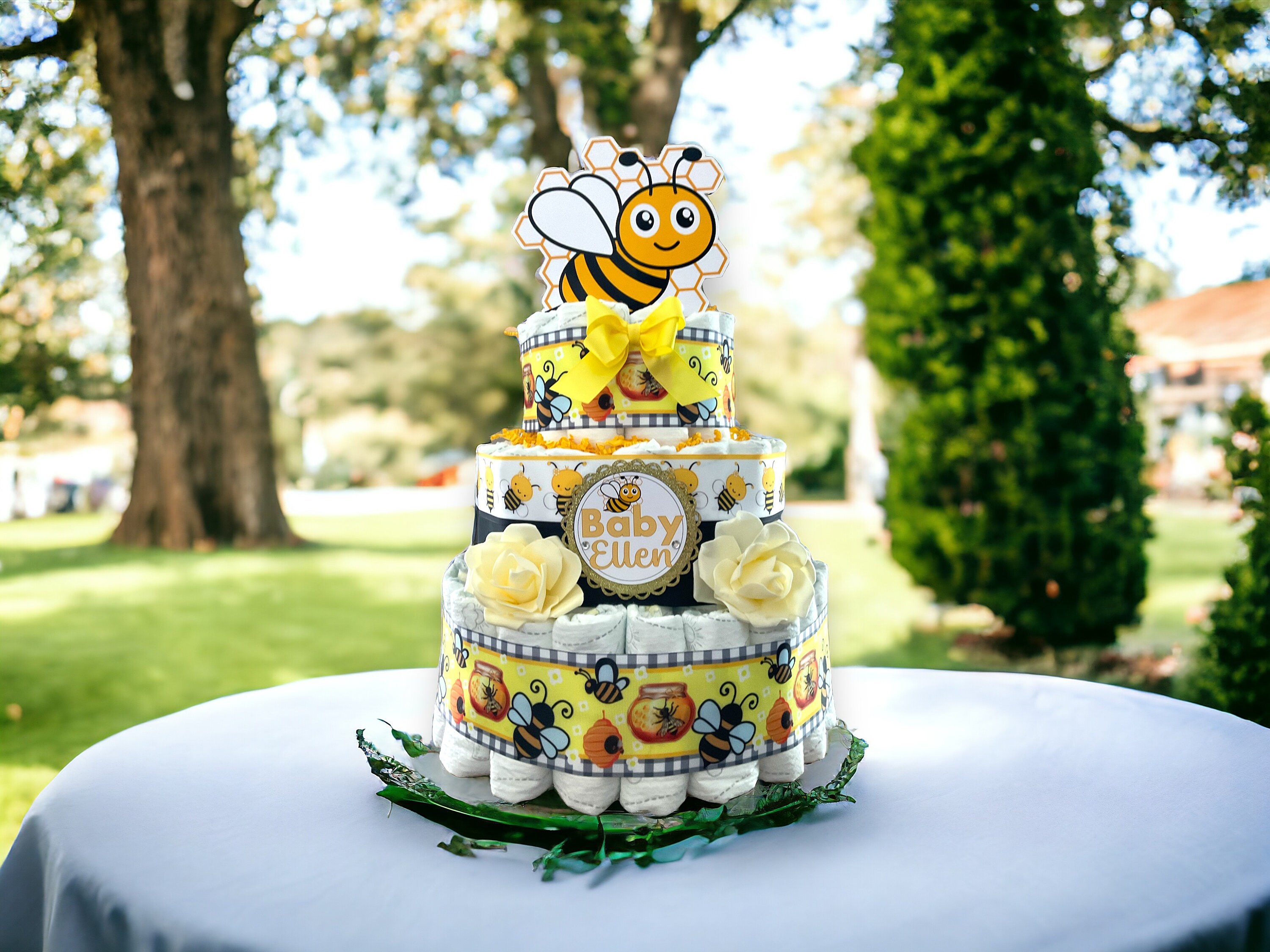 This Gorgeous Bumble Bee Diaper 3 Tiers Cake is the perfect centerpieces for your baby shower. We can match any shower theme.