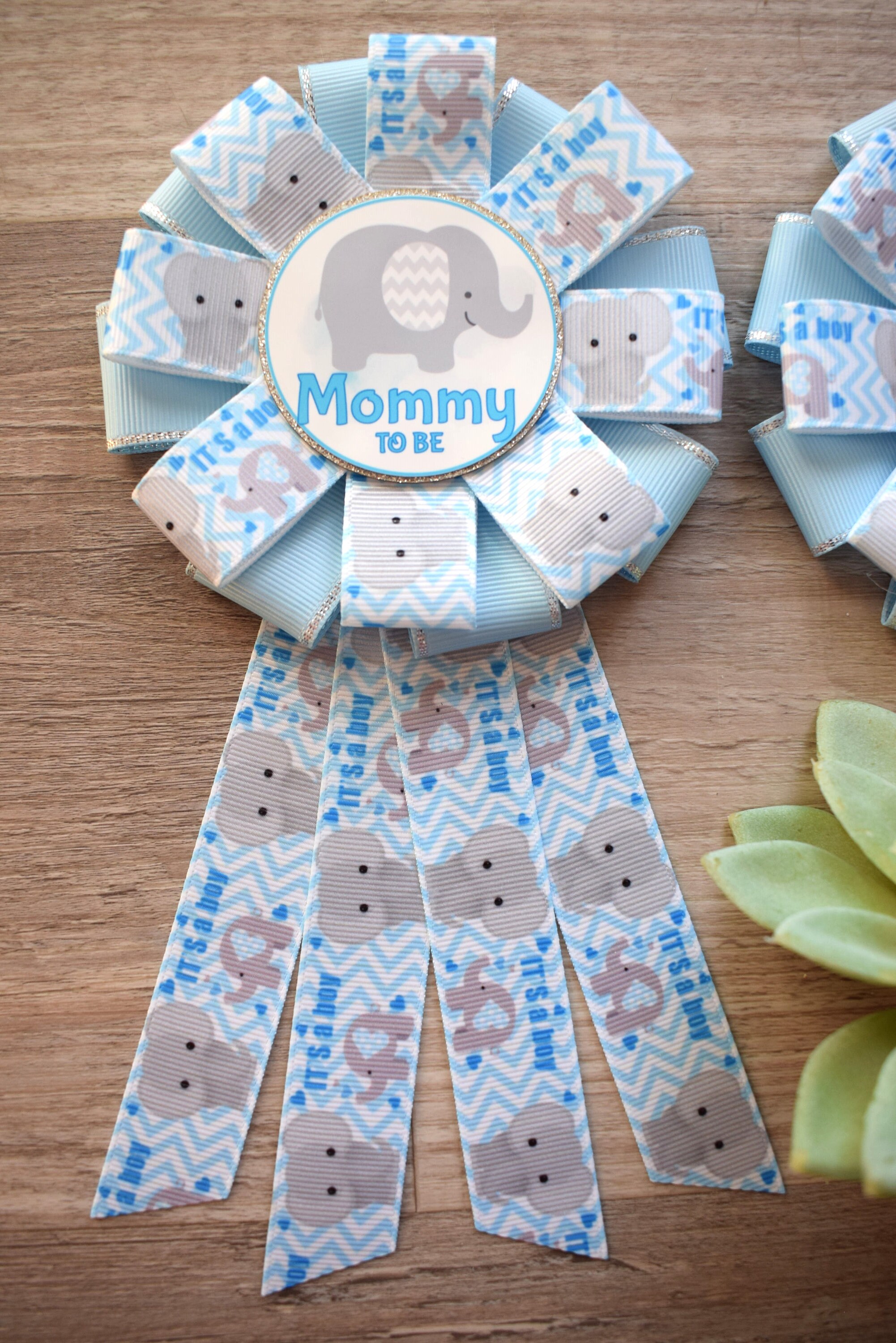 Boy Elephant Baby Shower, Blue Grey Elephant Mommy To Be Ribbon Pin, Daddy To Be Pin