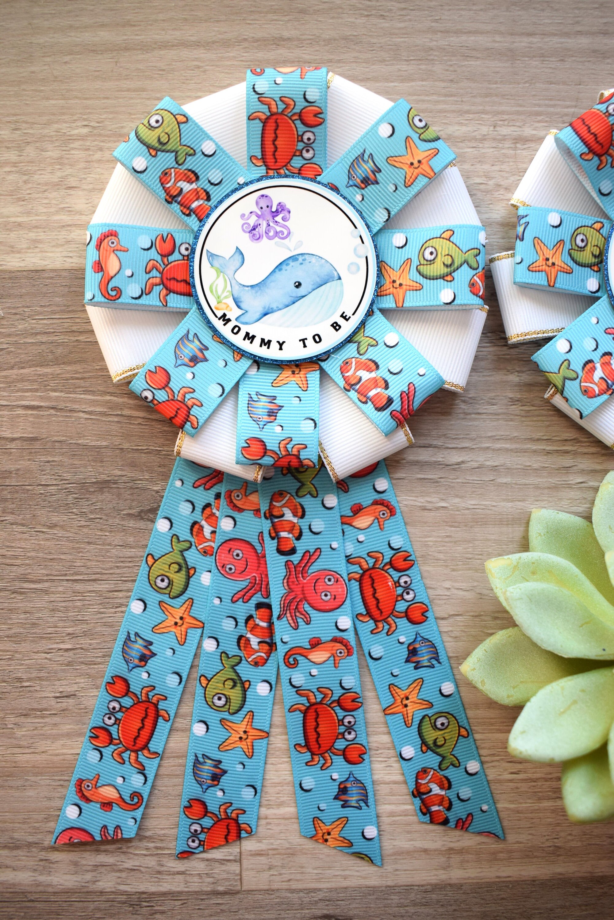 Under The Sea Baby Shower, Turtle Octopus Starfish Aqua Blue Mommy To Be Ribbon Pin, Under The Sea Daddy To Be Badge