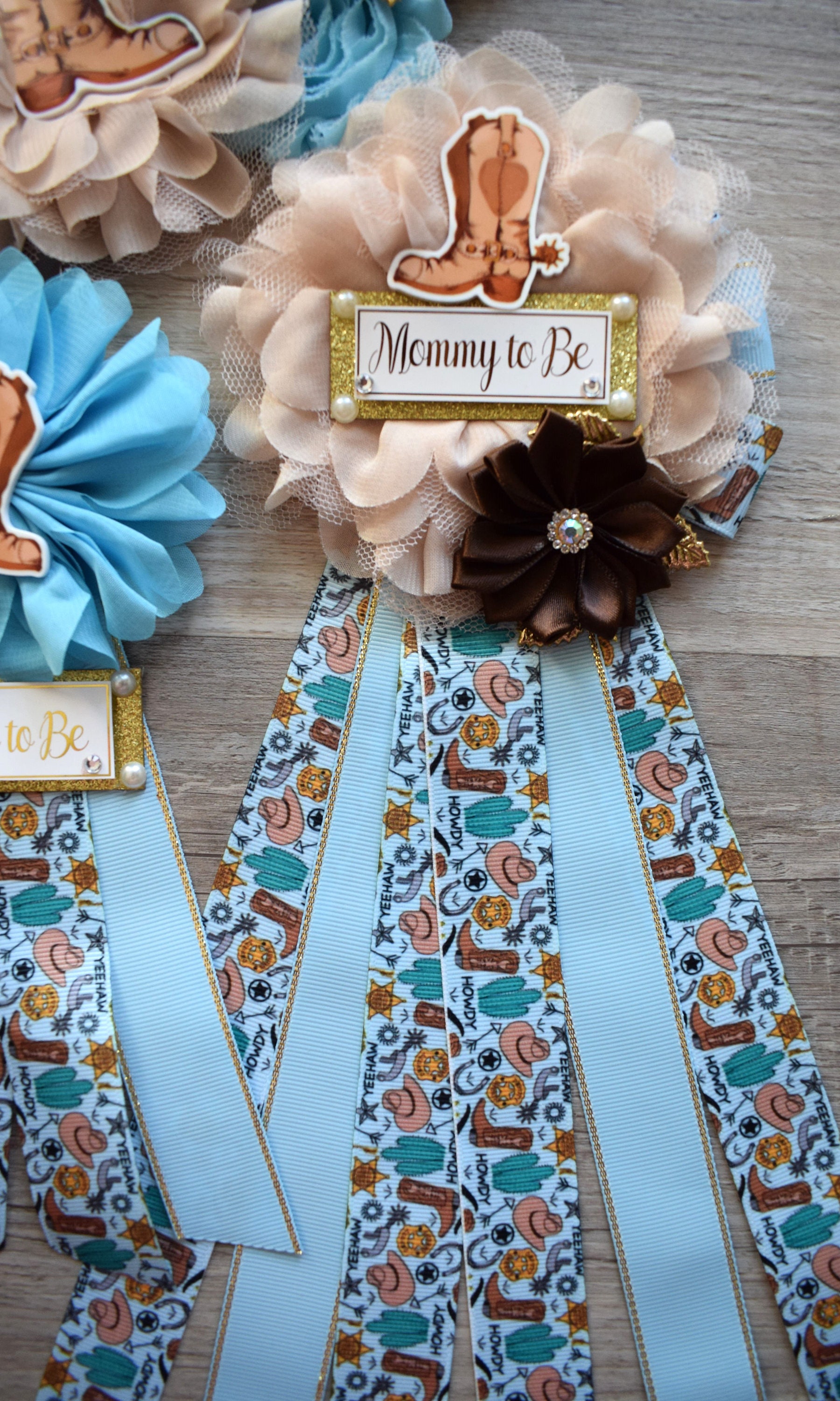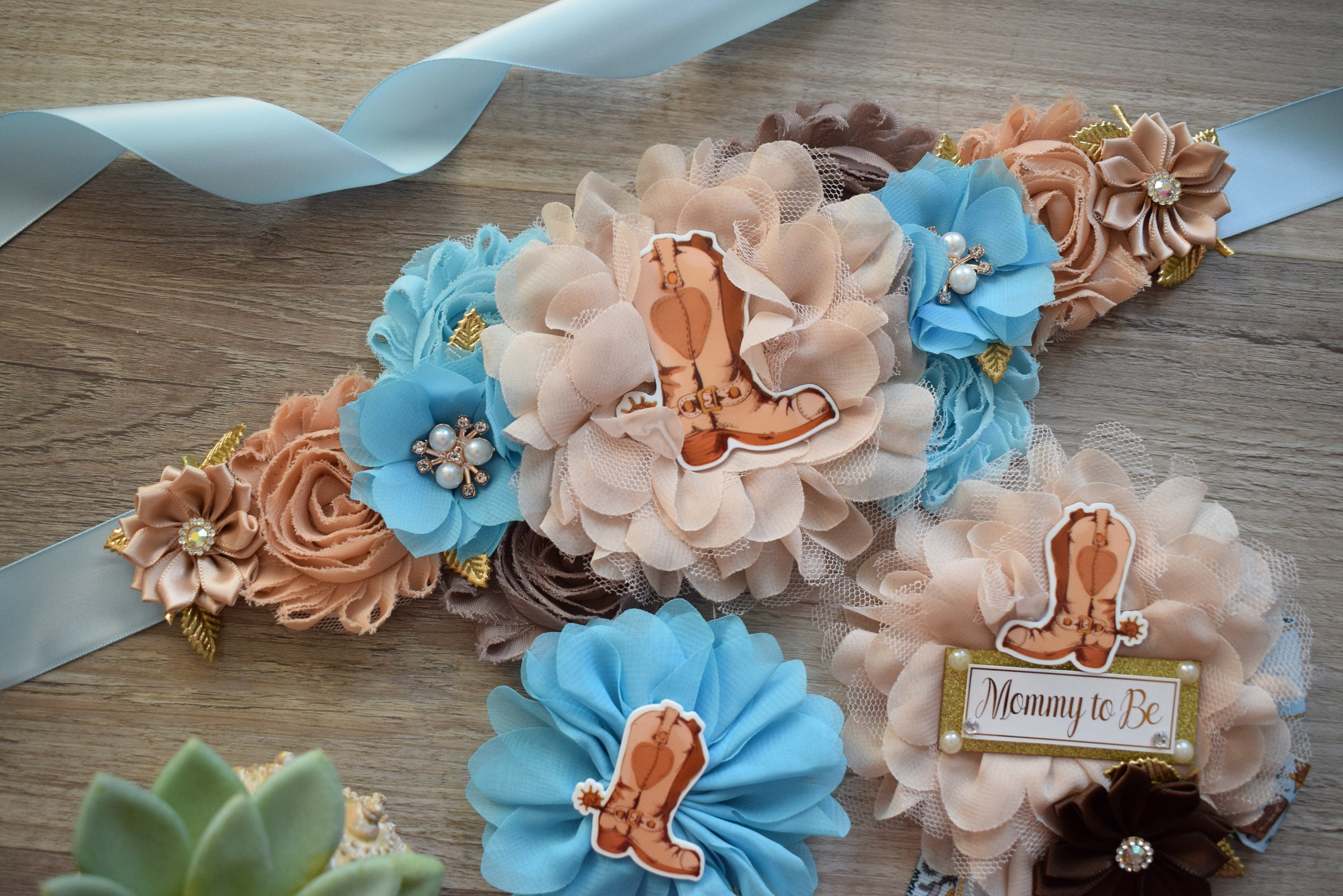 Cowboy Baby Shower, Blue Cowboy Maternity Sash, Boy Cowboy Mommy and Daddy To Be Pin, Blue Brown Flower Sash, Blue Boot Hat Corsage Pin