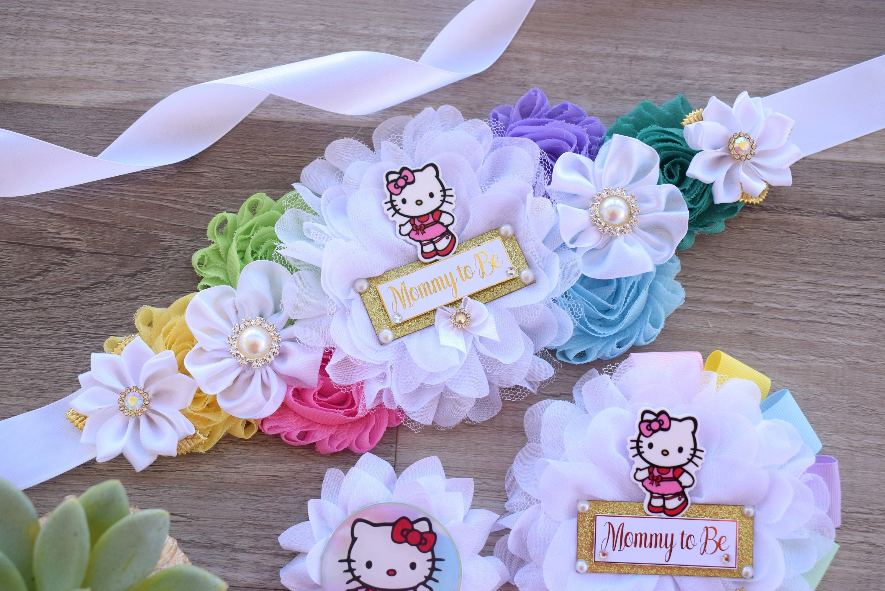 * Maternity Sash: This sash has eleven flowers in Blue, Yellow, Turquoise, Lavender, Green & White colors embellished with rhinestones and pearls. The ribbon sash is 80'' (2 meters) long.