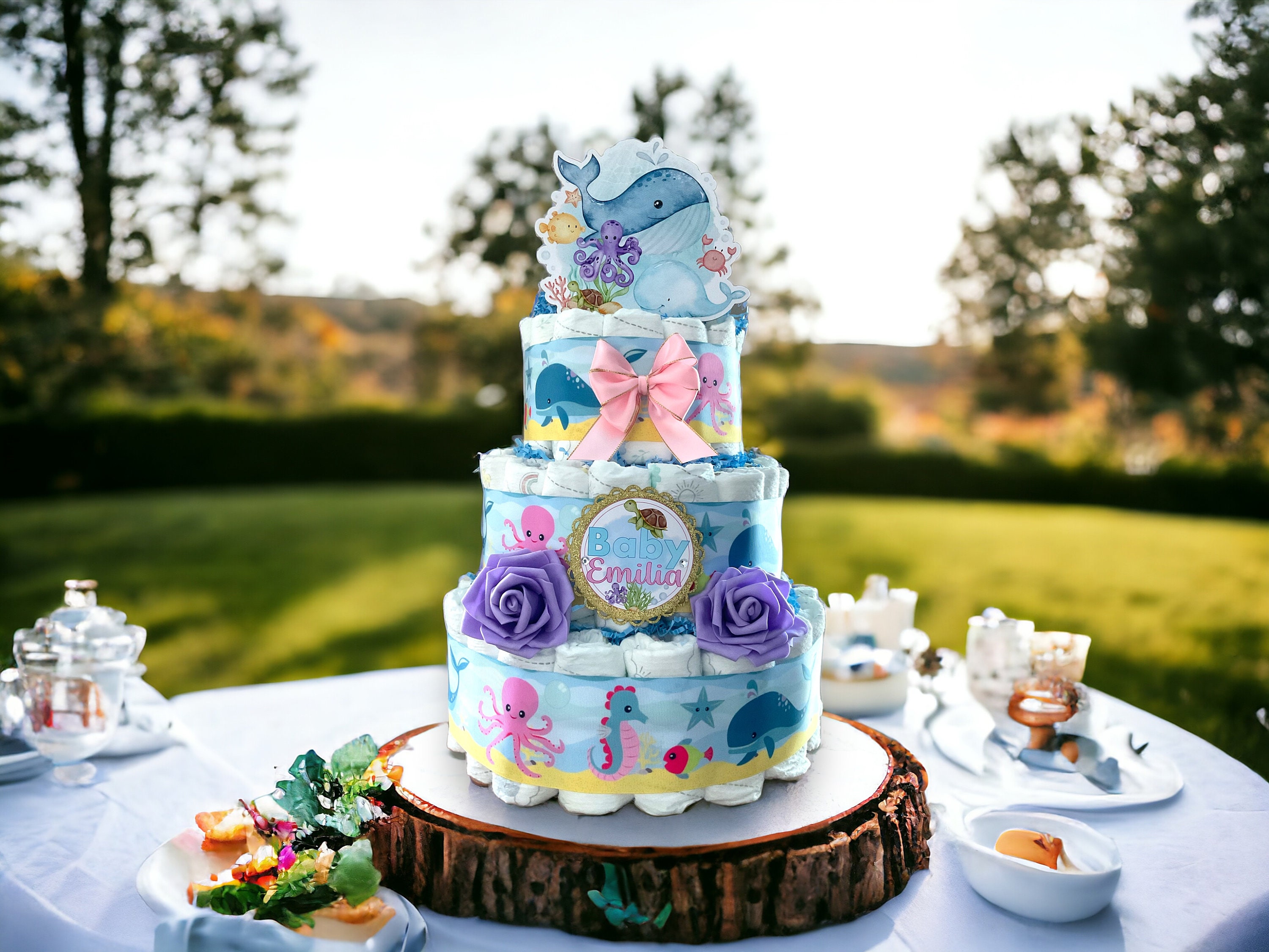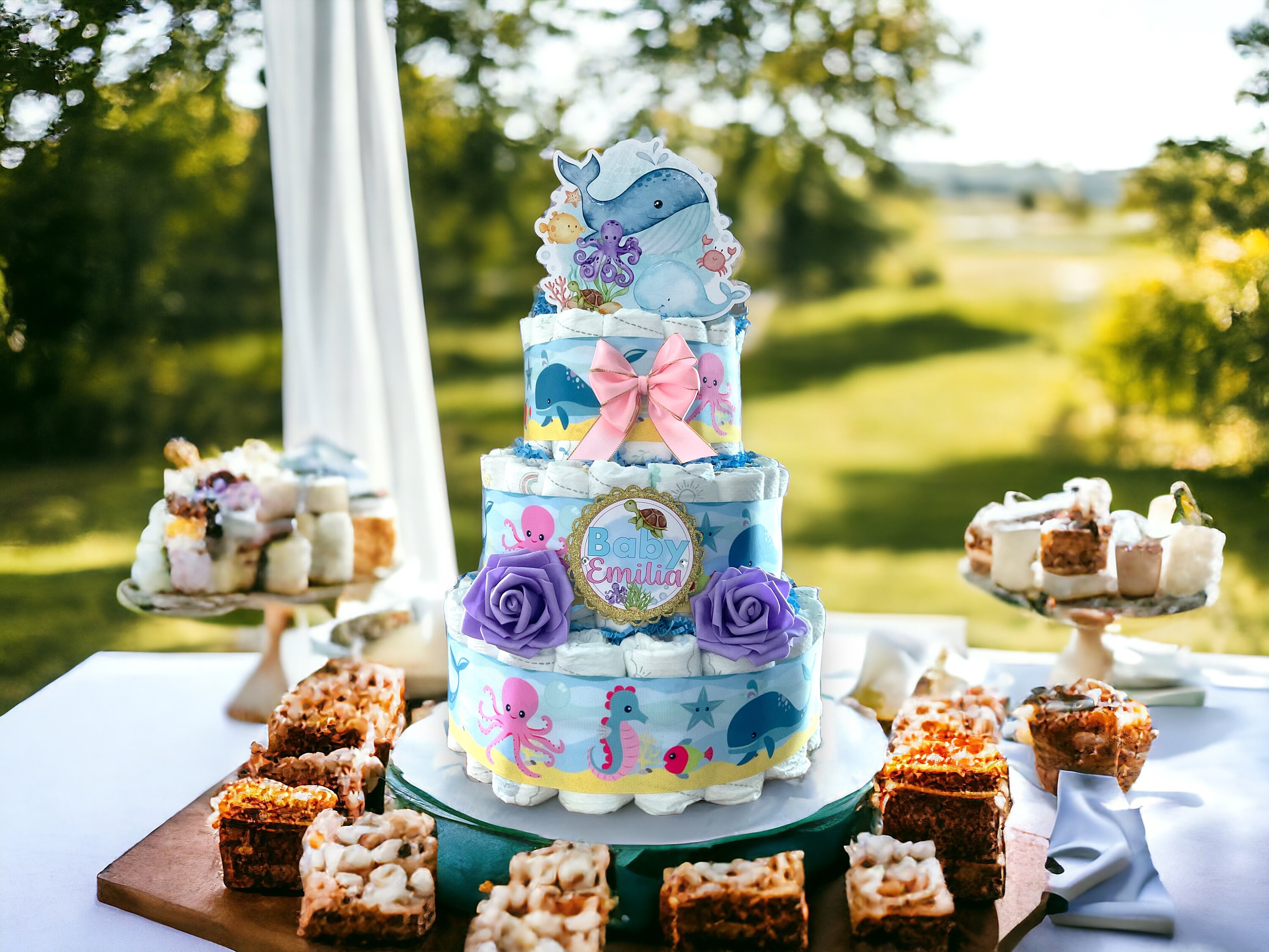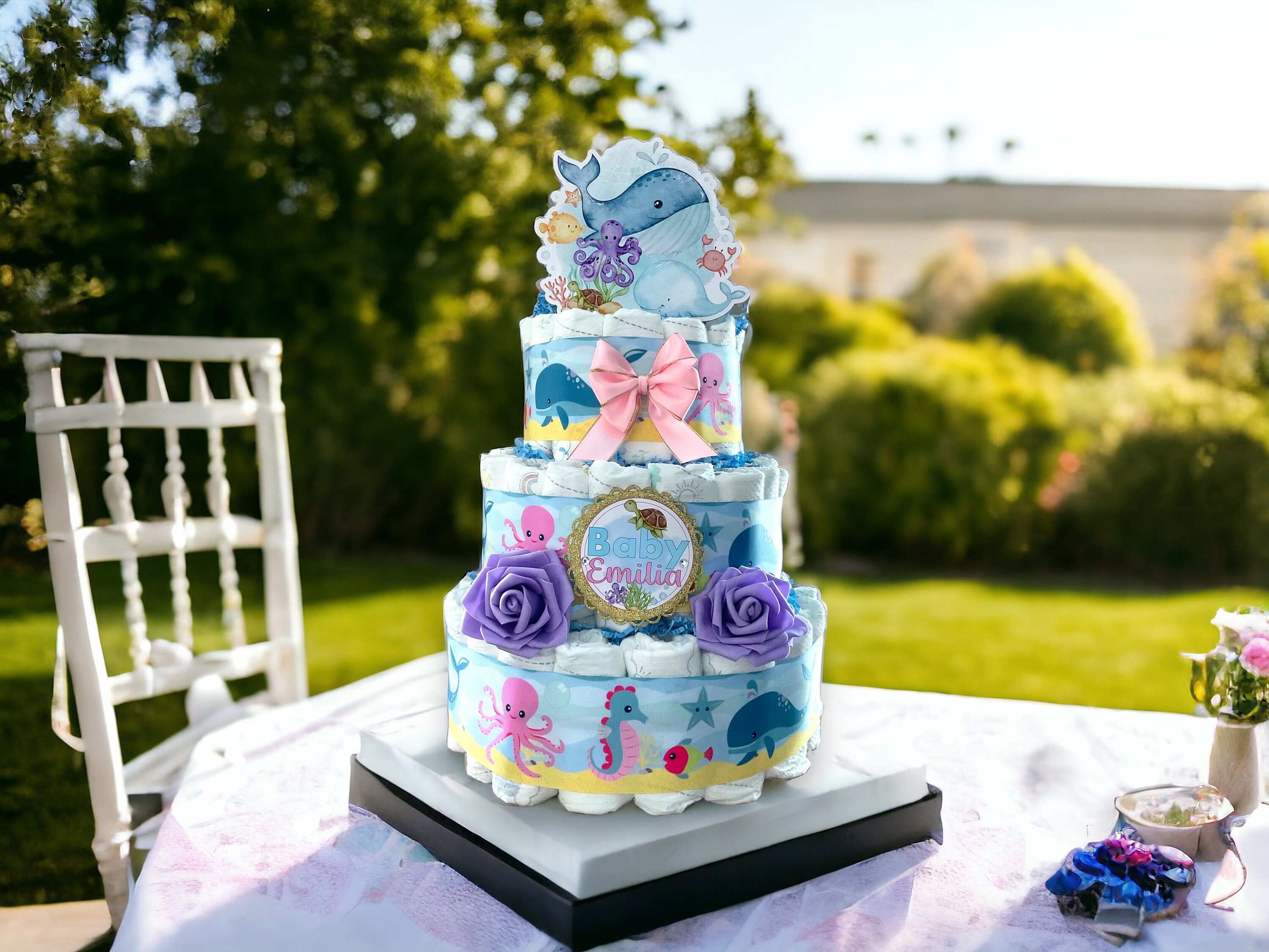 This Gorgeous Under The Sea Diaper Cakes are the perfect centerpieces for your baby shower. We can match any shower theme.