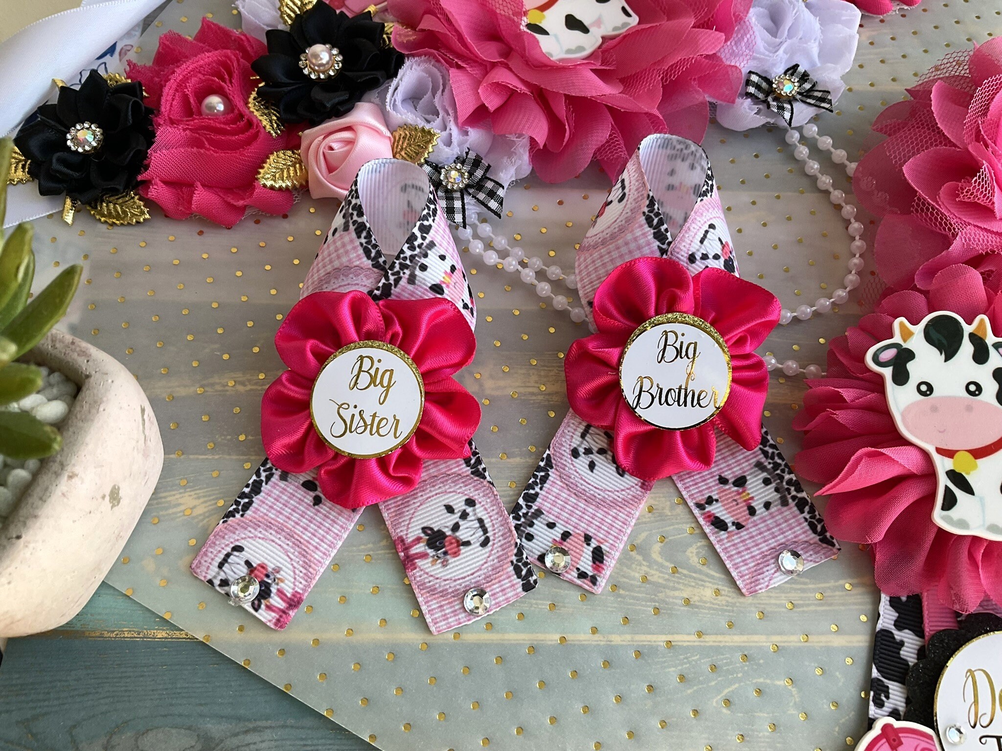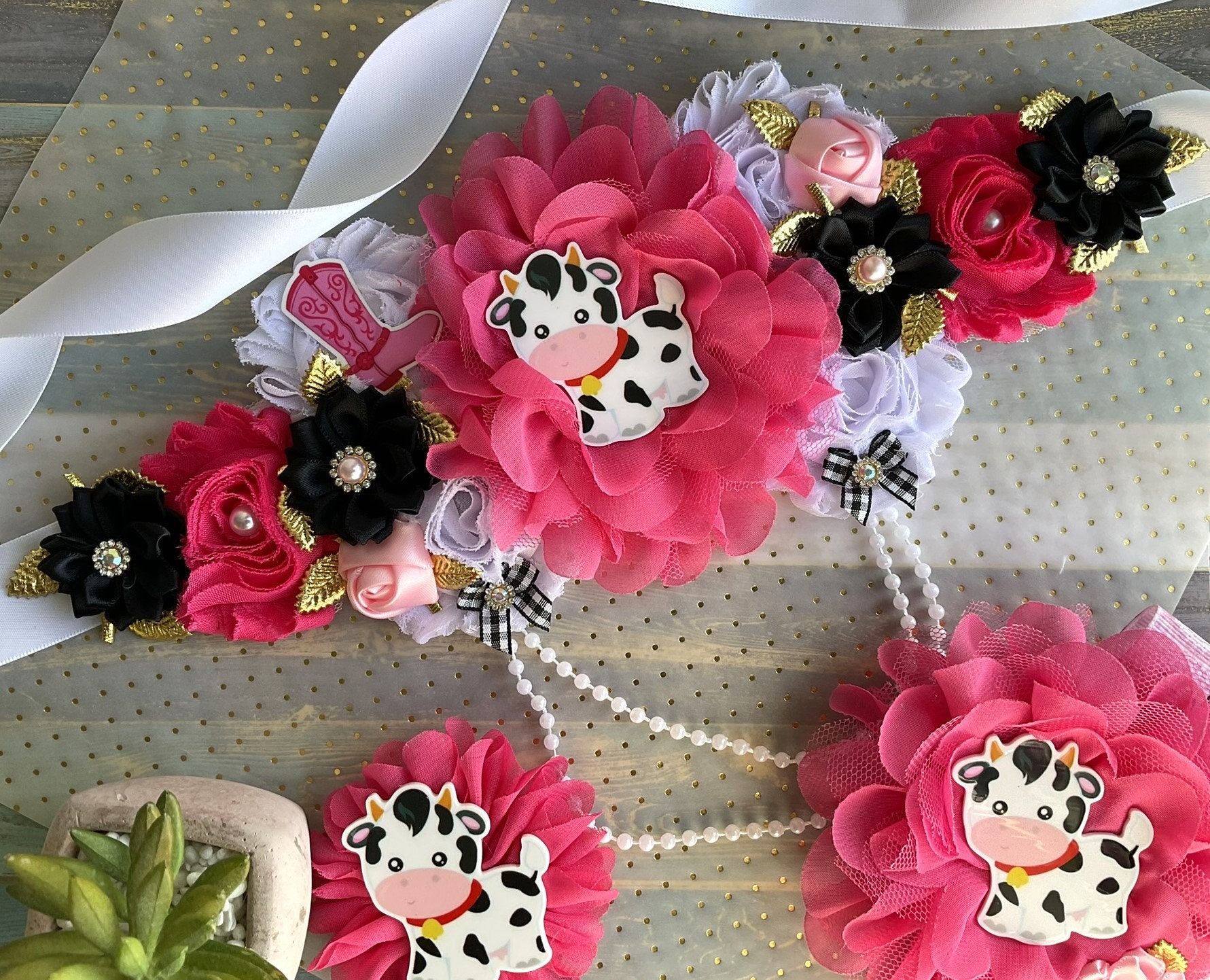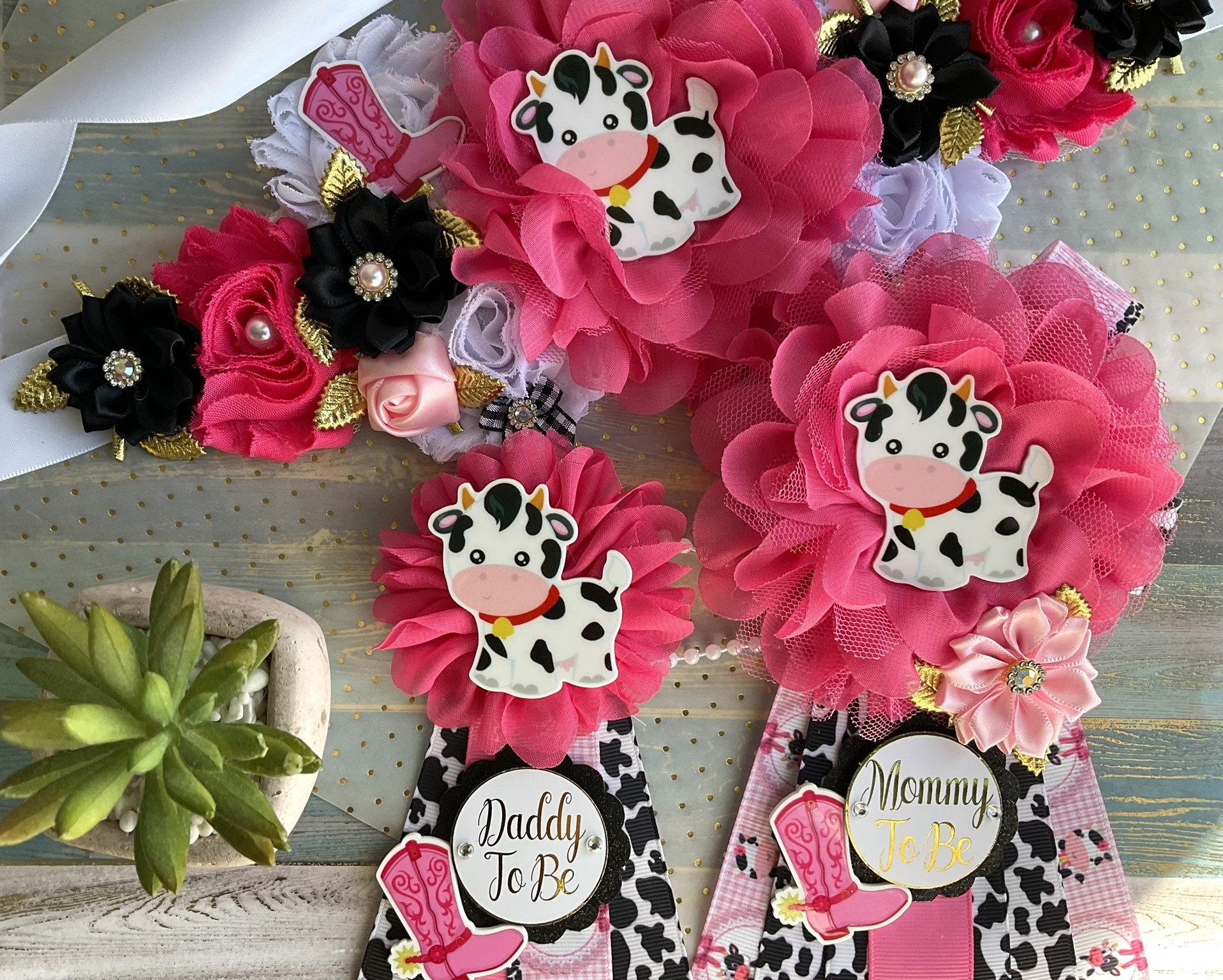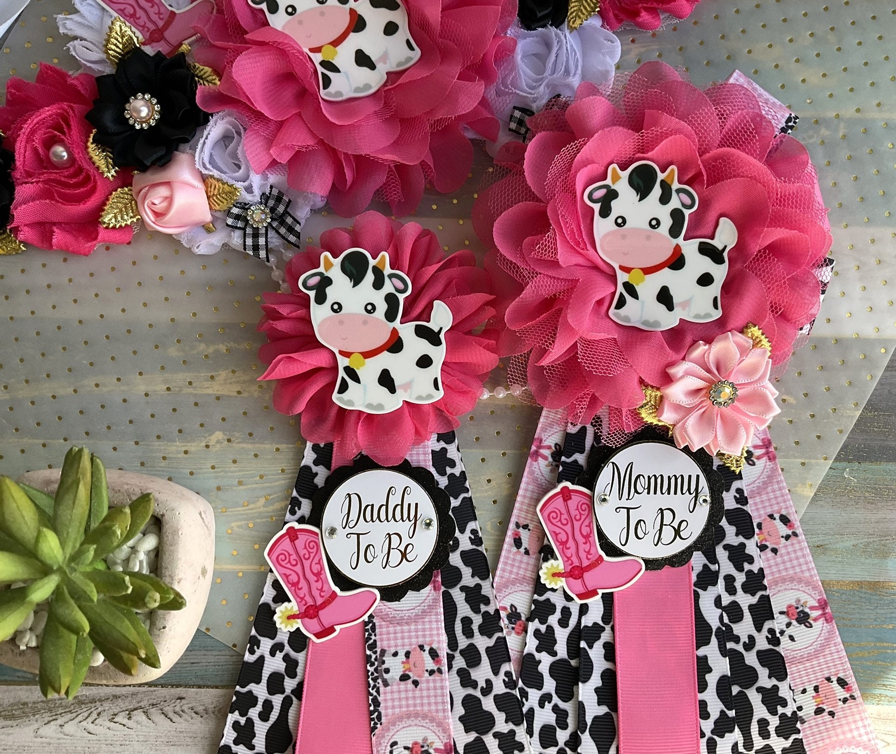 Disco Cowgirl Baby Shower, Cowgirl Maternity Sash, Girl Farm Mommy To Be Ribbon, Daddy To Be Pin, Hot Pink Black White, Baby Shower Gift