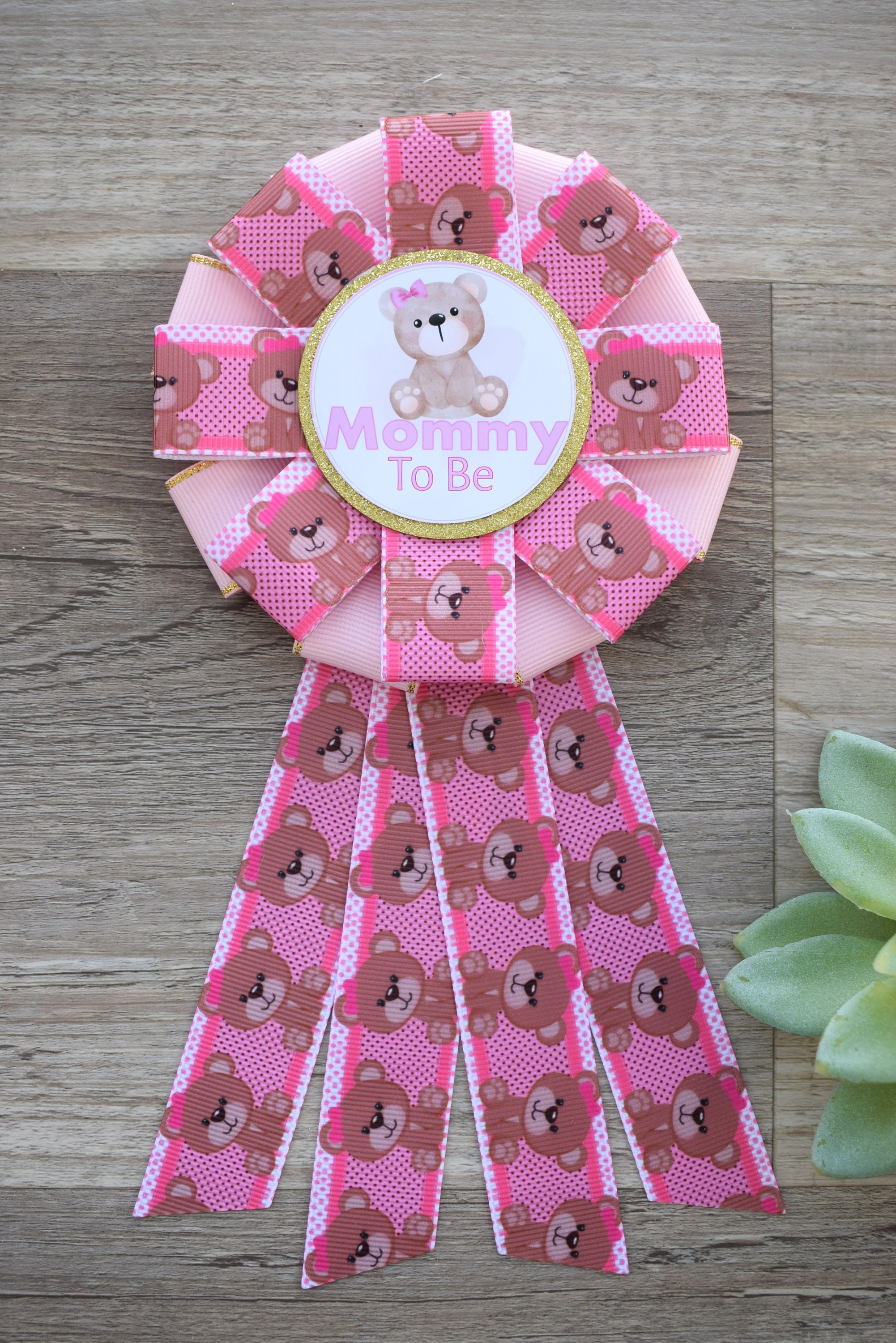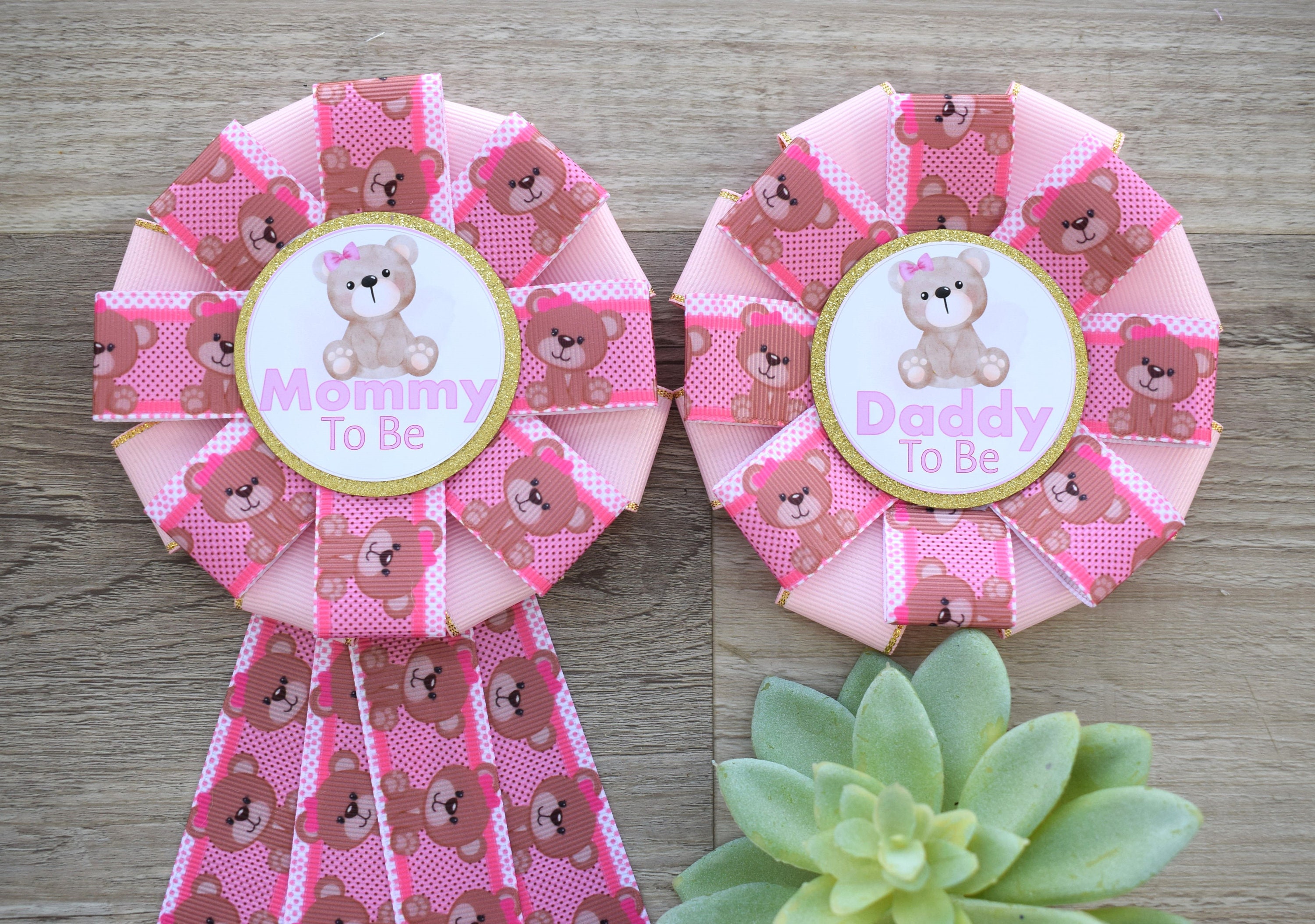 Girl Pink Teddy Bear Baby Shower, Girl Bear Mommy To Be Ribbon Pin, Teddy Bear Daddy To Be Pin, Parent's To Be Pins
