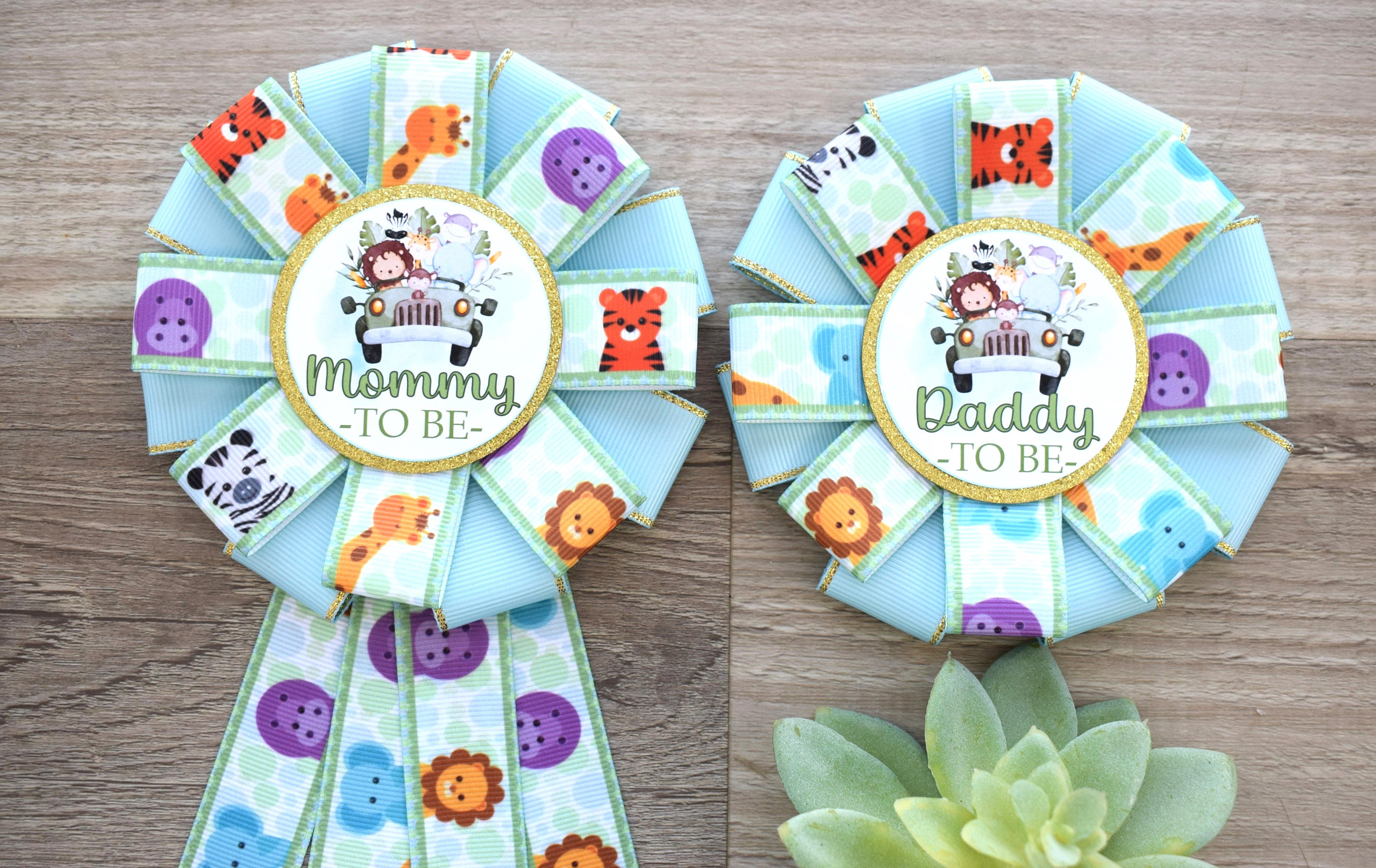 Baby Blue Jungle Safari Baby Shower, Safari Animal Mommy To Be Ribbon Pin, Animal Daddy To Be Badge Pin, Parent's To Be Pins