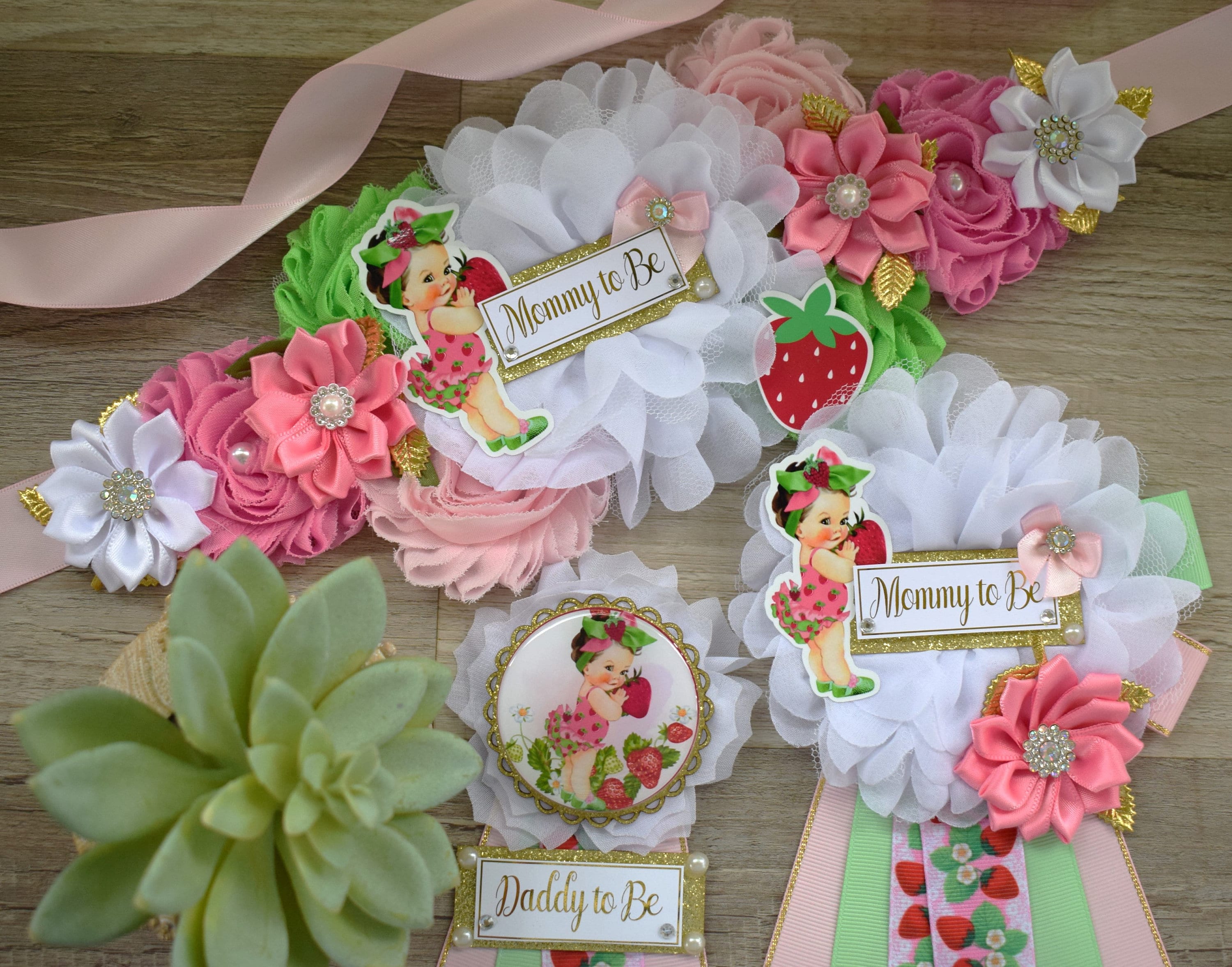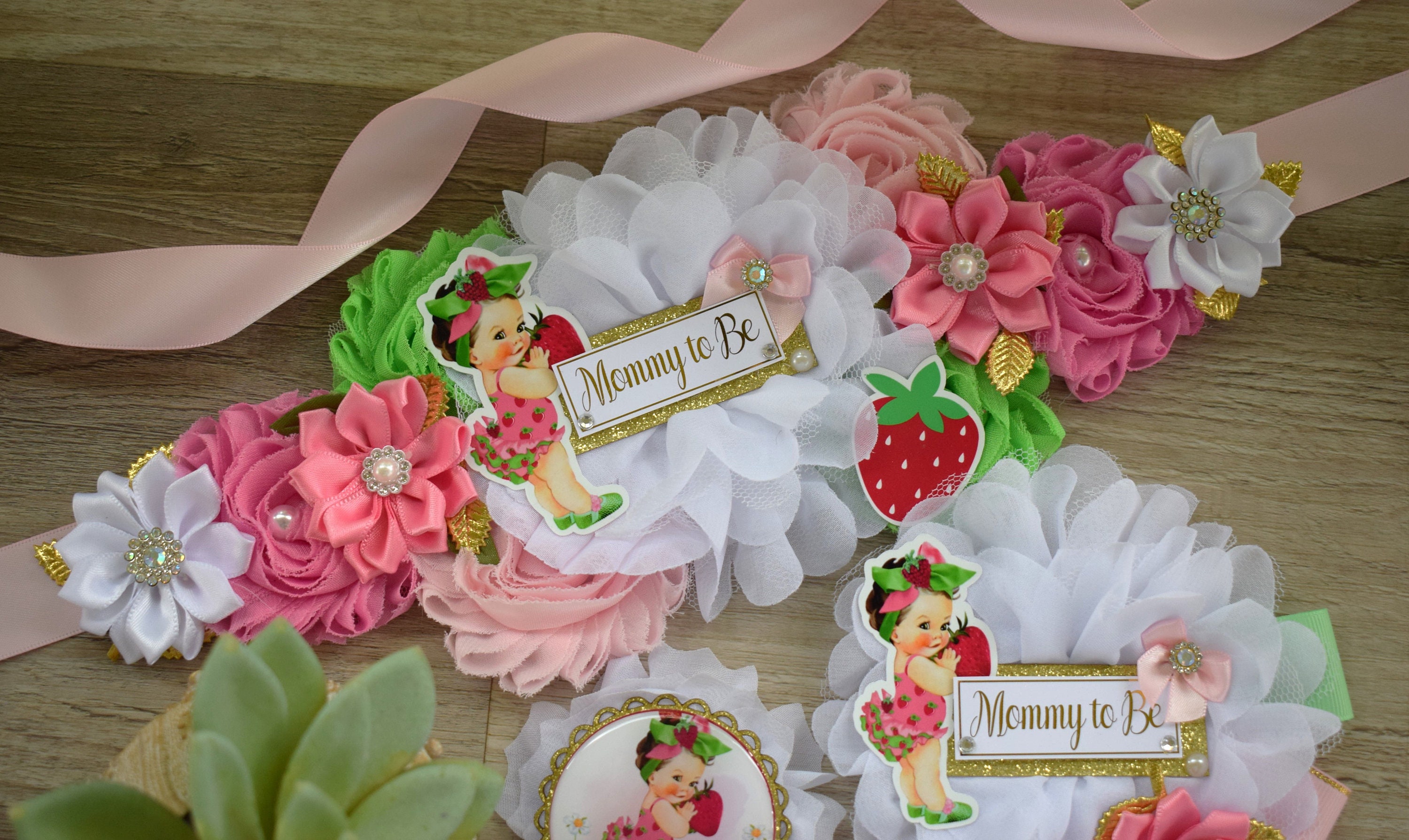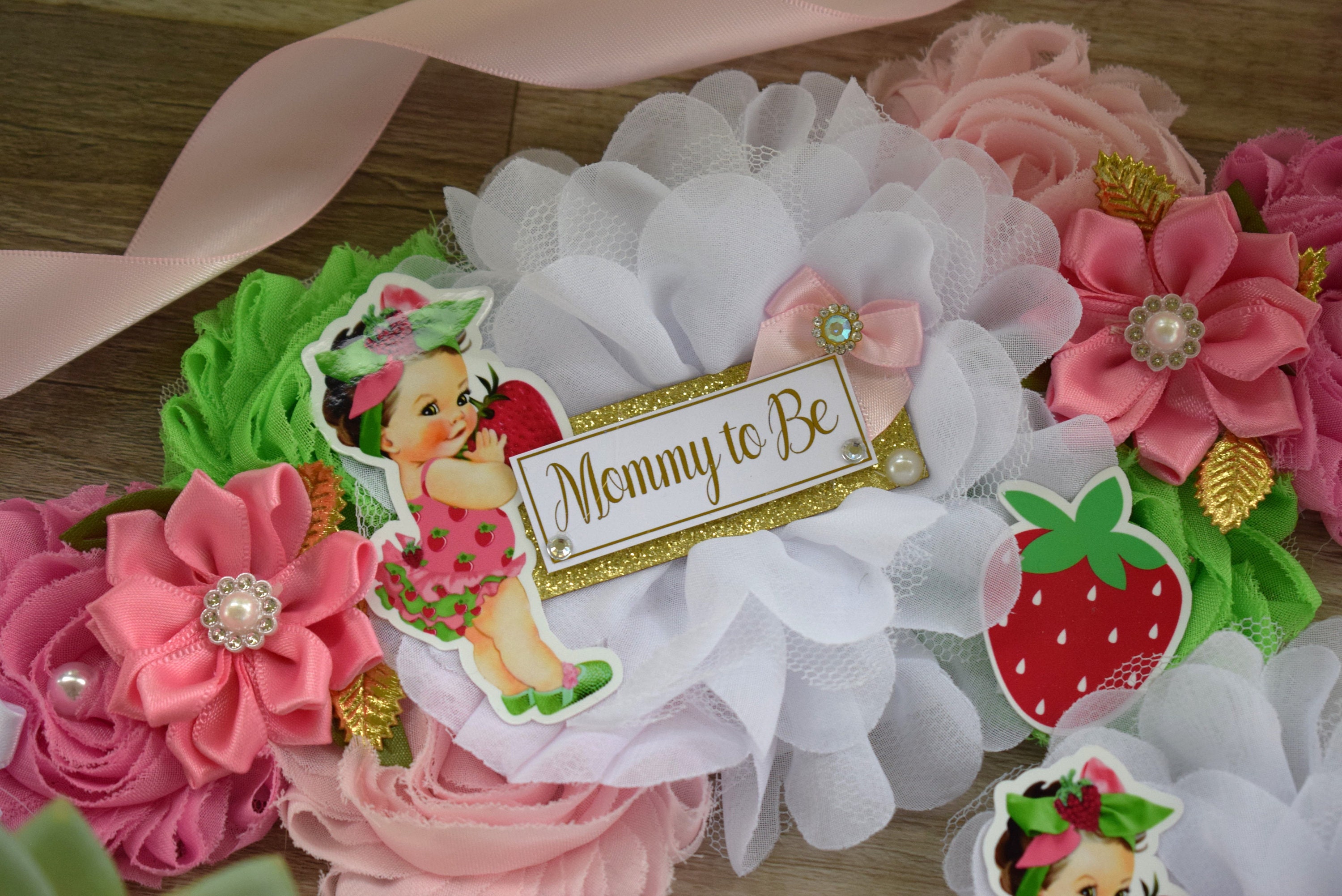 This Strawberry Sash & Pin Set was made especially for a Baby Shower or a Photo Prop.