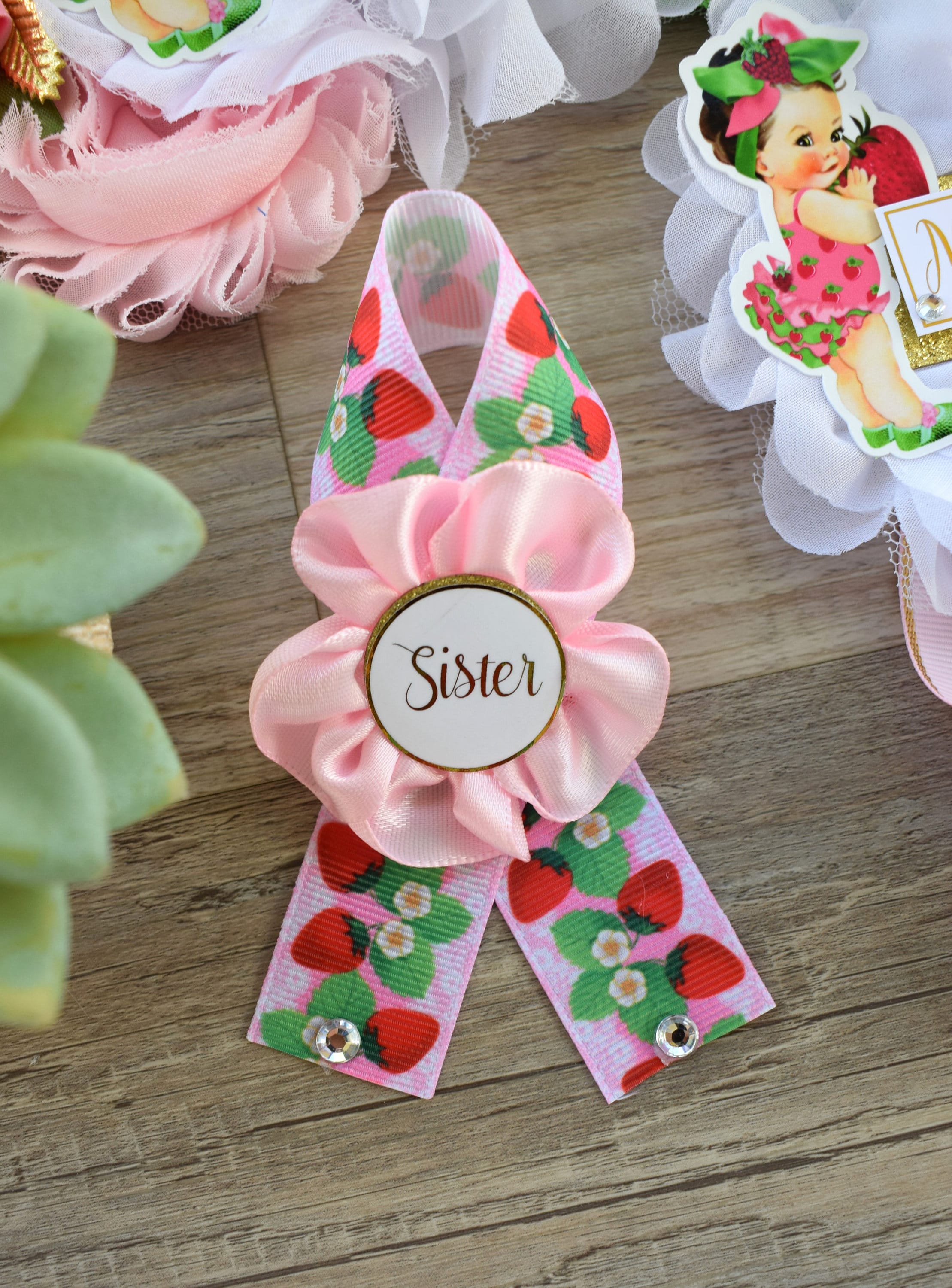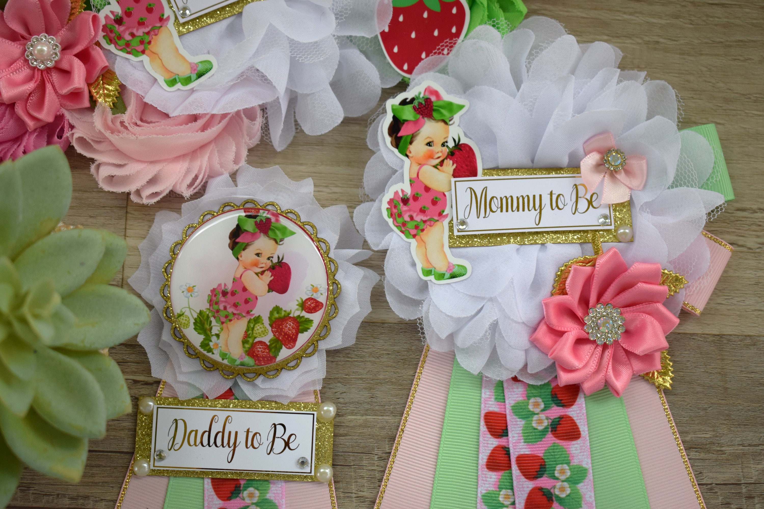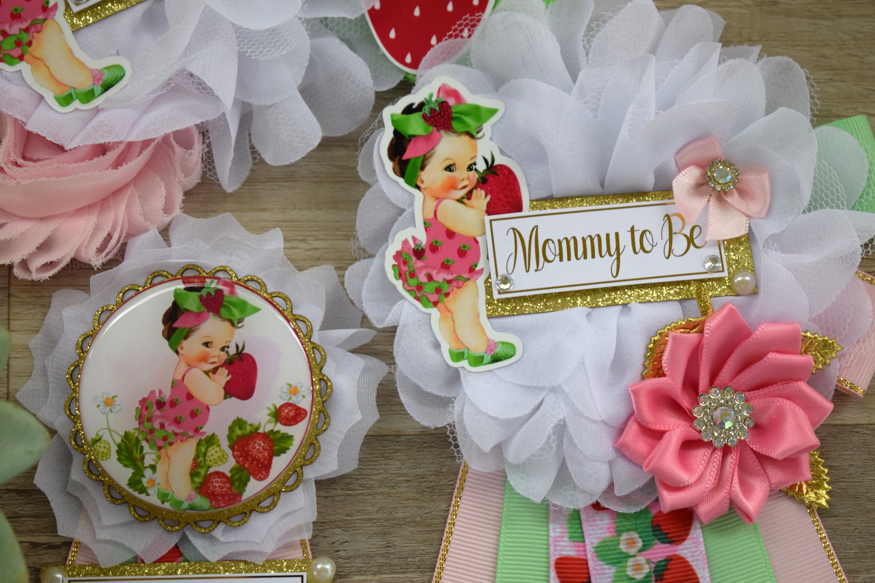This Strawberry Sash & Pin Set was made especially for a Baby Shower or a Photo Prop.