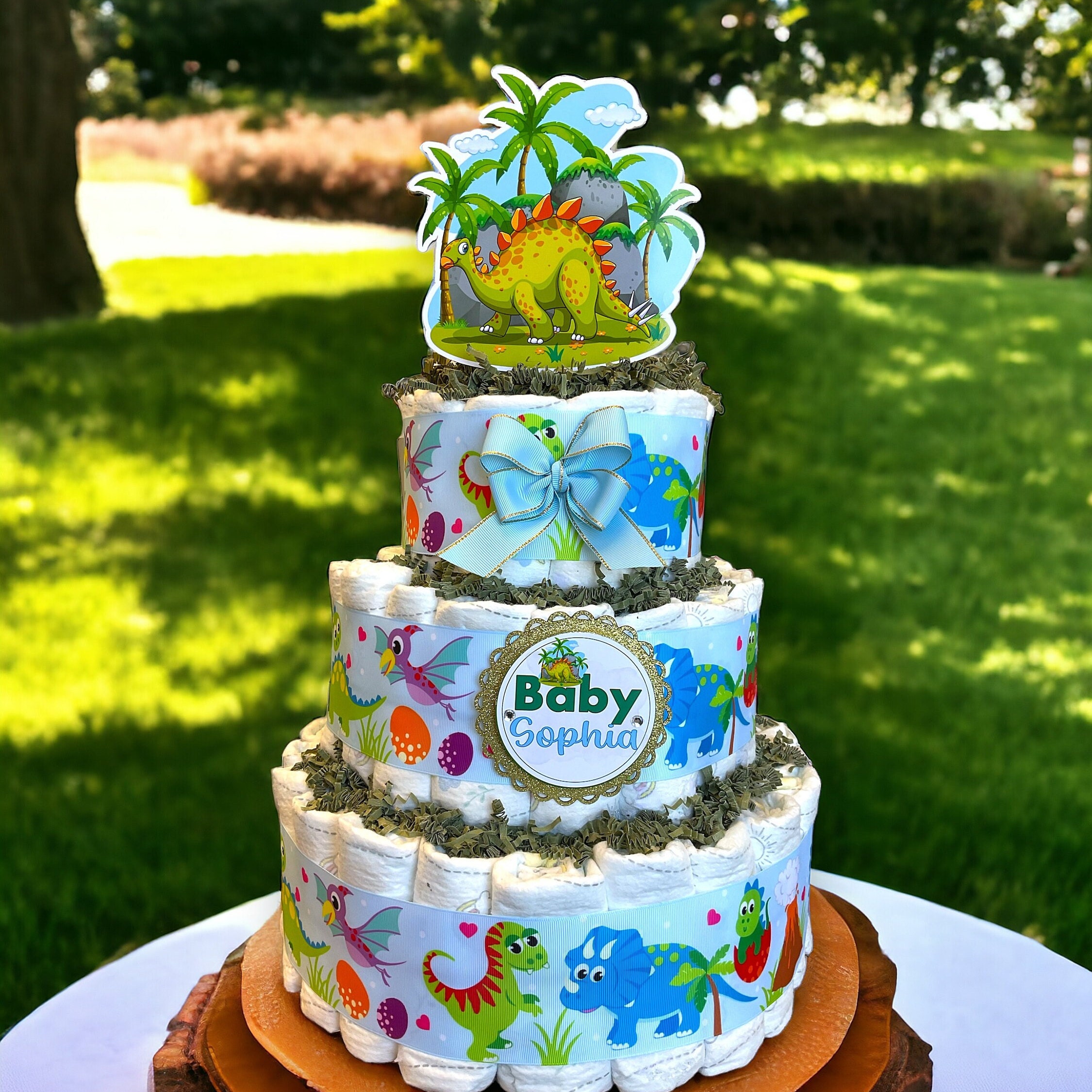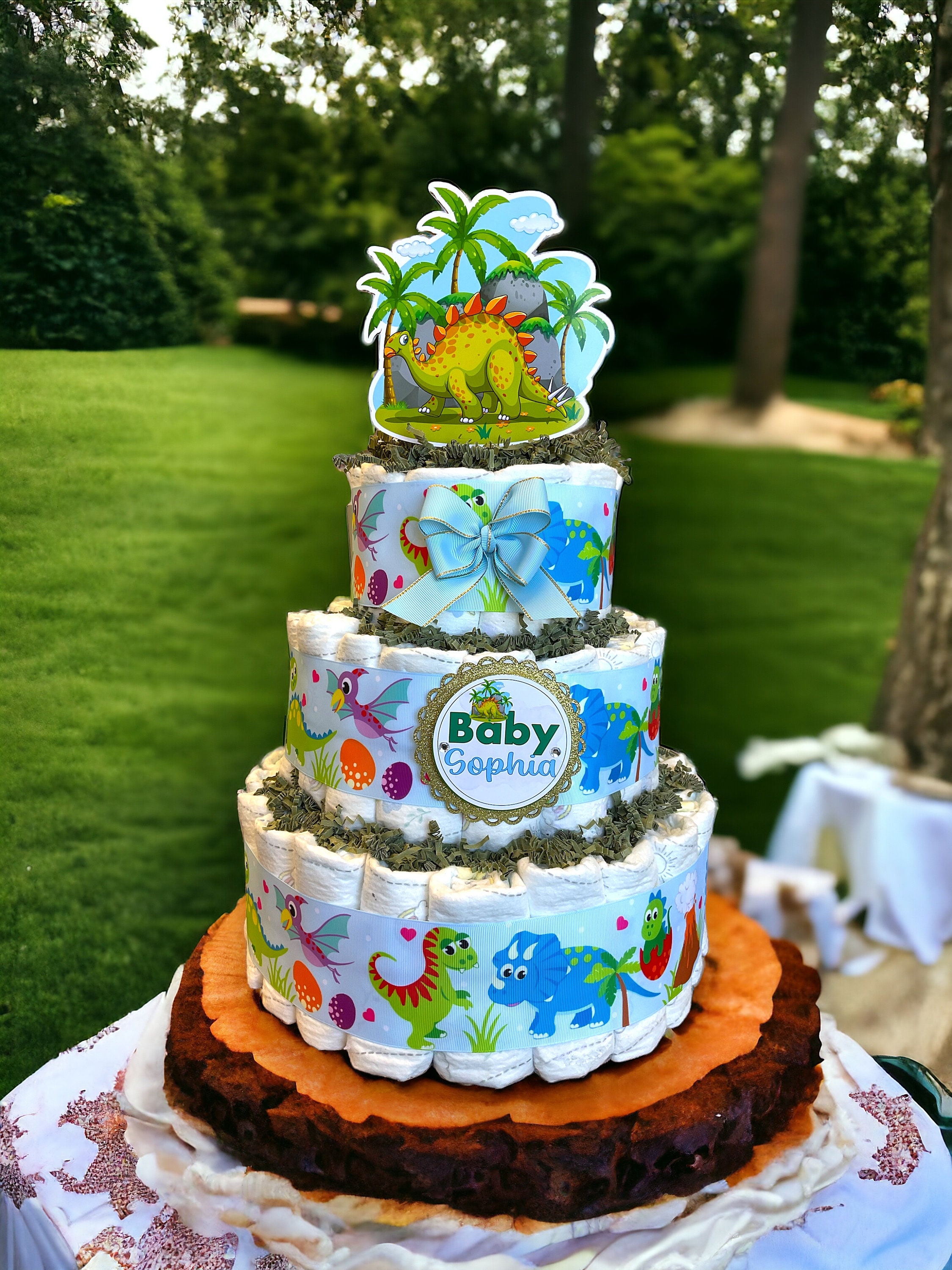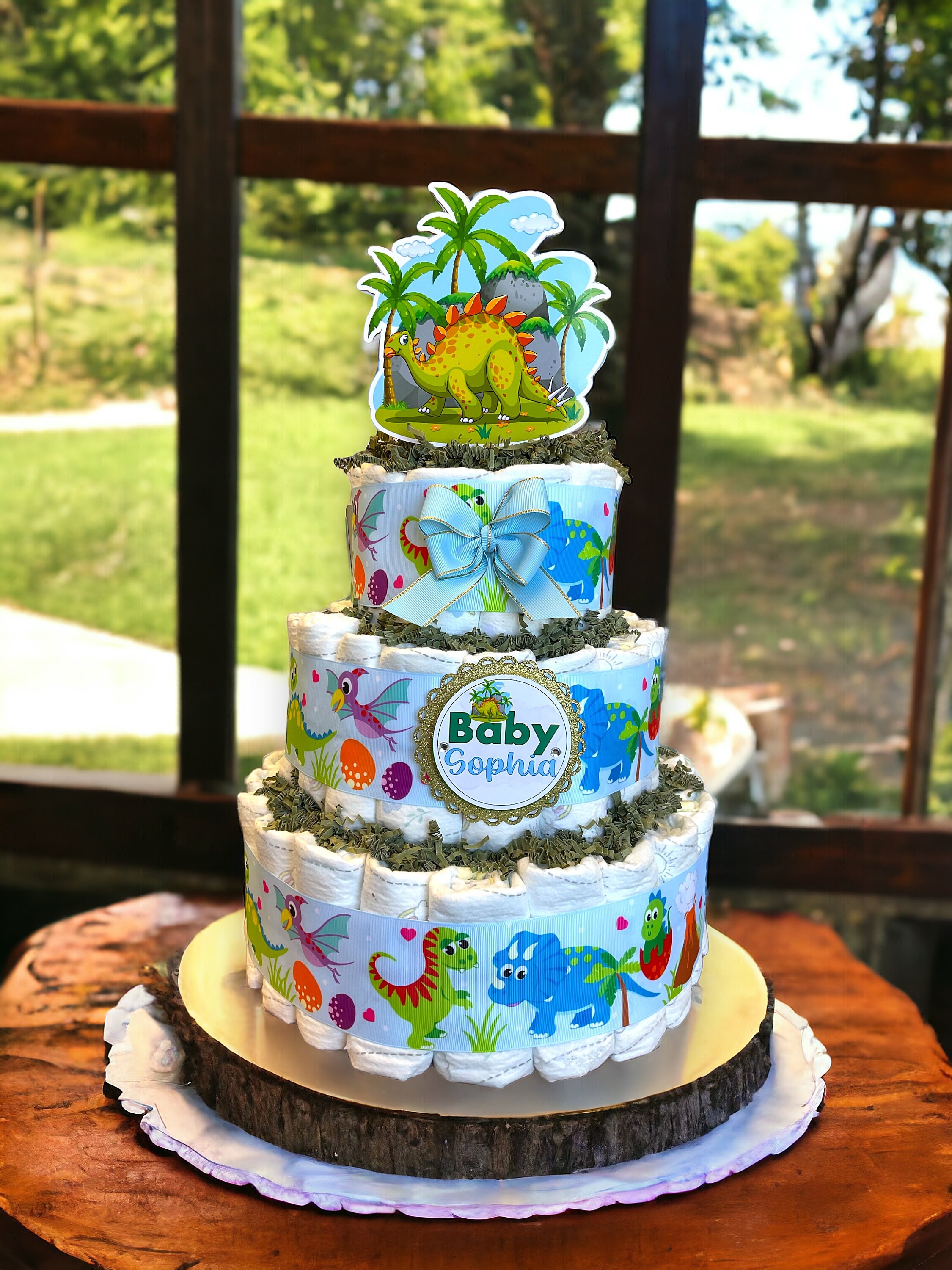 This Gorgeous Dinosaur Diaper 3 Tiers Cake are the perfect centerpieces for your baby shower. We can match any shower theme.