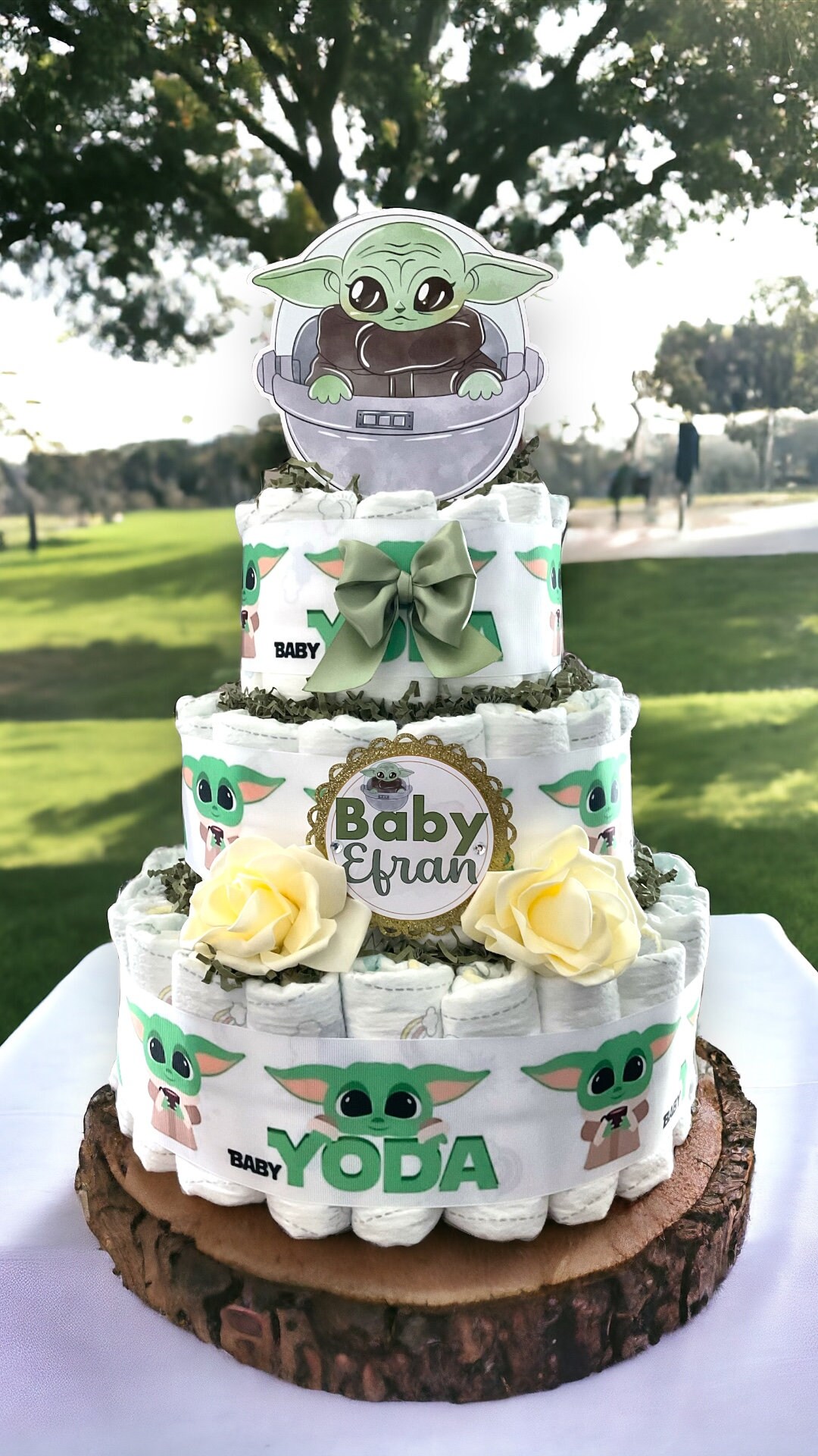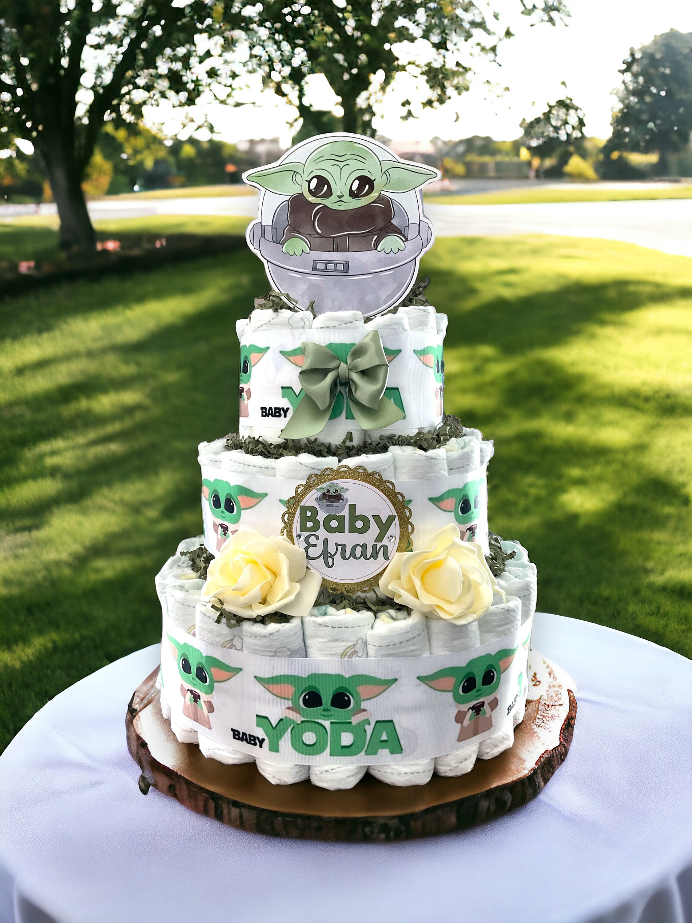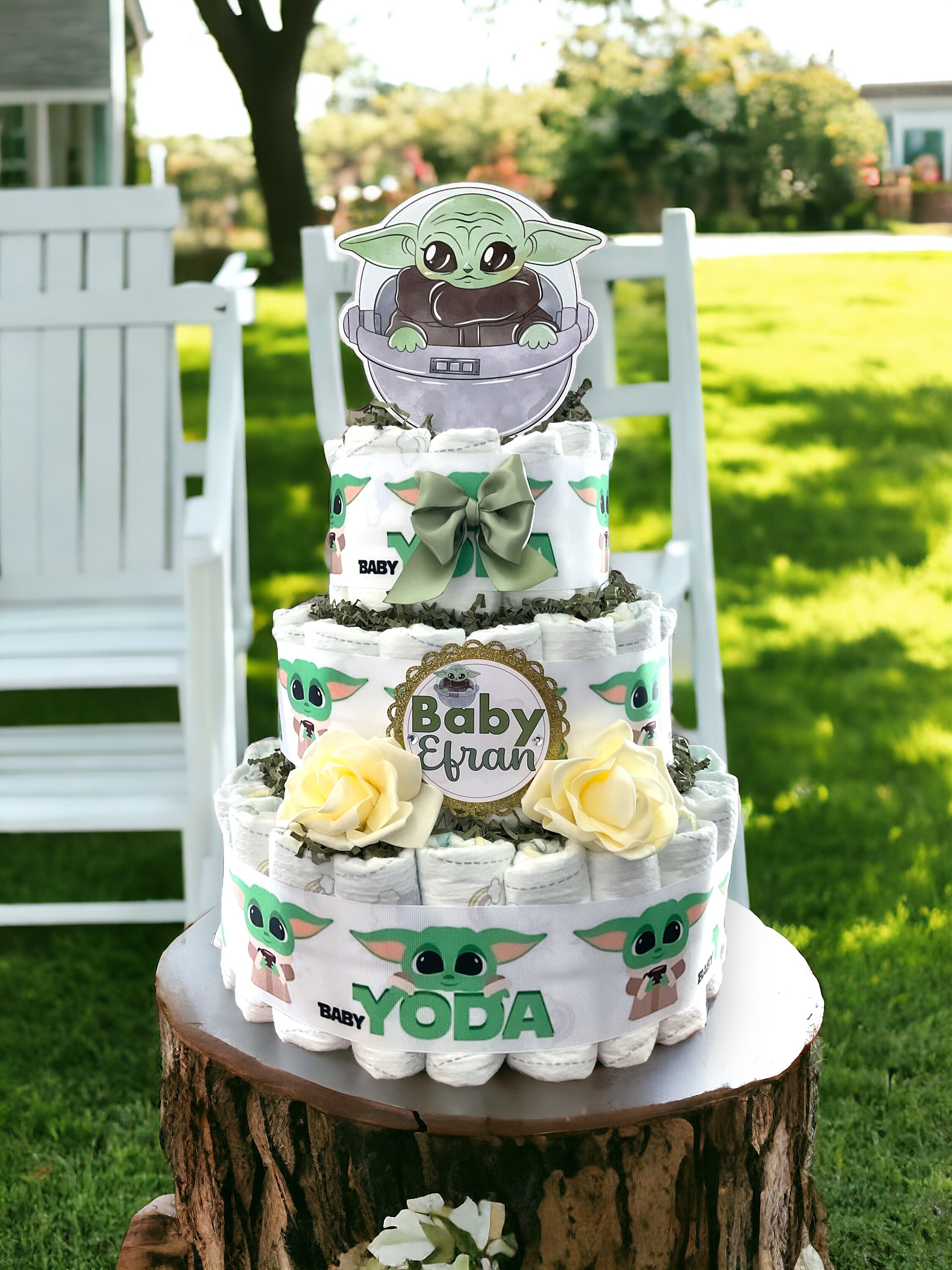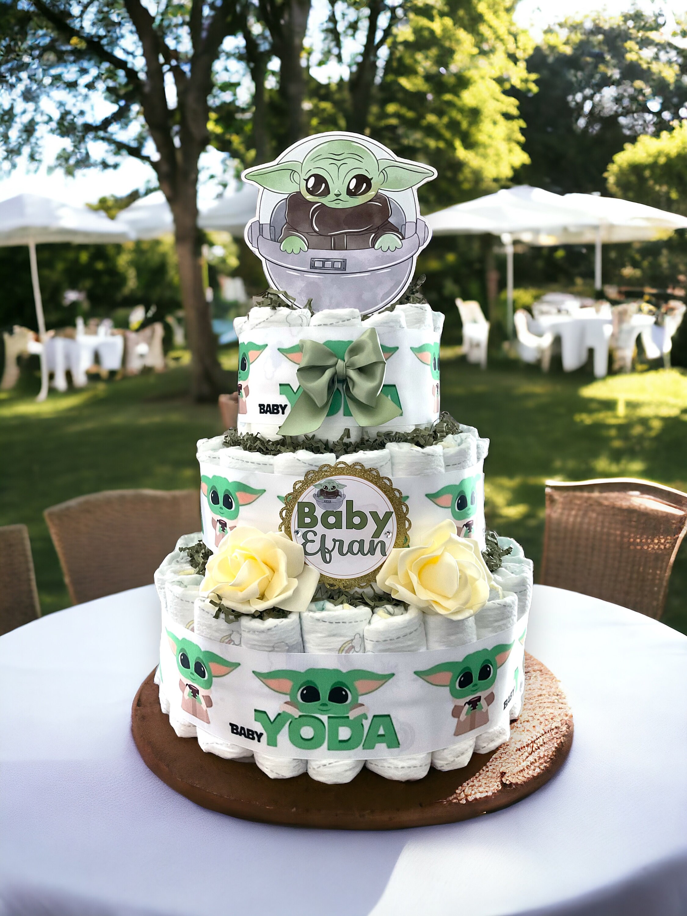 Green Ivory Baby Shower Diaper Cake, 3 Tier Diaper Cake Centerpieces Decor, Yoda Baby Shower, Room Nursery Decor, New Mom Gifts - S00023
