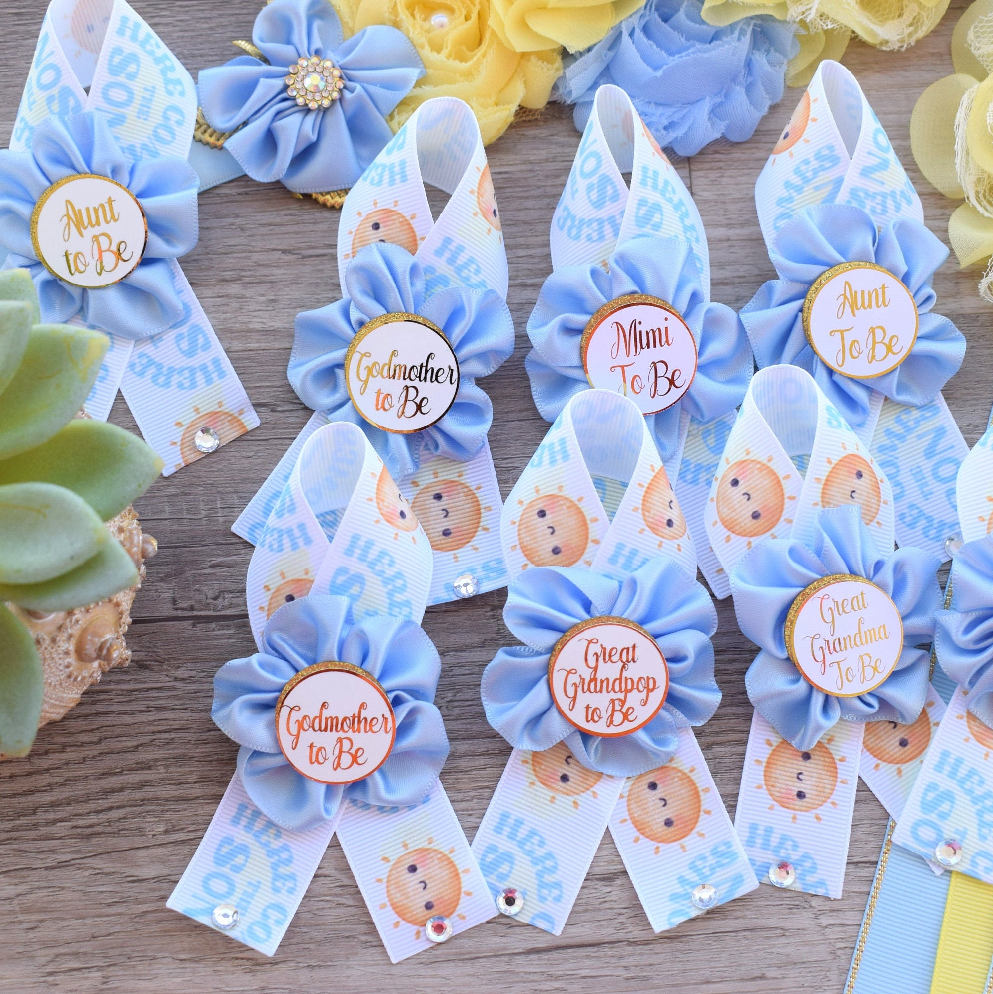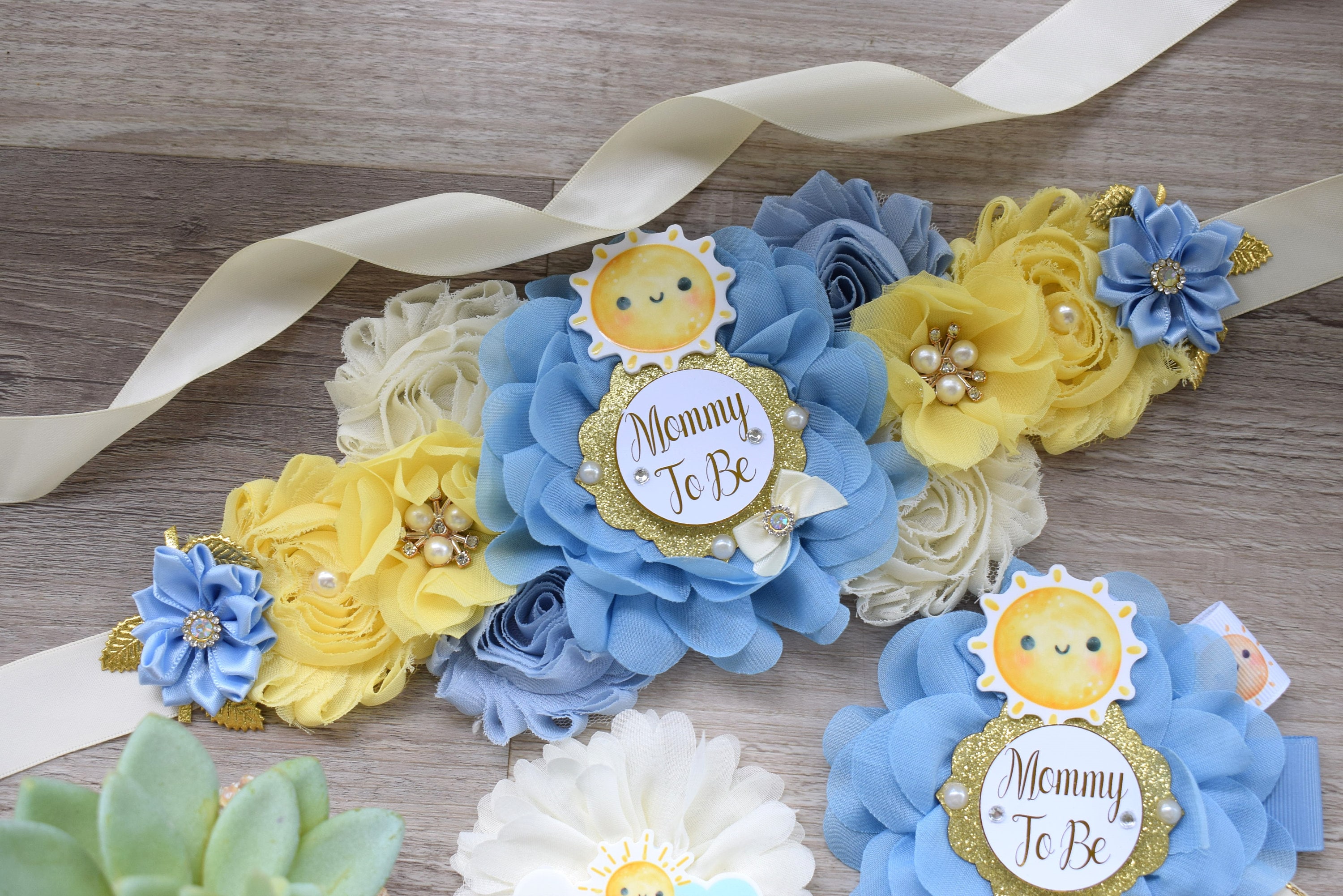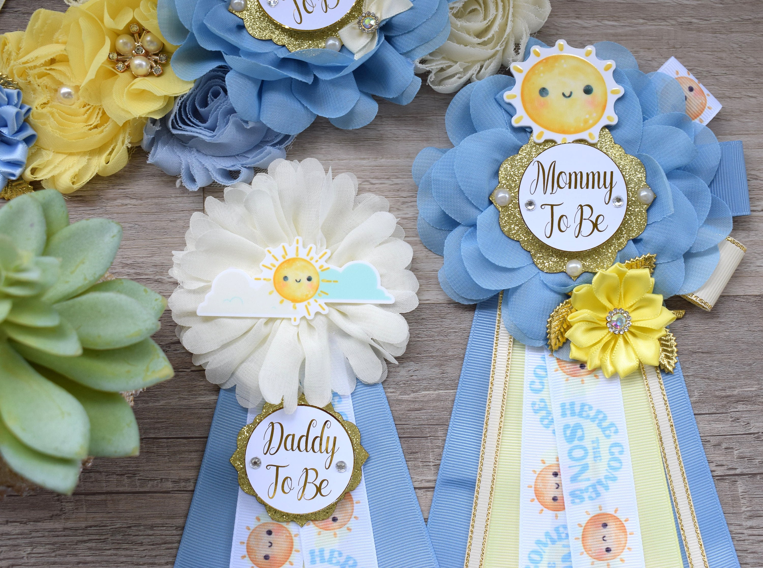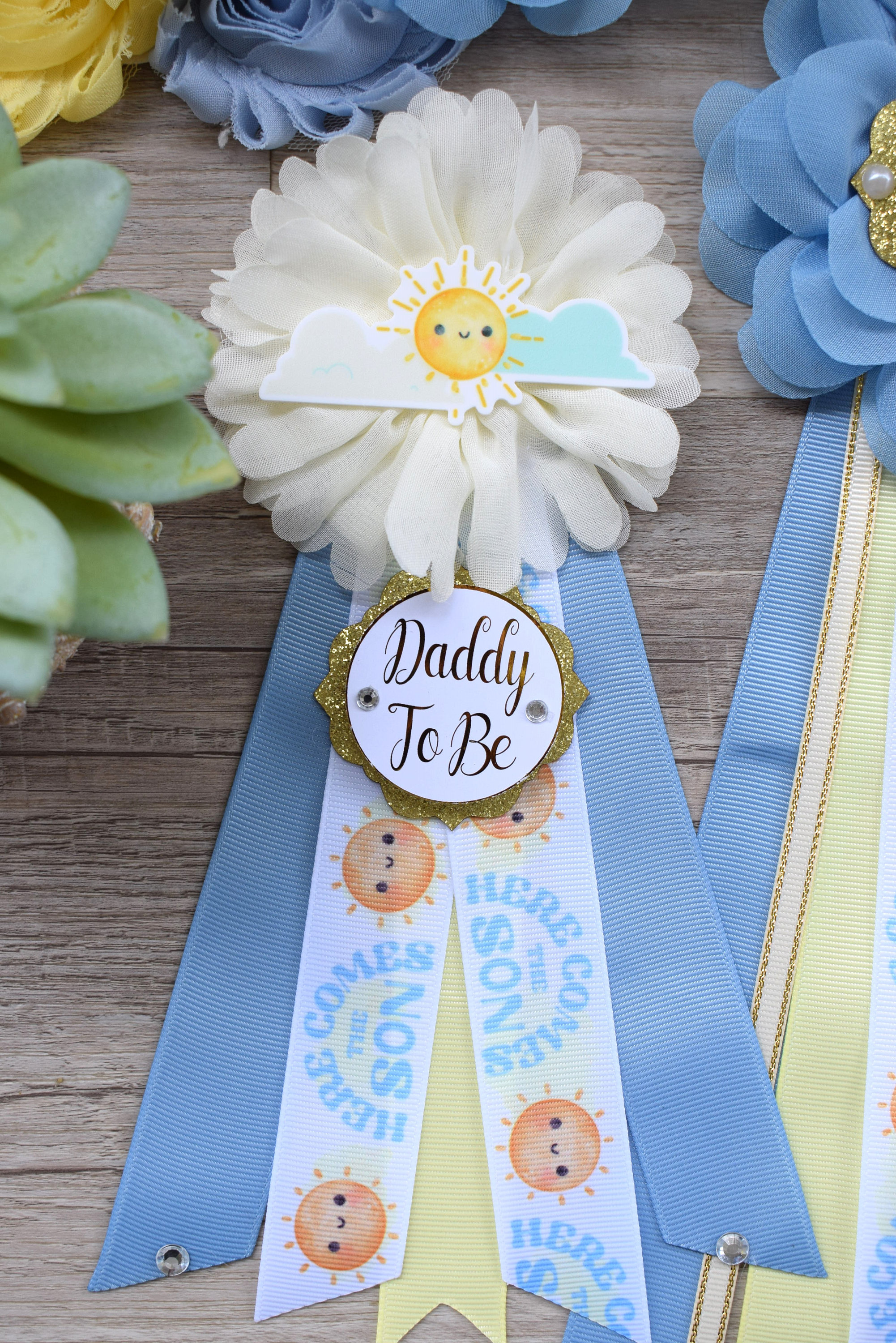 Here Come The Son Baby Shower, Neutral Yellow Ivory Maternity Sash, Mommy To Be Ribbon Badge Pin, Daddy To Be Pin, Here Come The Sun