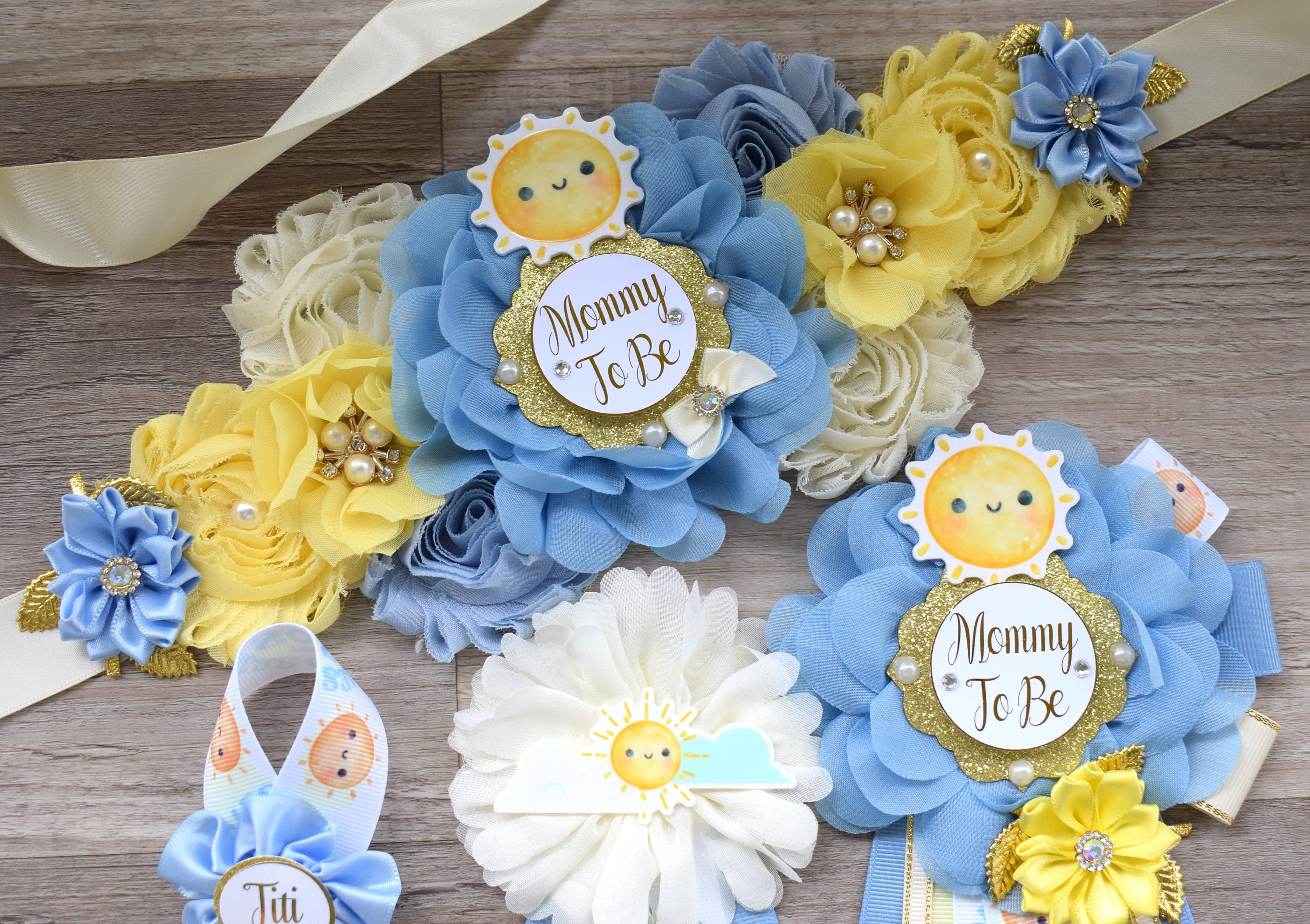☆ Maternity Sash: It has eleven flowers in yellow and blue colors embellished with rhinestones and pearls. The ribbon sash is 80'' (2 meters) long.