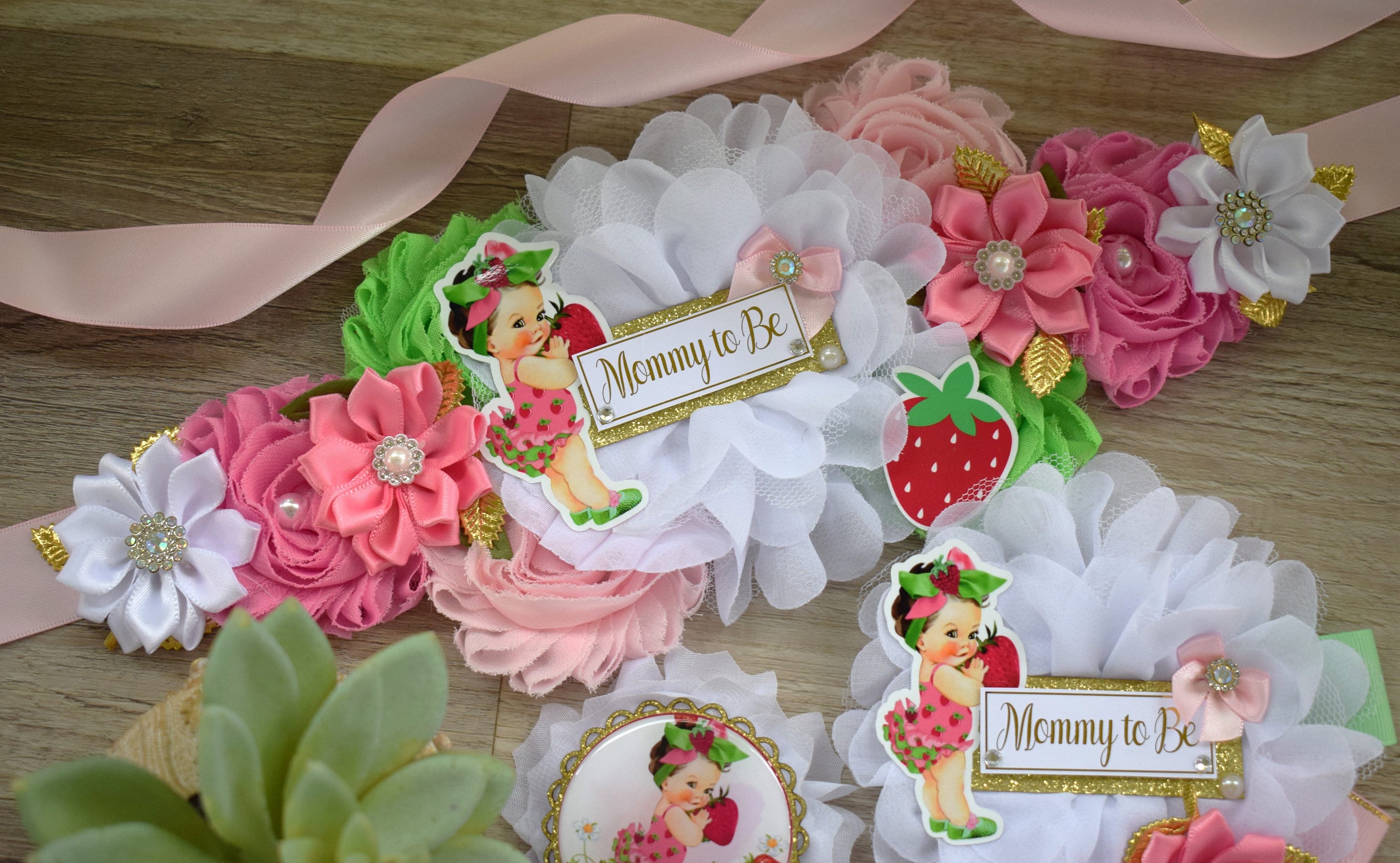 This Strawberry Sash & Pin Set was made especially for a Baby Shower or a Photo Prop.