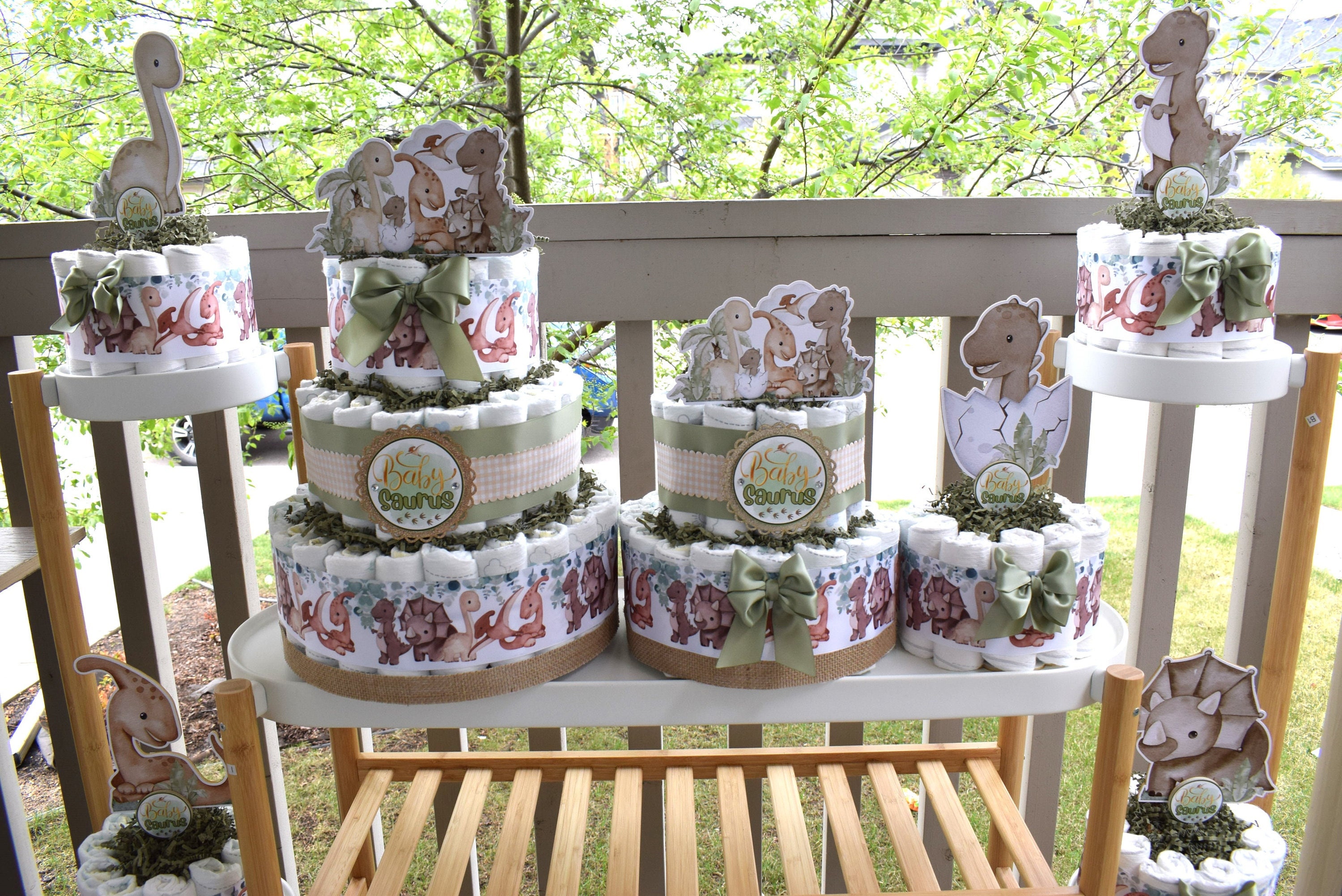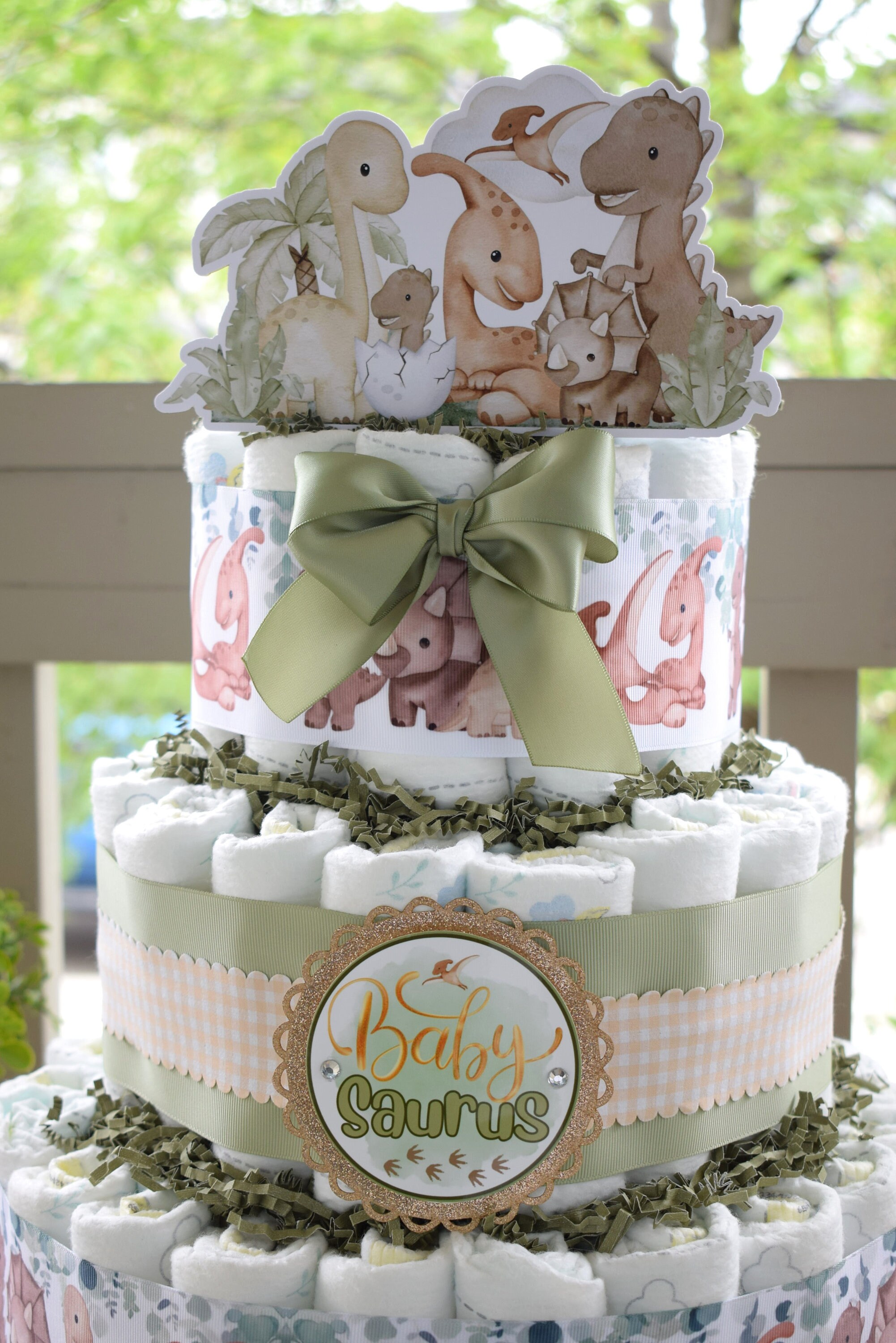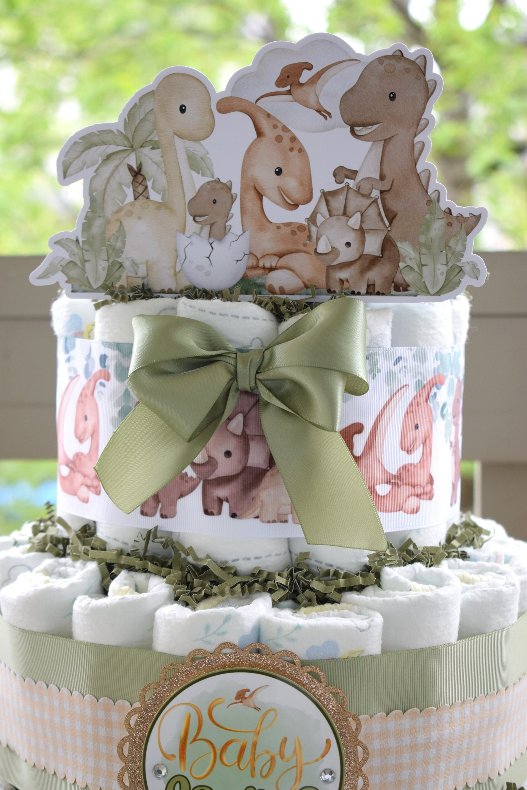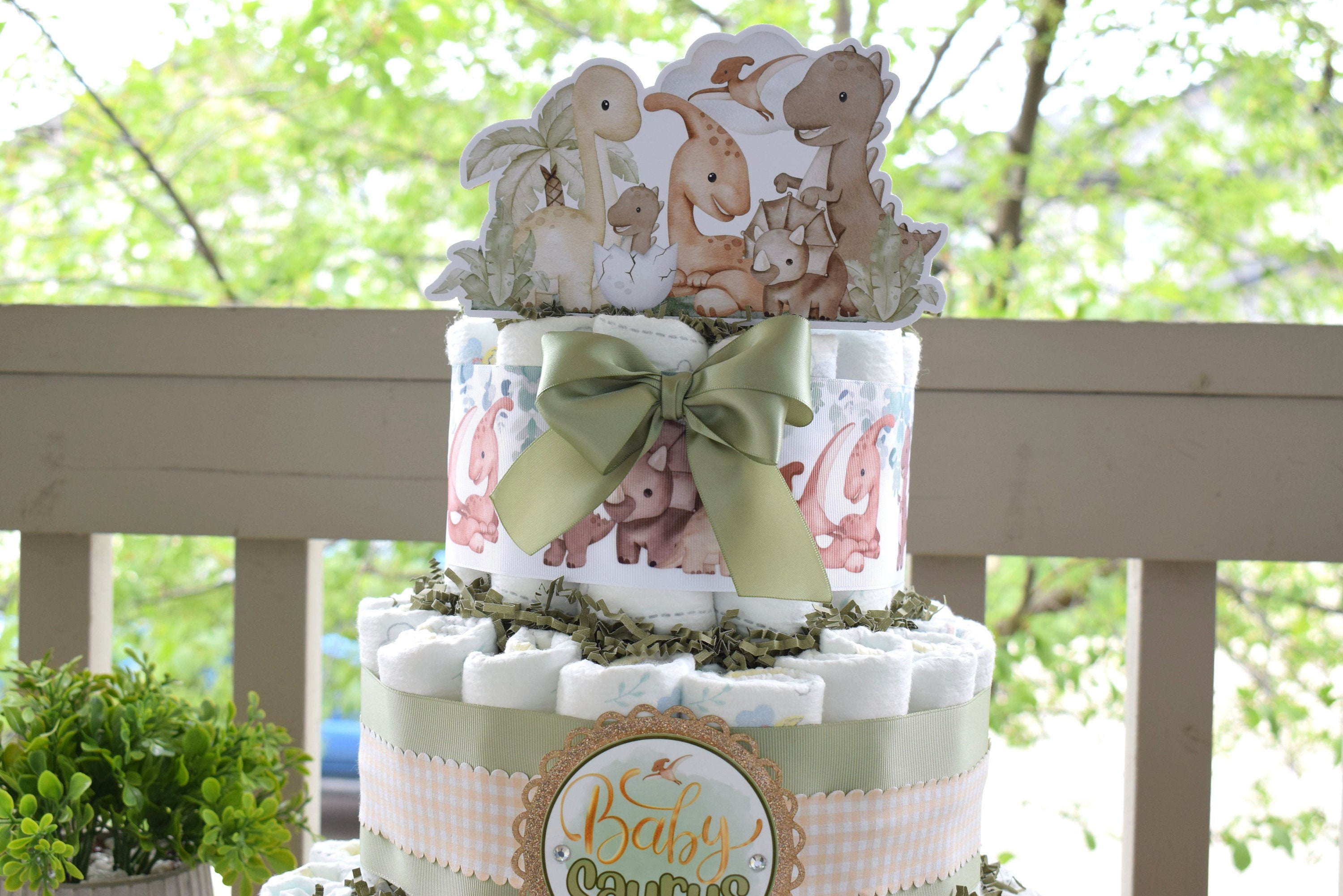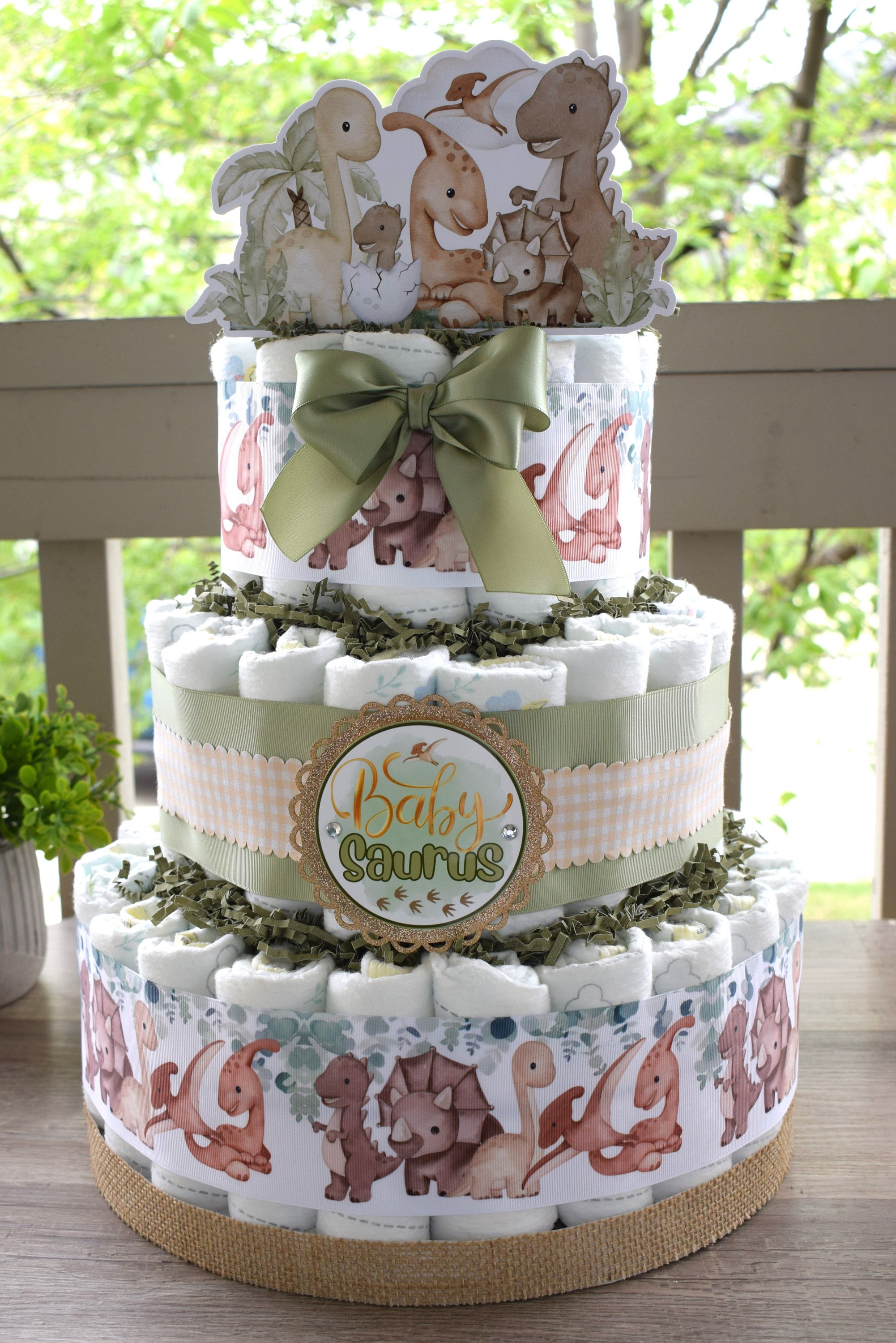 Neutral Dino 3 Tier Diaper Cake Baby Shower, Neutral Dinosaur Diaper Cake, Baby Shower Table Centerpieces Decorations, New Mom Gifts - S0002