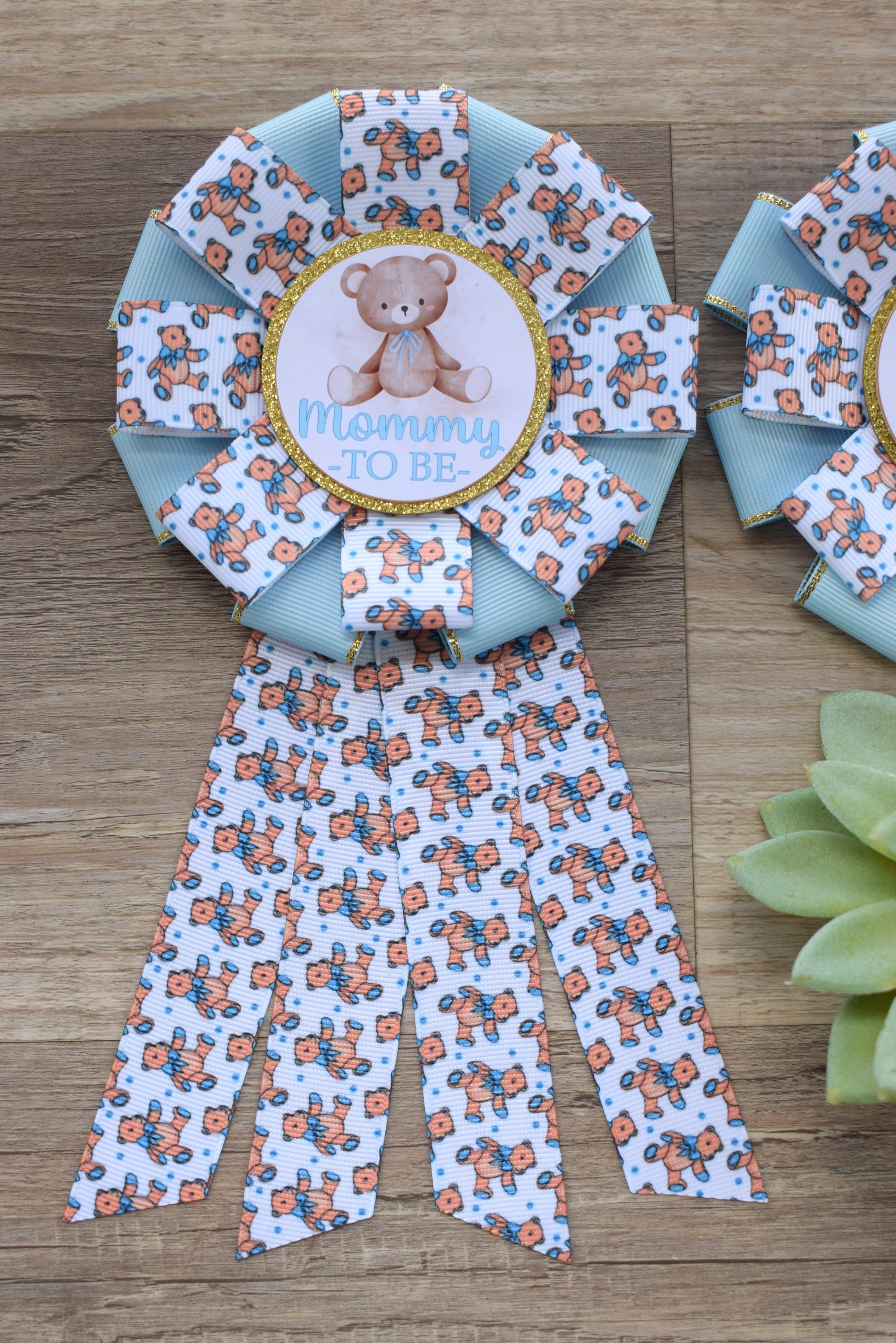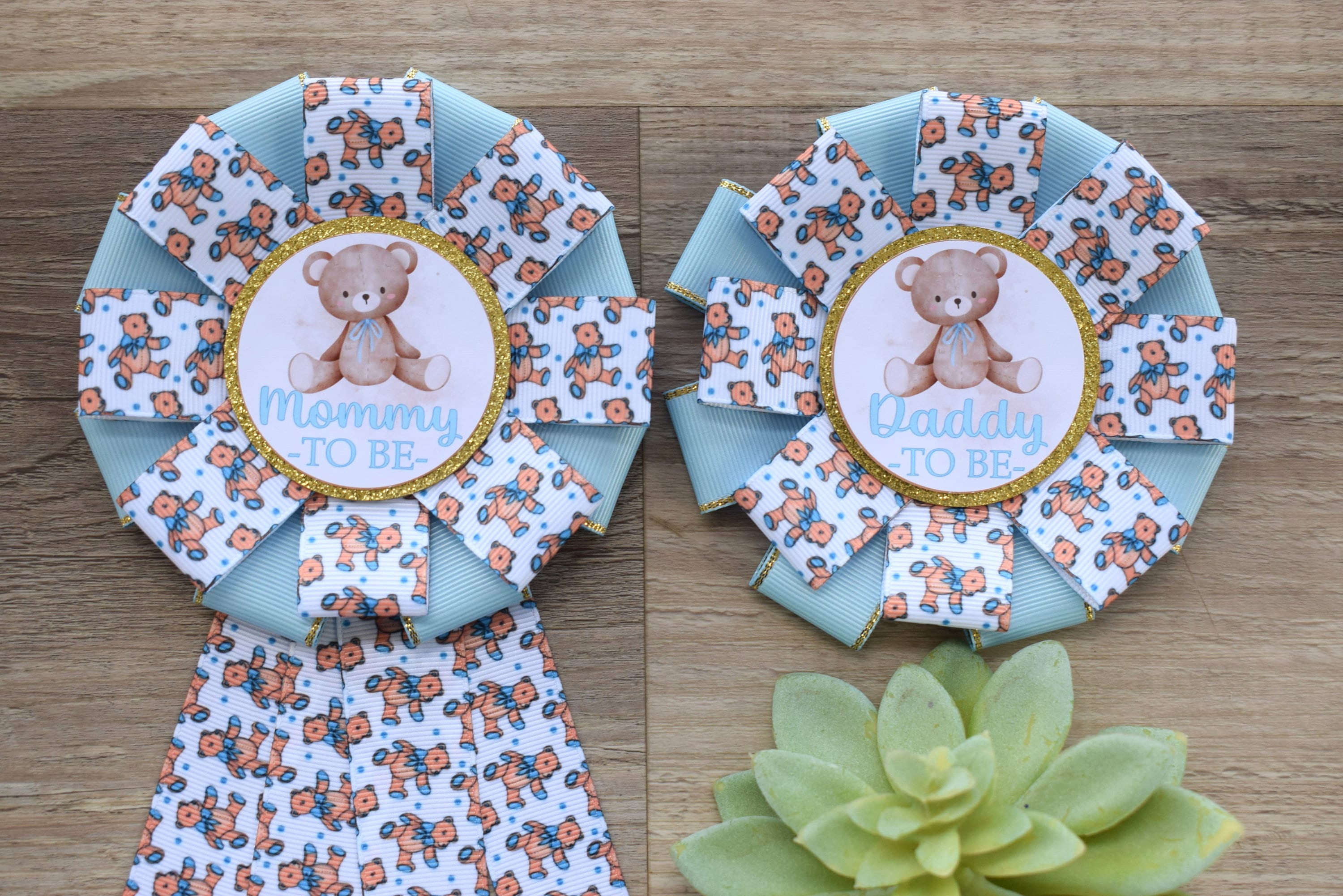 Baby Boy Blue Teddy Bear Baby Shower, Boy Bear Mommy To Be Ribbon Pin, Blue Teddy Bear Daddy To Be Pin, Parent's To Be Pins