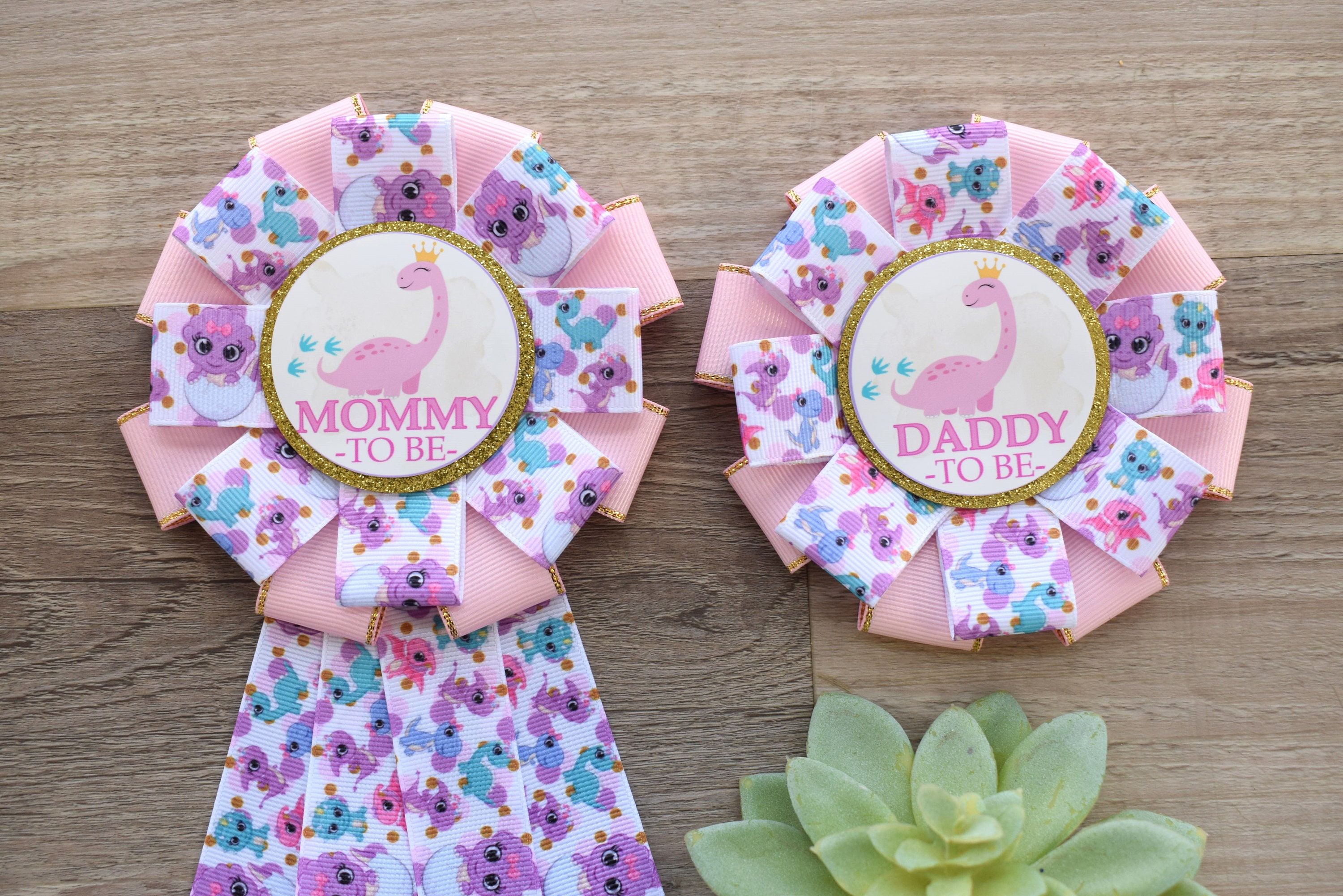 Girl Dinosaur Baby Shower, Pink Lavender Dinosaur Corsage Pin, Dinosaur Mommy to Be Ribbon Pin, Dinosaur Daddy to Be Pin