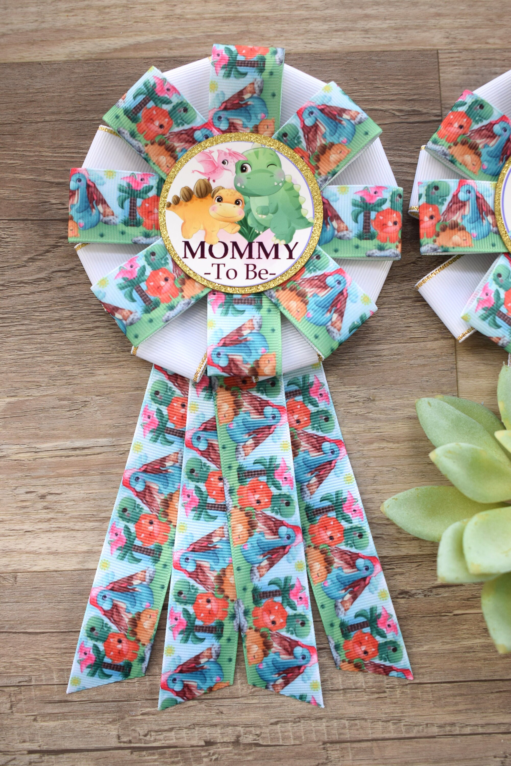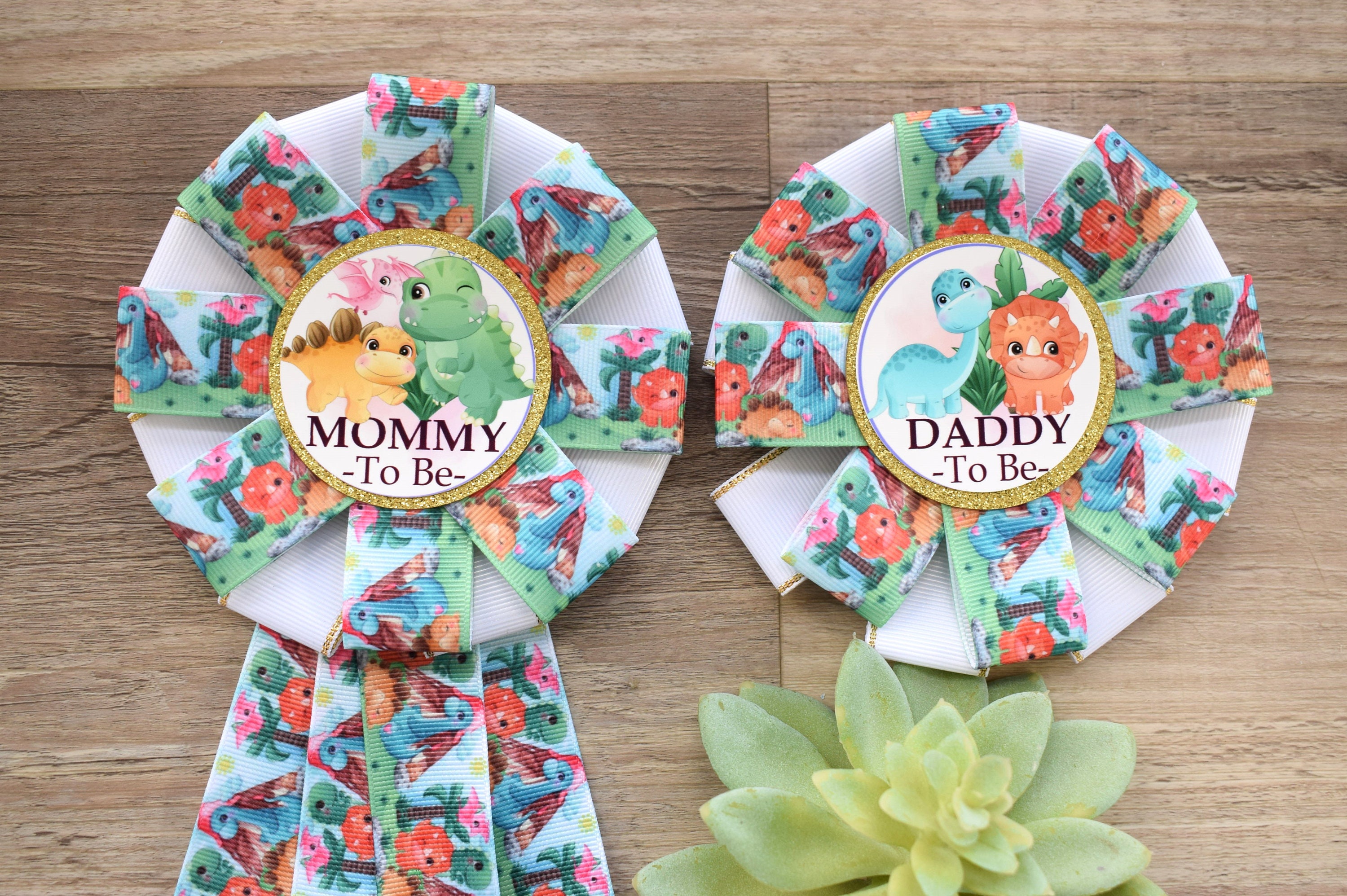 Dinosaur Baby Shower, Neutral Gender Reveal Dinosaur Corsage Pin, Dinosaur Mommy to Be Ribbon Pin, Dinosaur Daddy to Be Pin