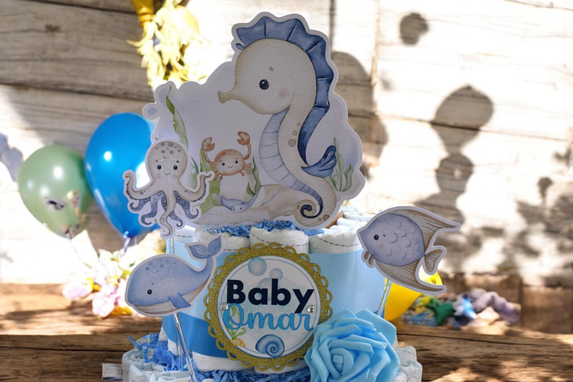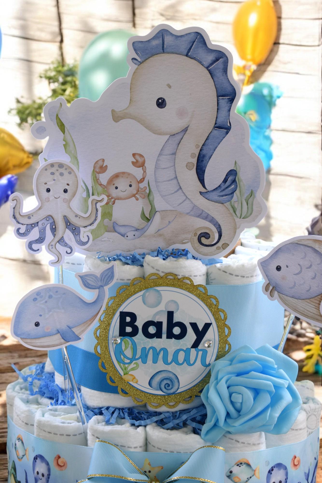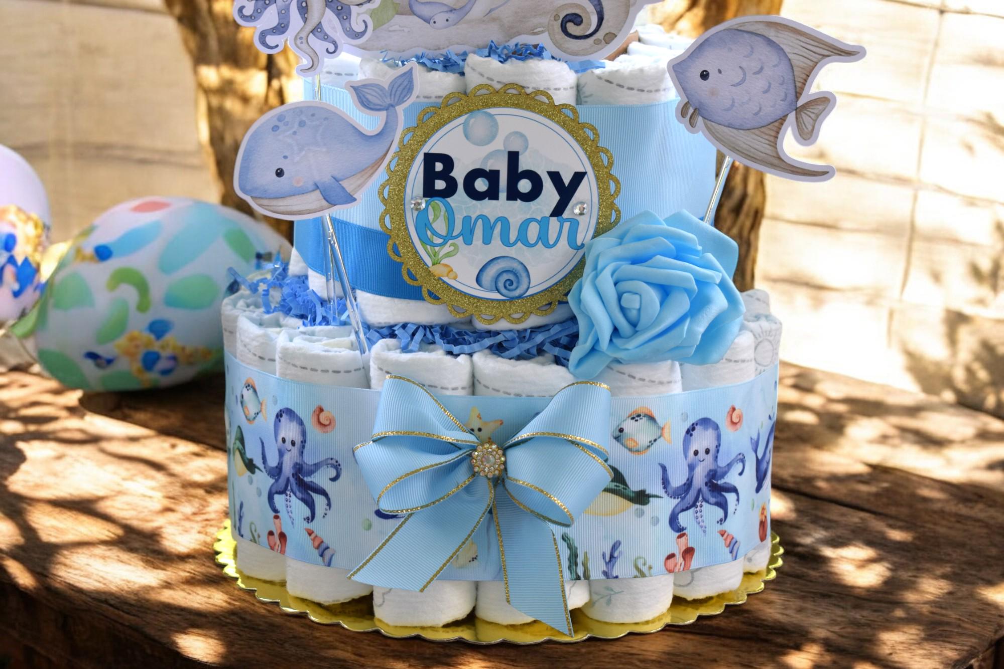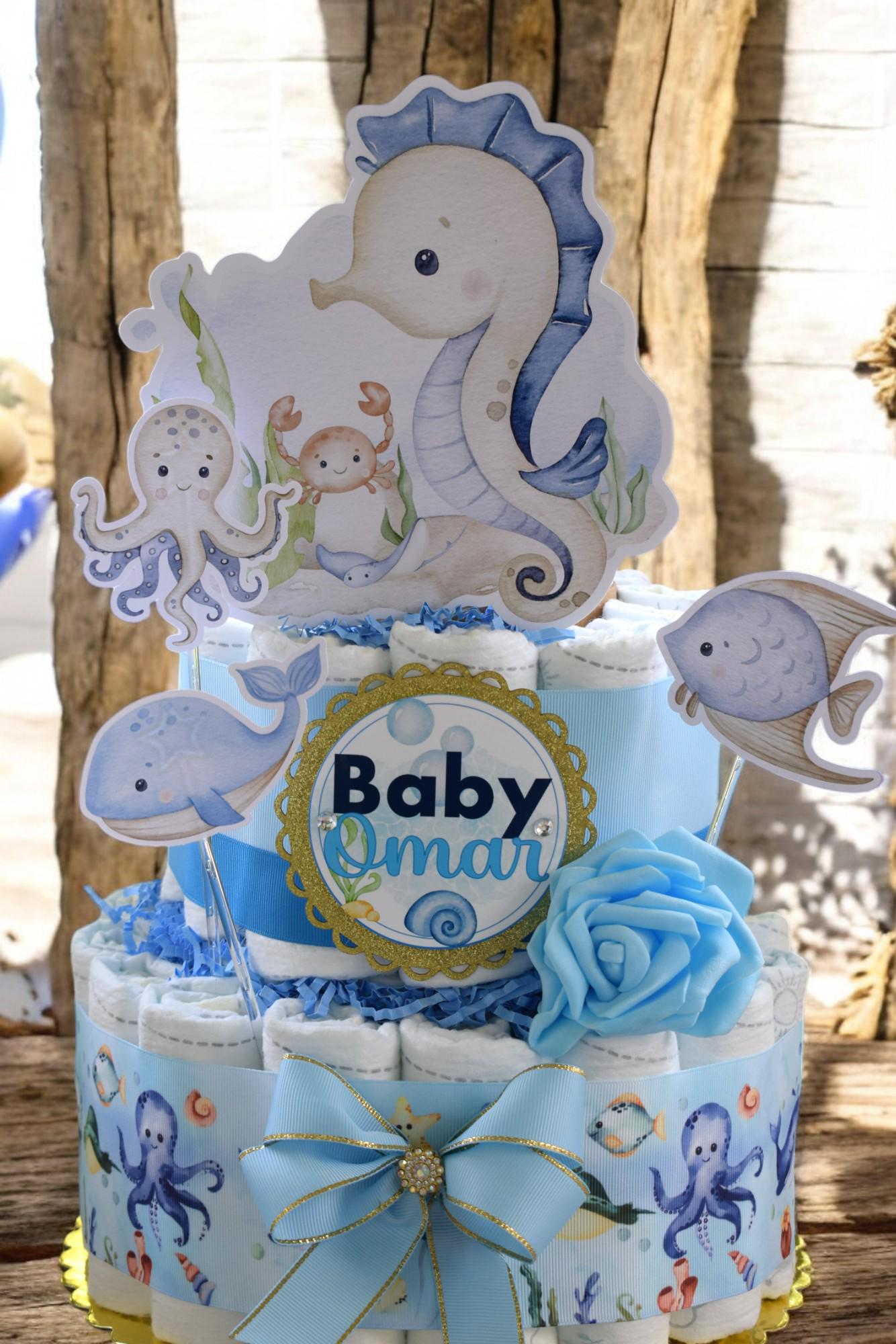 -. This DIAPER CAKE is decorated with safari theme in soft green & blues.