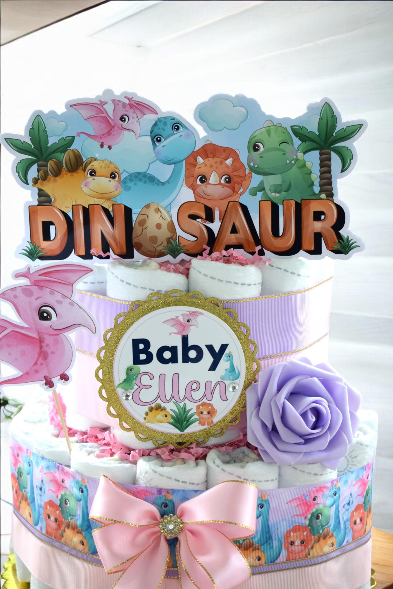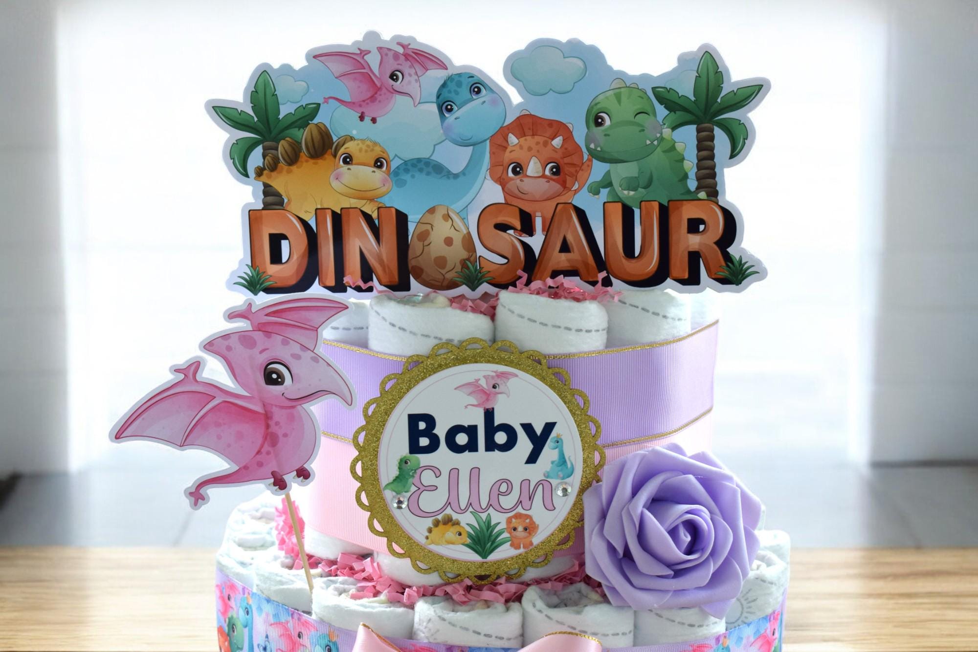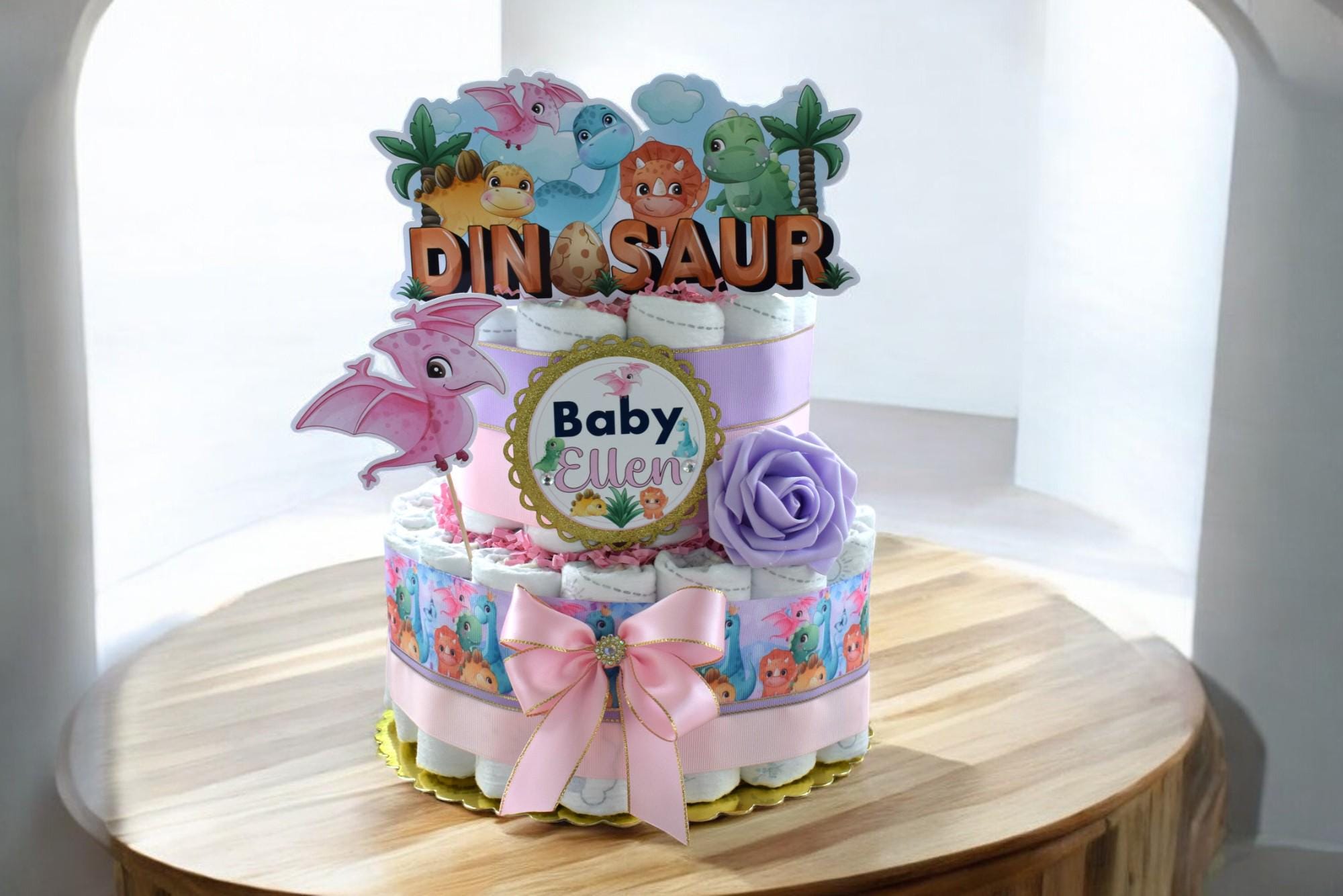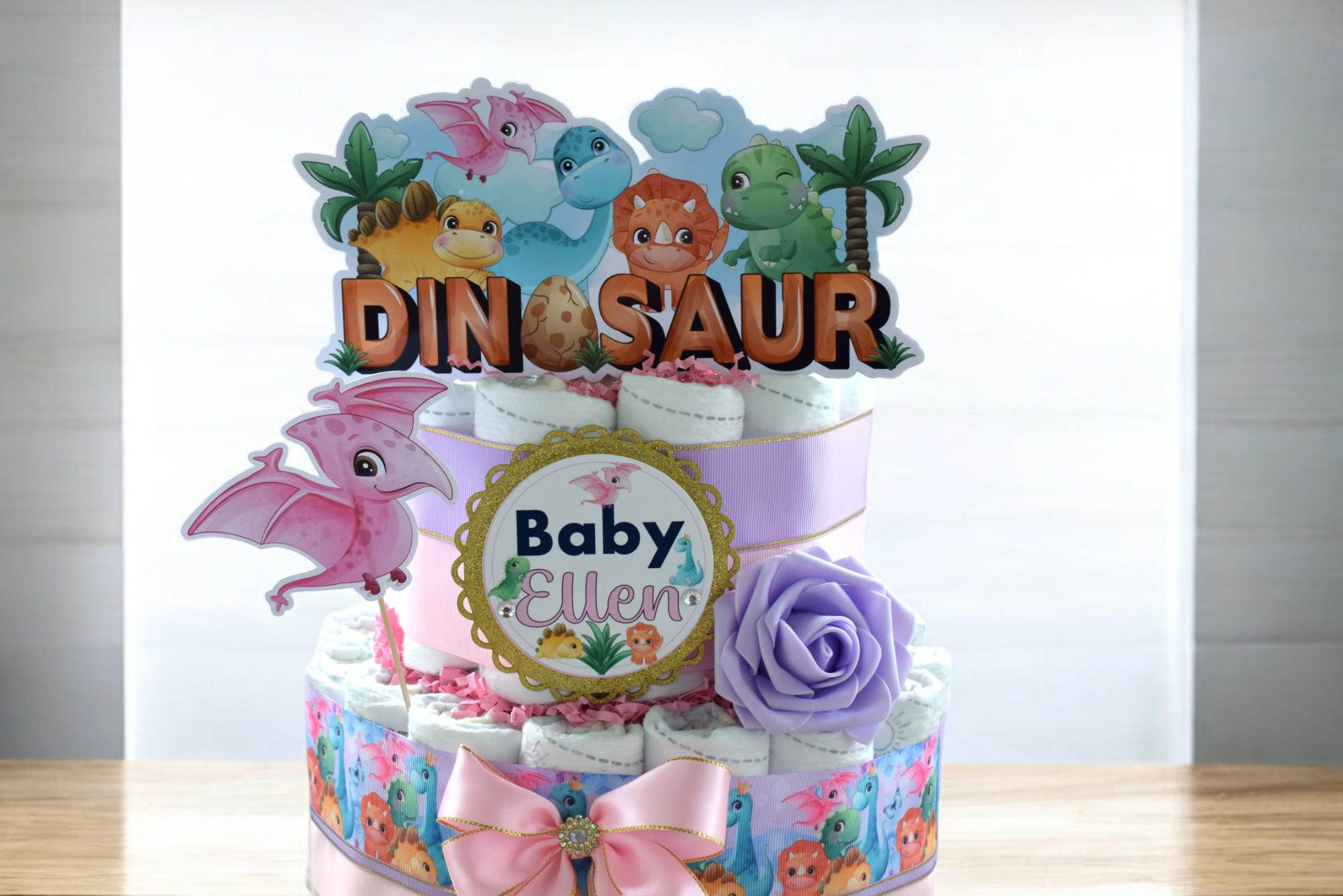 Girl Dinosaur Diaper Cake Baby Shower, 2 Tier Diaper Cake Centerpieces Decor, Dinosaur Party, Room Nursery Decor, New Mom Gifts - S00014
