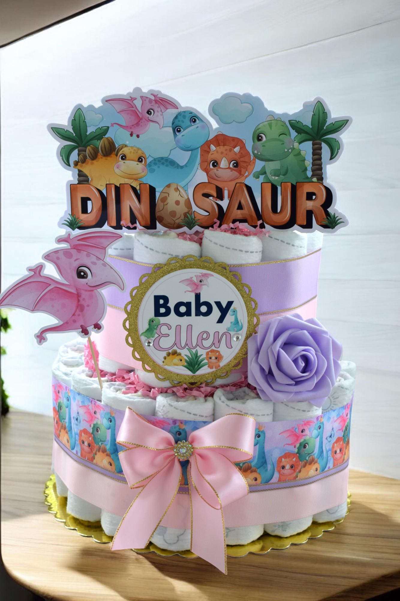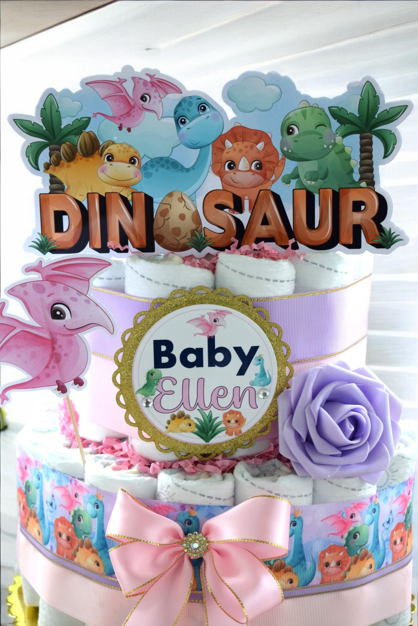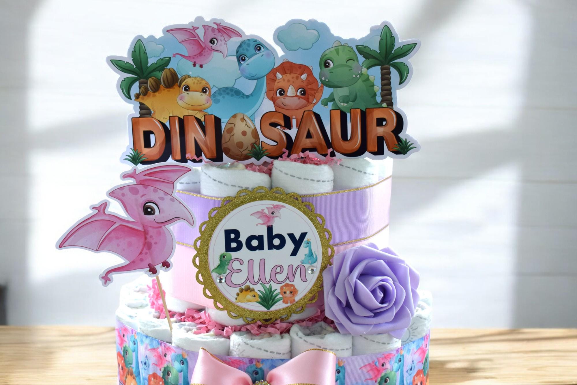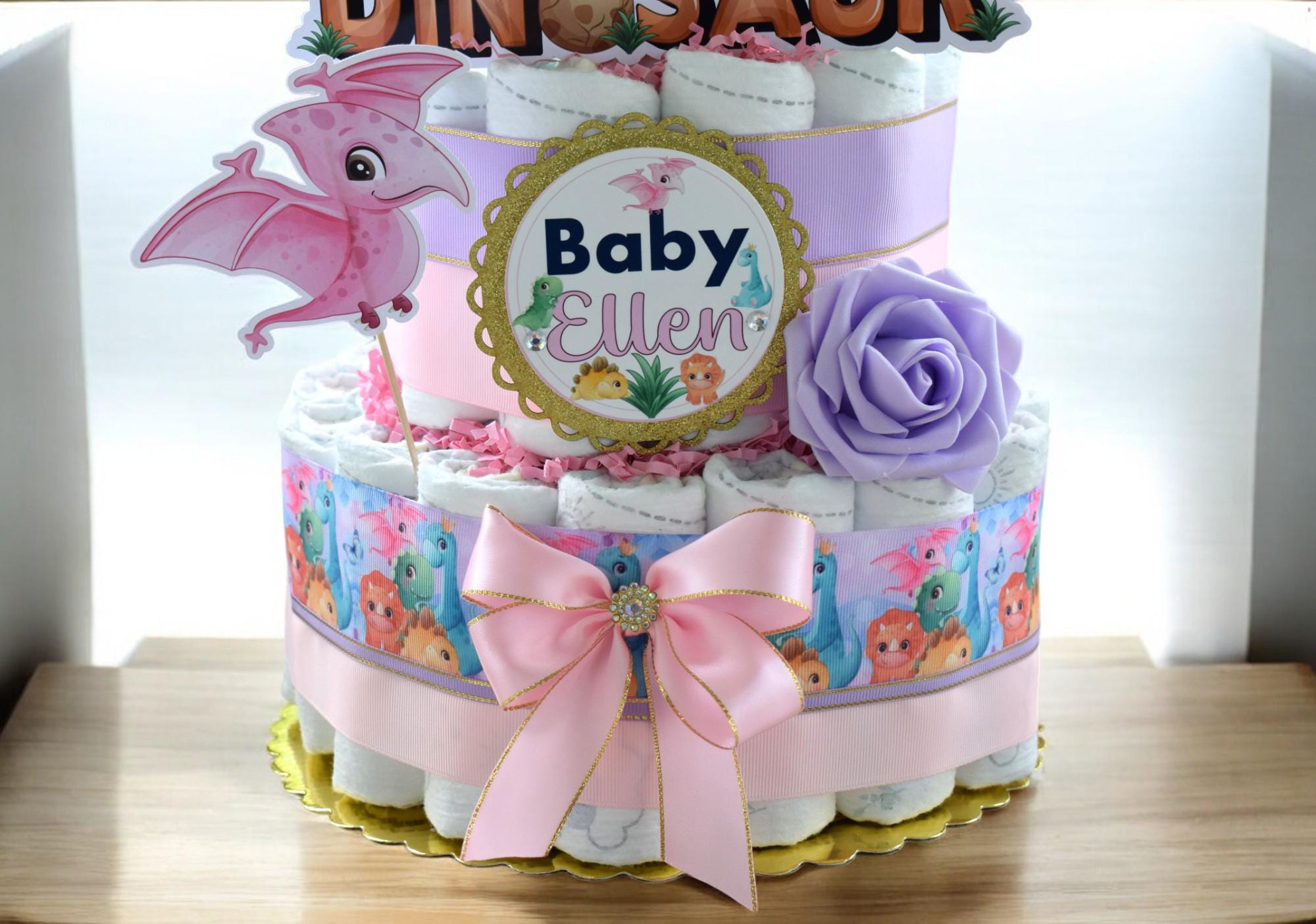 Girl Dinosaur Diaper Cake Baby Shower, 2 Tier Diaper Cake Centerpieces Decor, Dinosaur Party, Room Nursery Decor, New Mom Gifts - S00014
