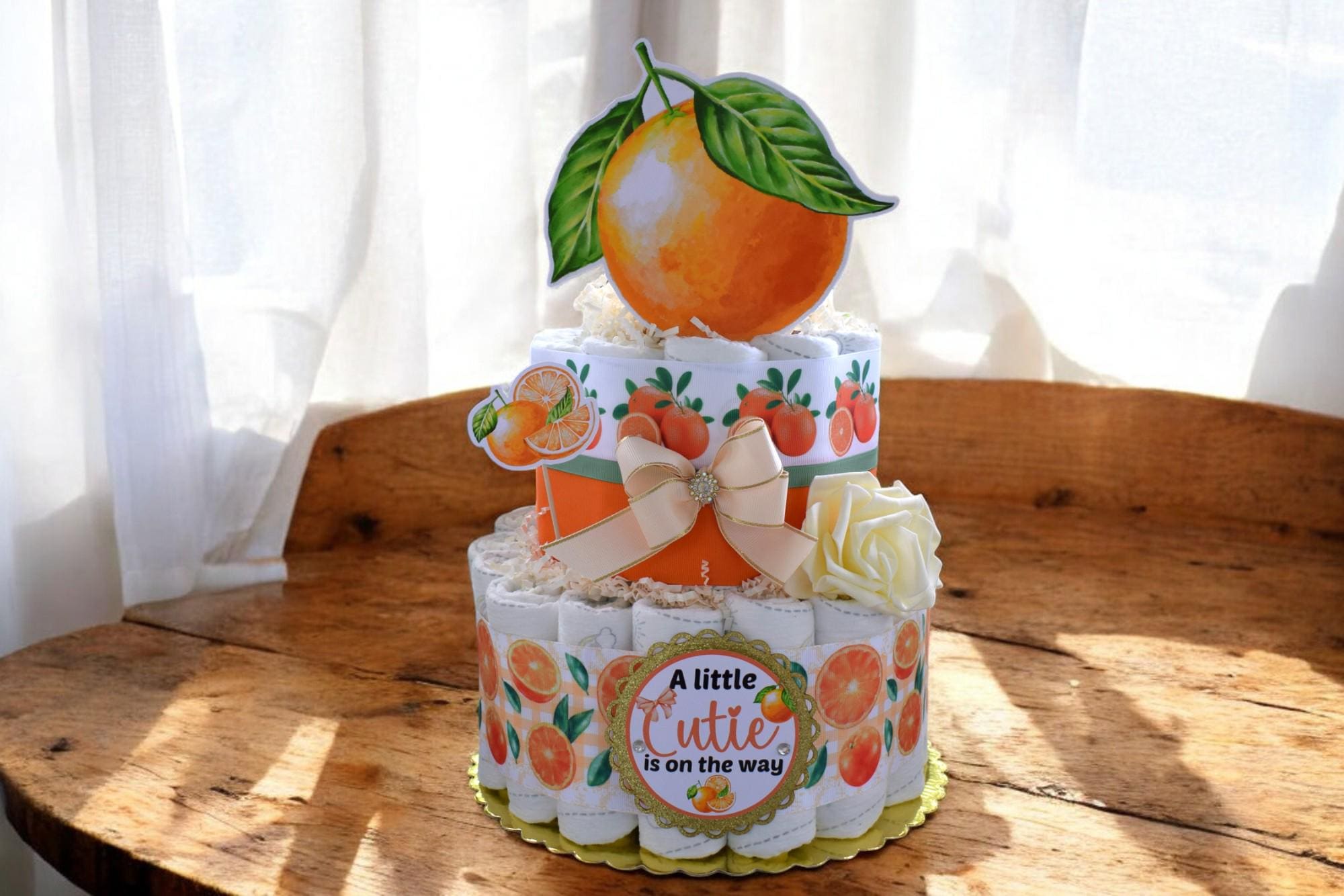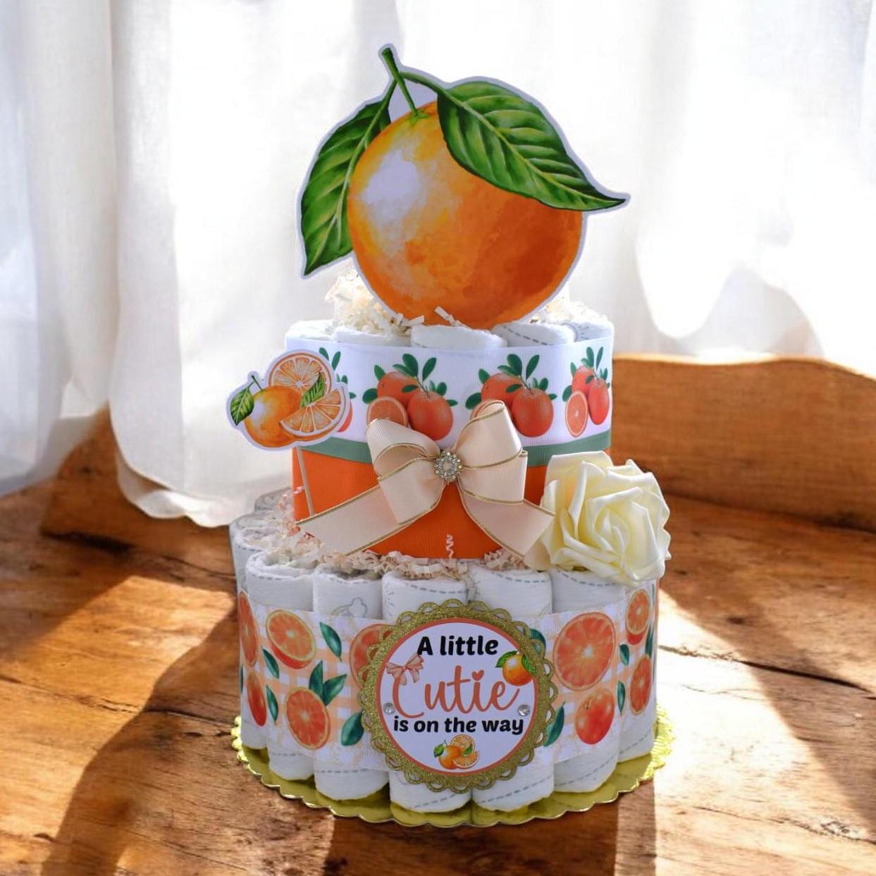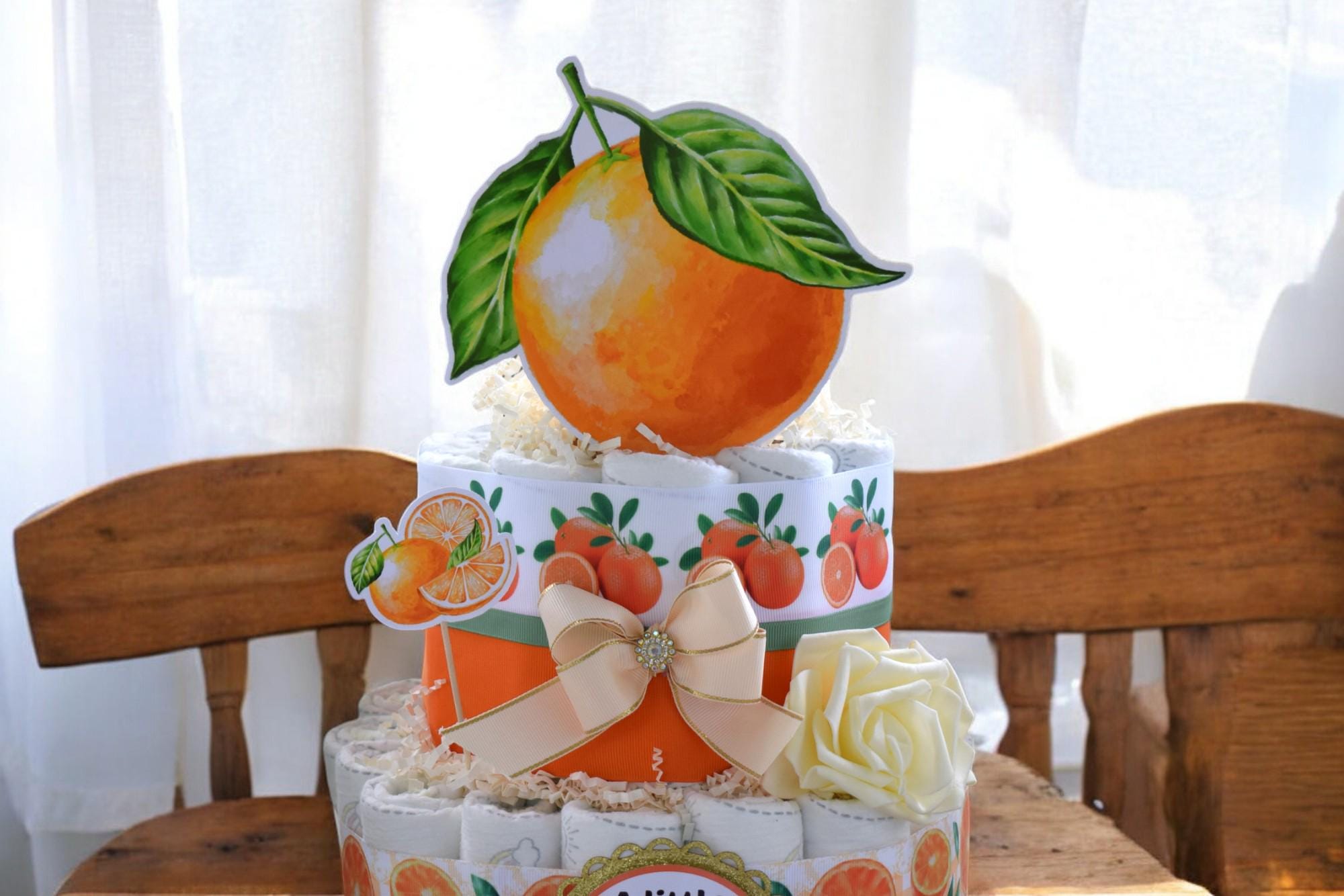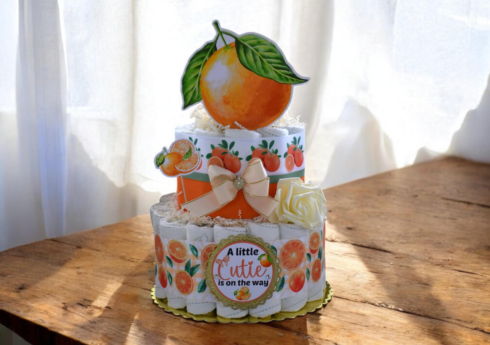Orange Diaper Cake Baby Shower, A Little Cutie Is On The Way, Orange 2 Tier Diaper Cake Centerpieces Decor, Room Nursery Decor, New Mom Gift