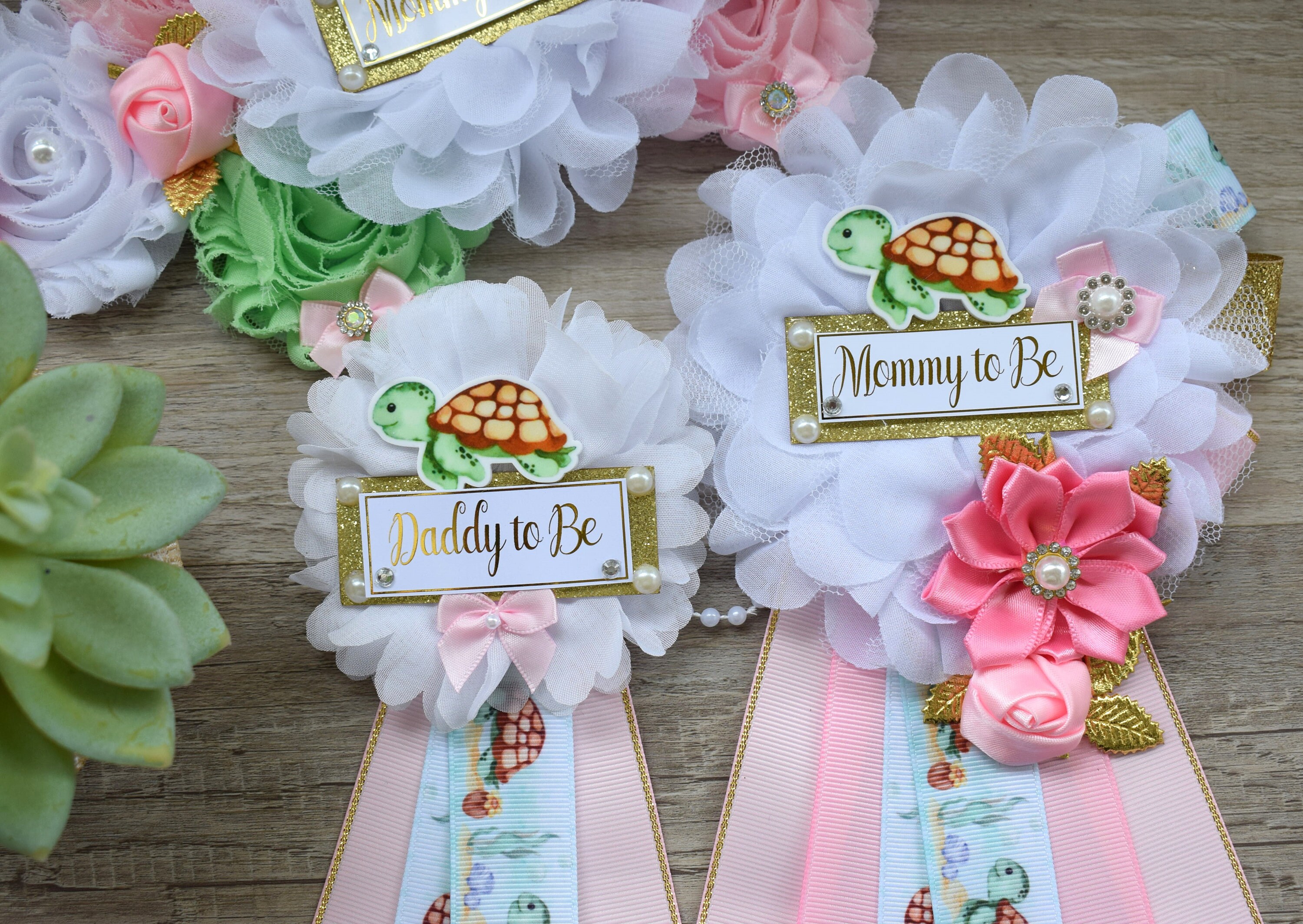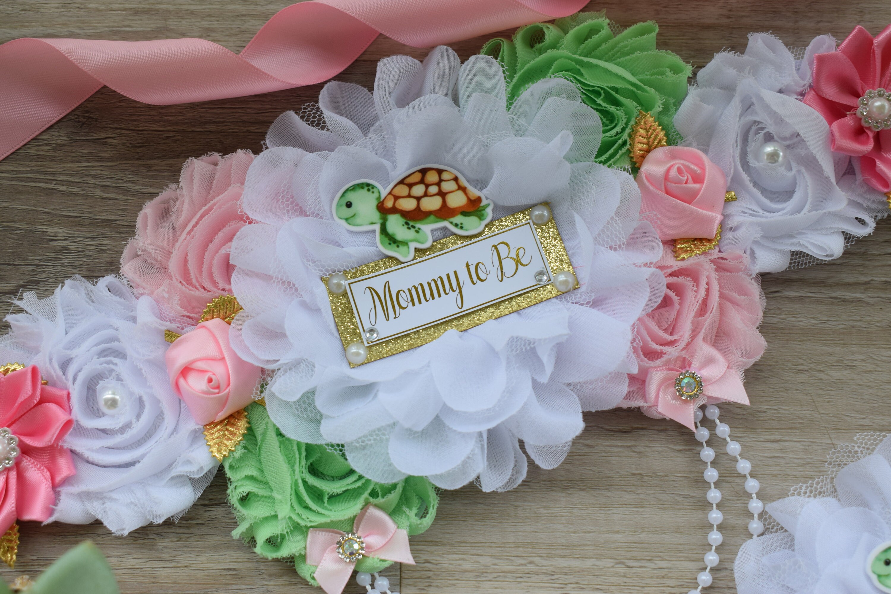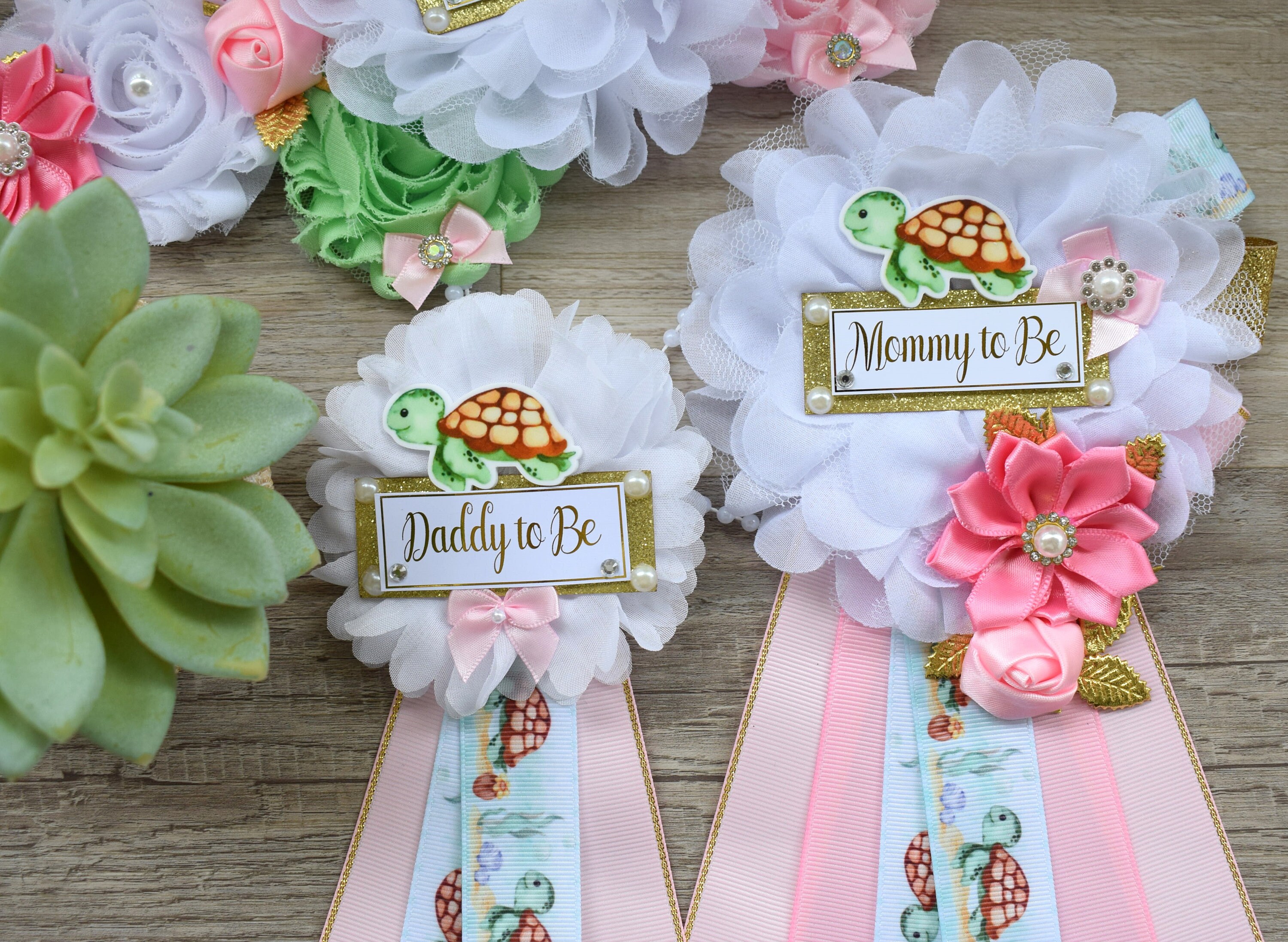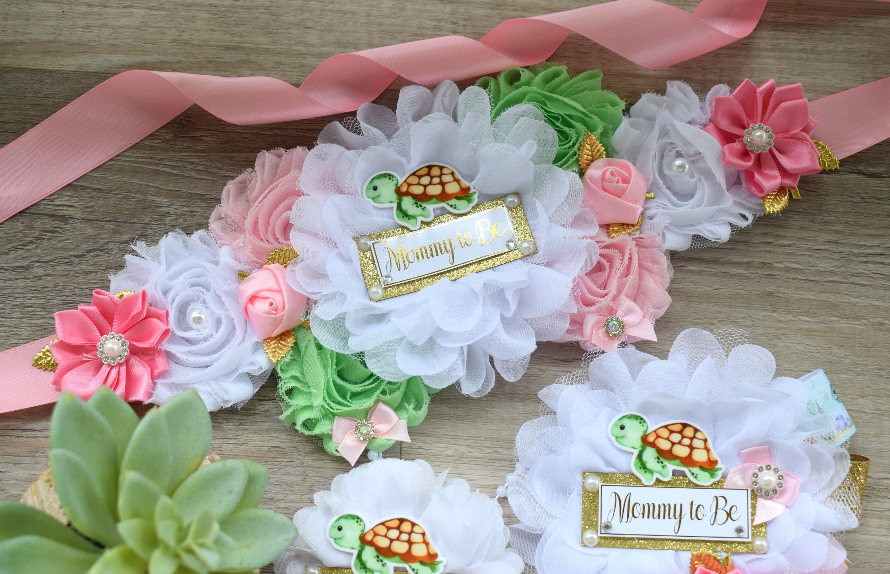 Girl Turtle Baby Shower, Turtle Aqua Blue Flower Sash, Under The Sea Corsage Pin, Turtle Mommy To Be, Turtle Daddy To Be, Turtle Shower