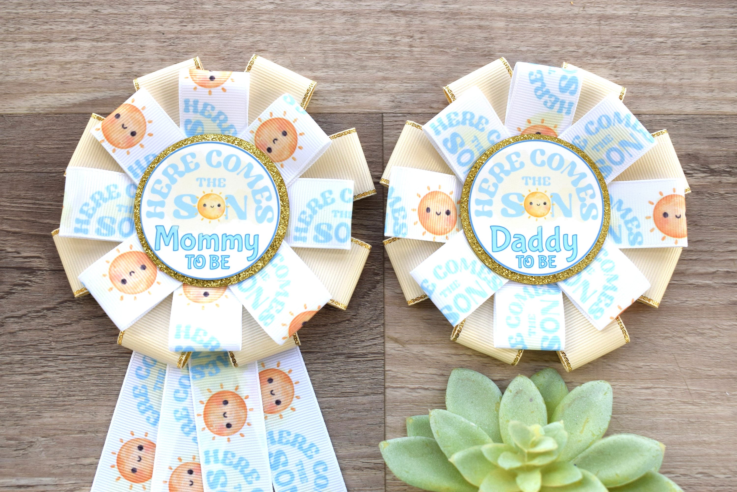 Here Come The Son Baby Shower, Neutral Yellow Ivory Maternity Sash, Mommy To Be Ribbon Badge Pin, Daddy To Be Pin, Here Come The Sun