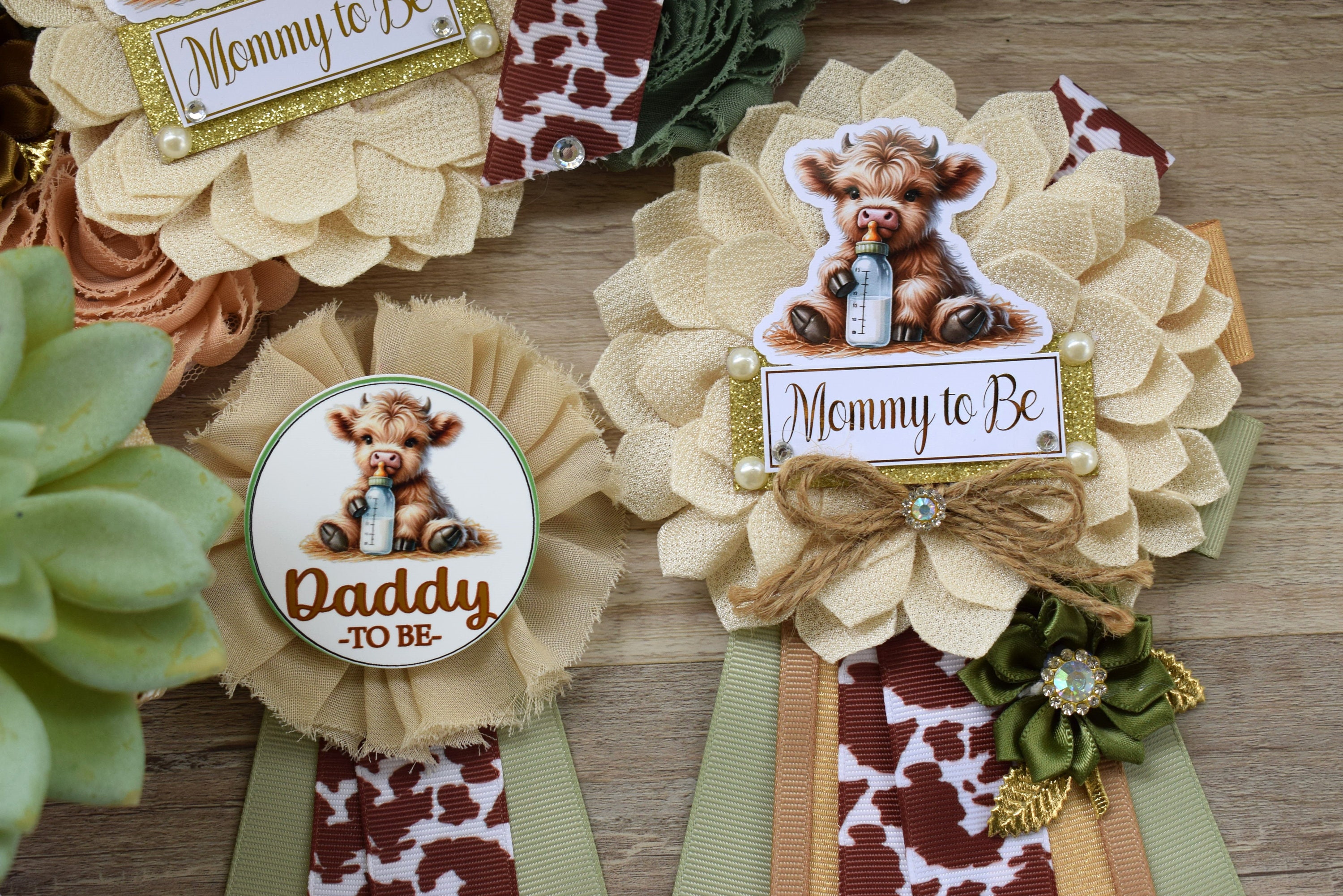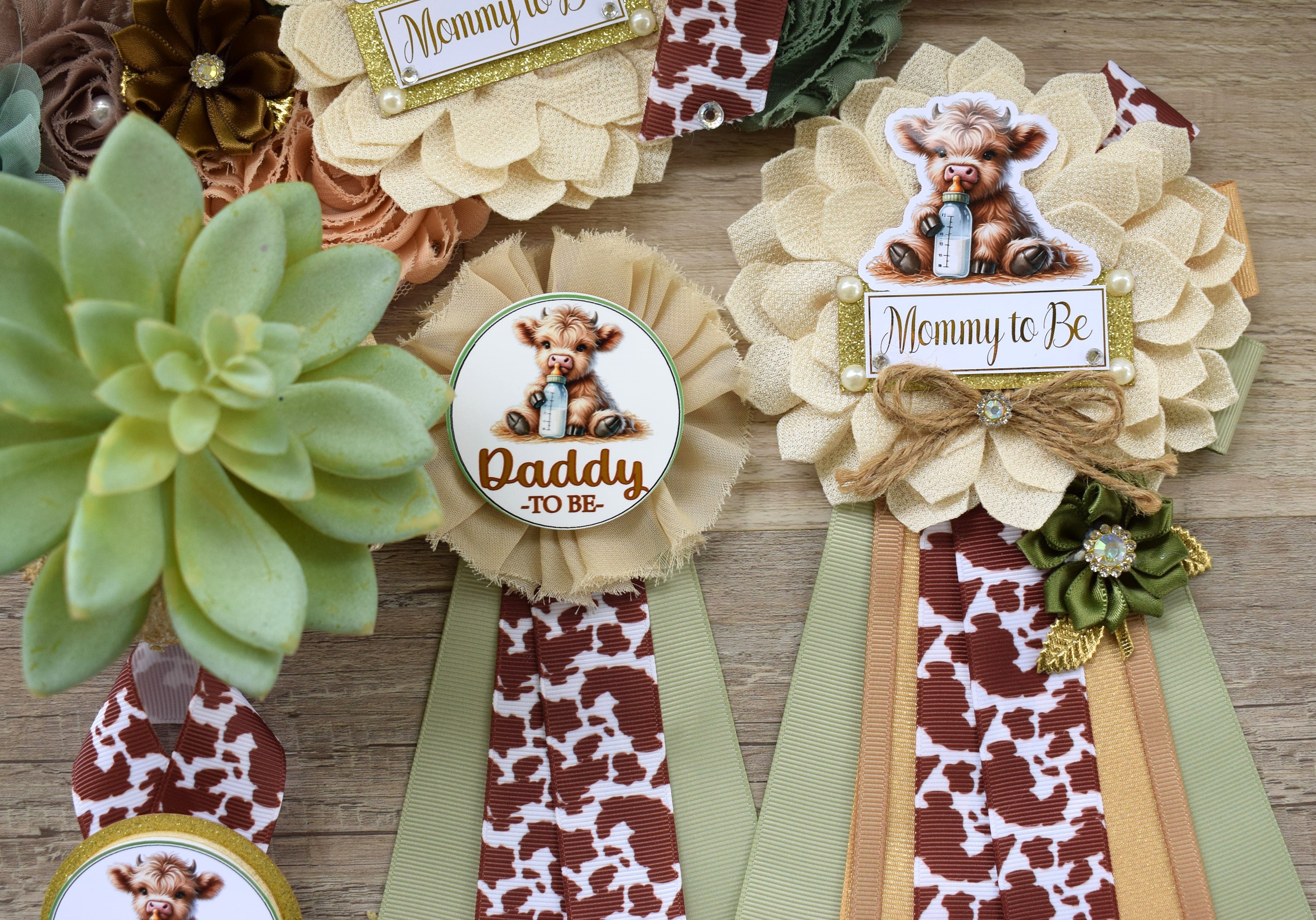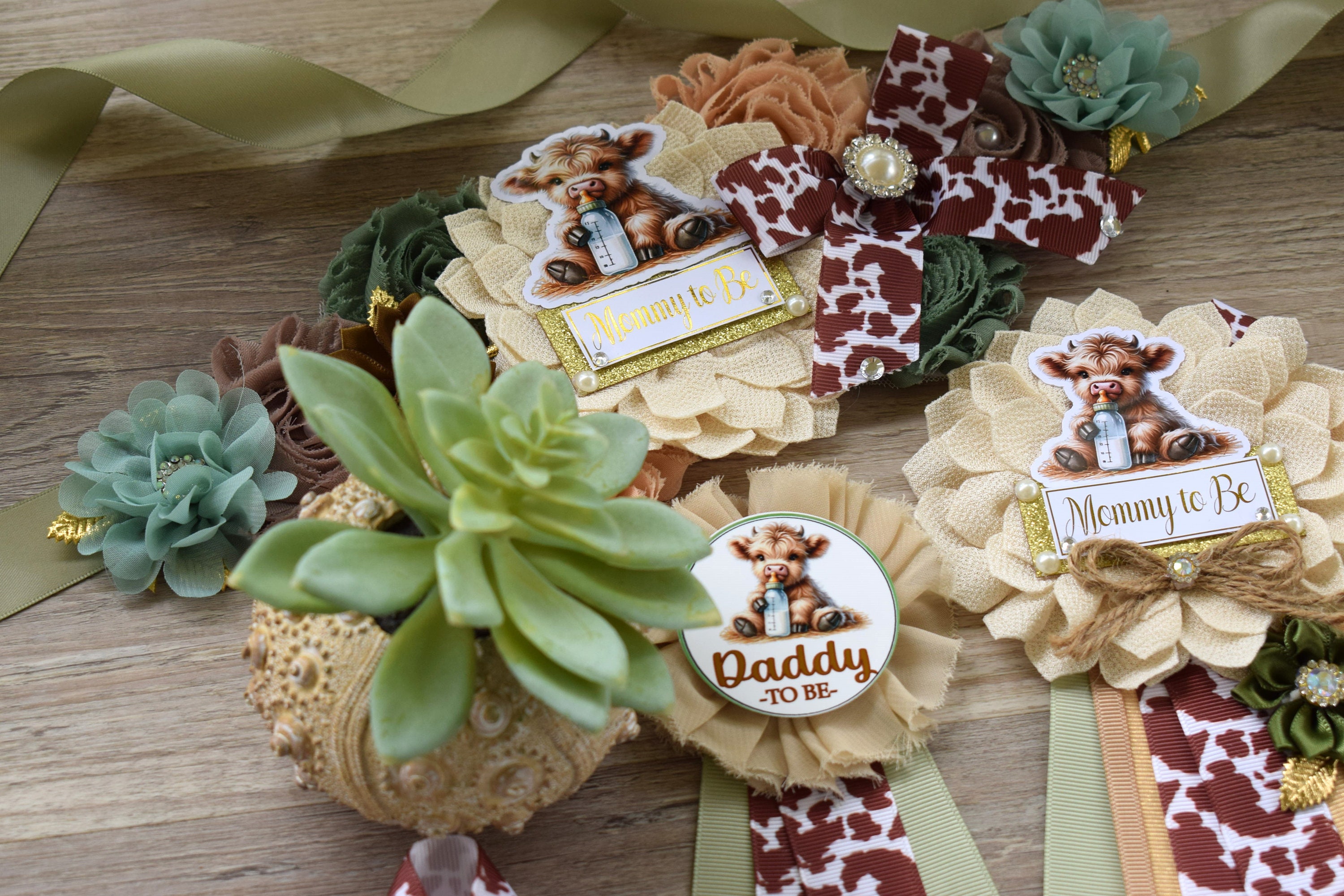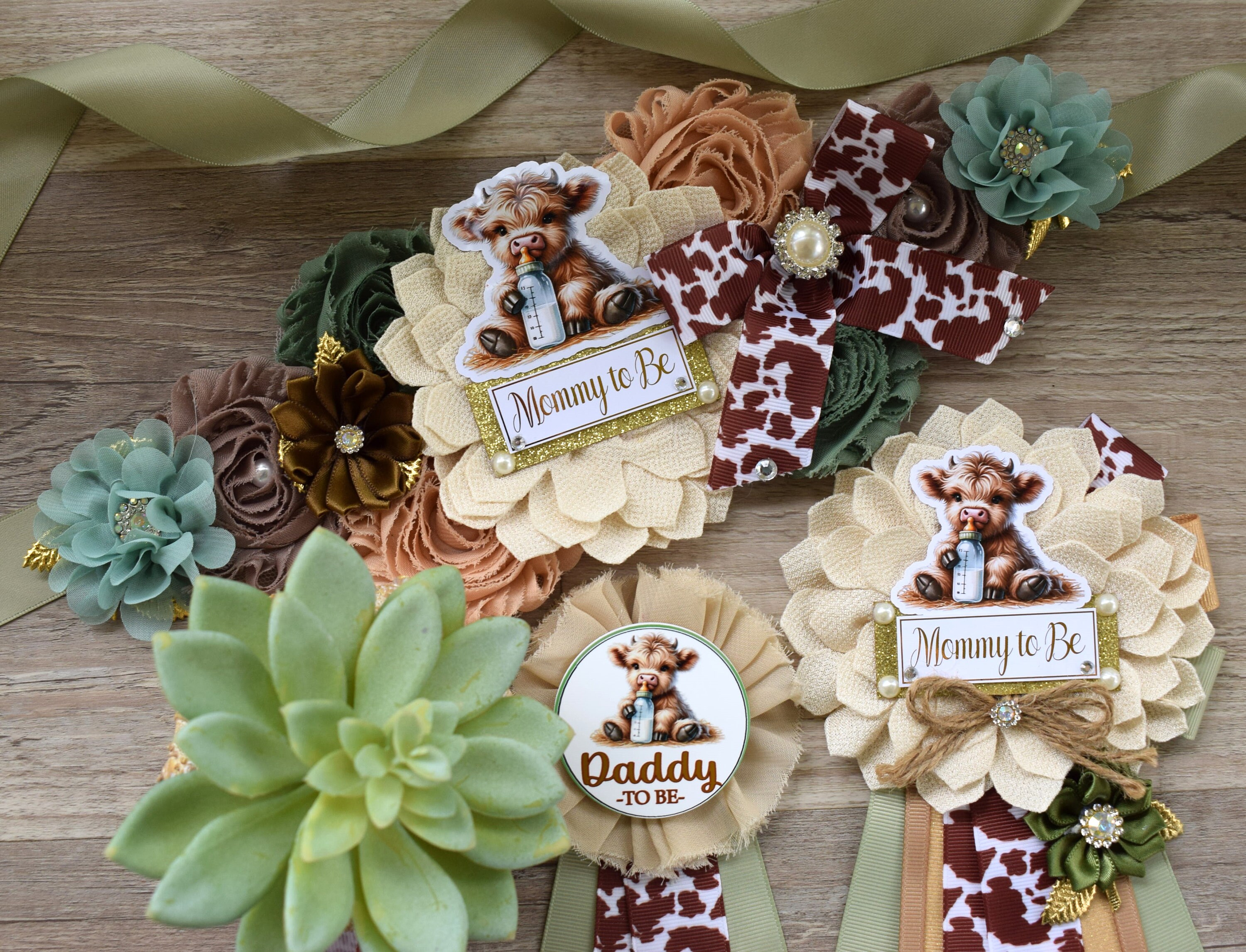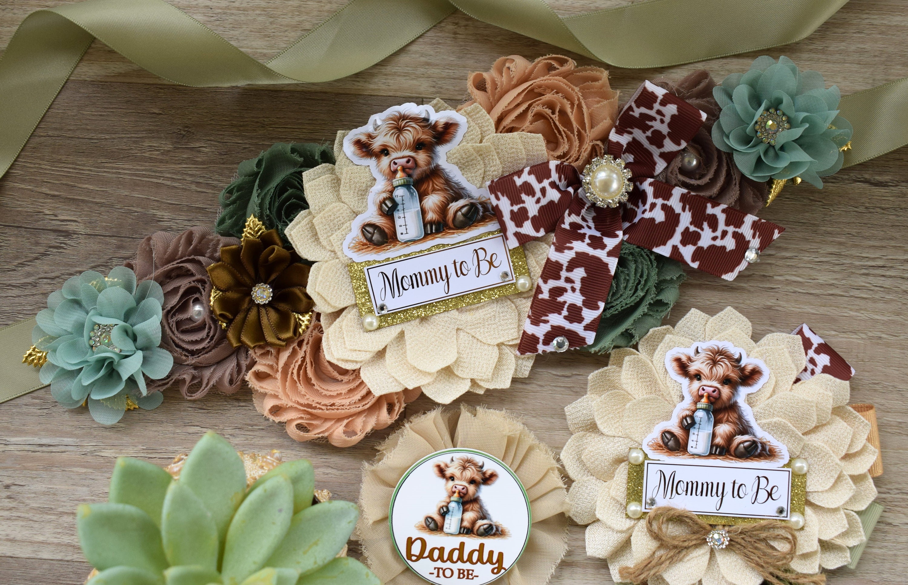 Sage Highland Cow Baby Shower, Sage Tan Brown Maternity Sash, Boy Highland Mommy To Be Pin, Daddy To Be Pin, Boy Highland Cow Corsage Pin