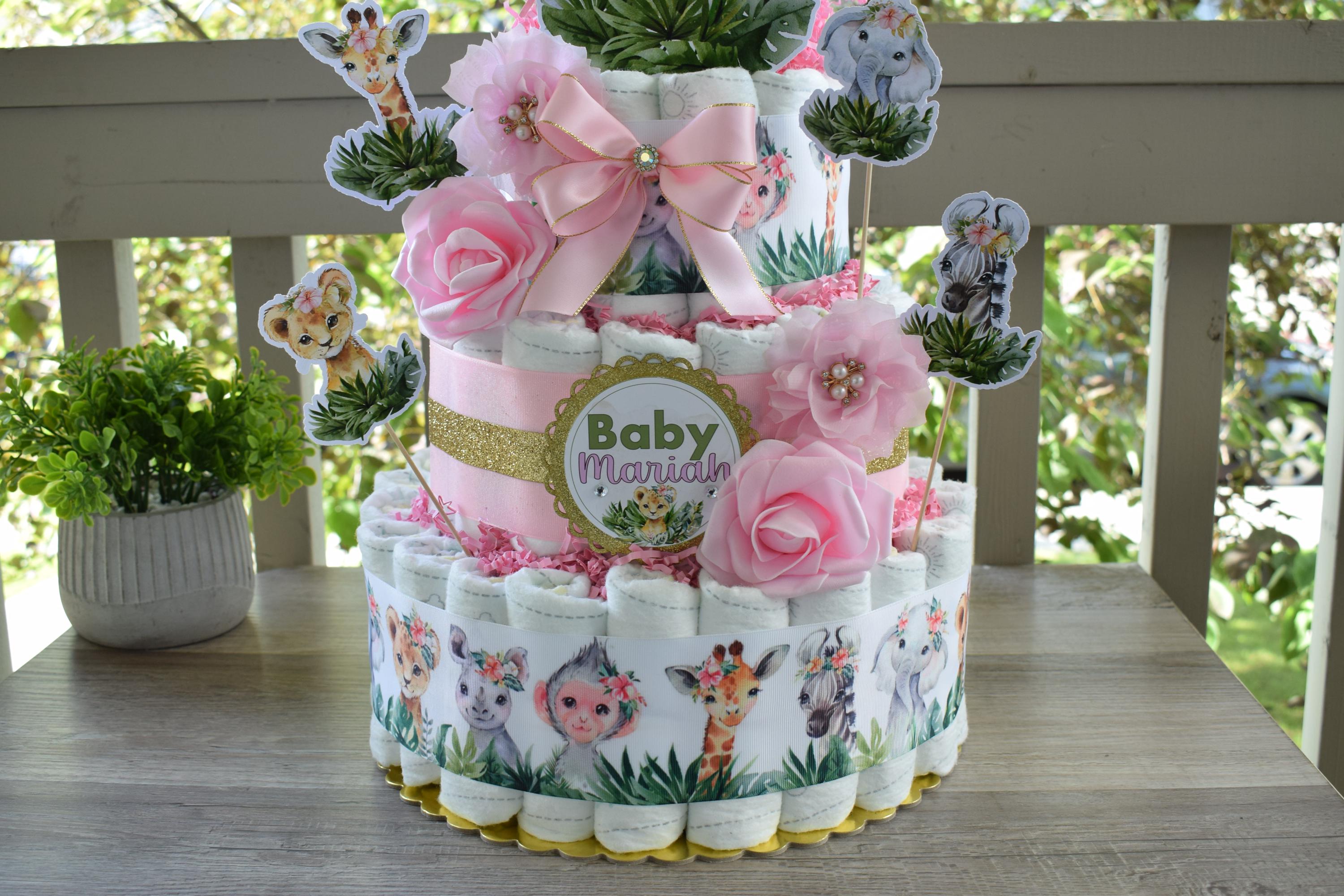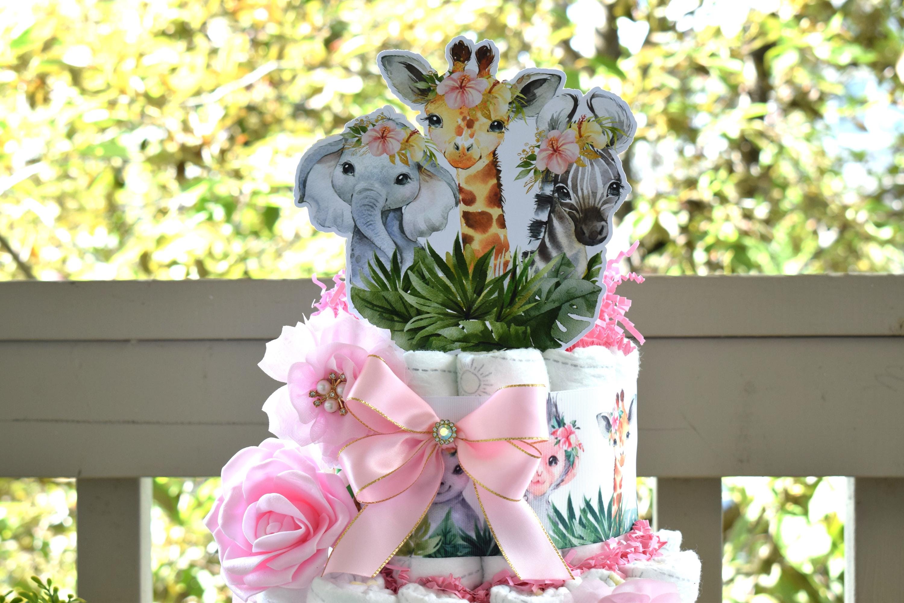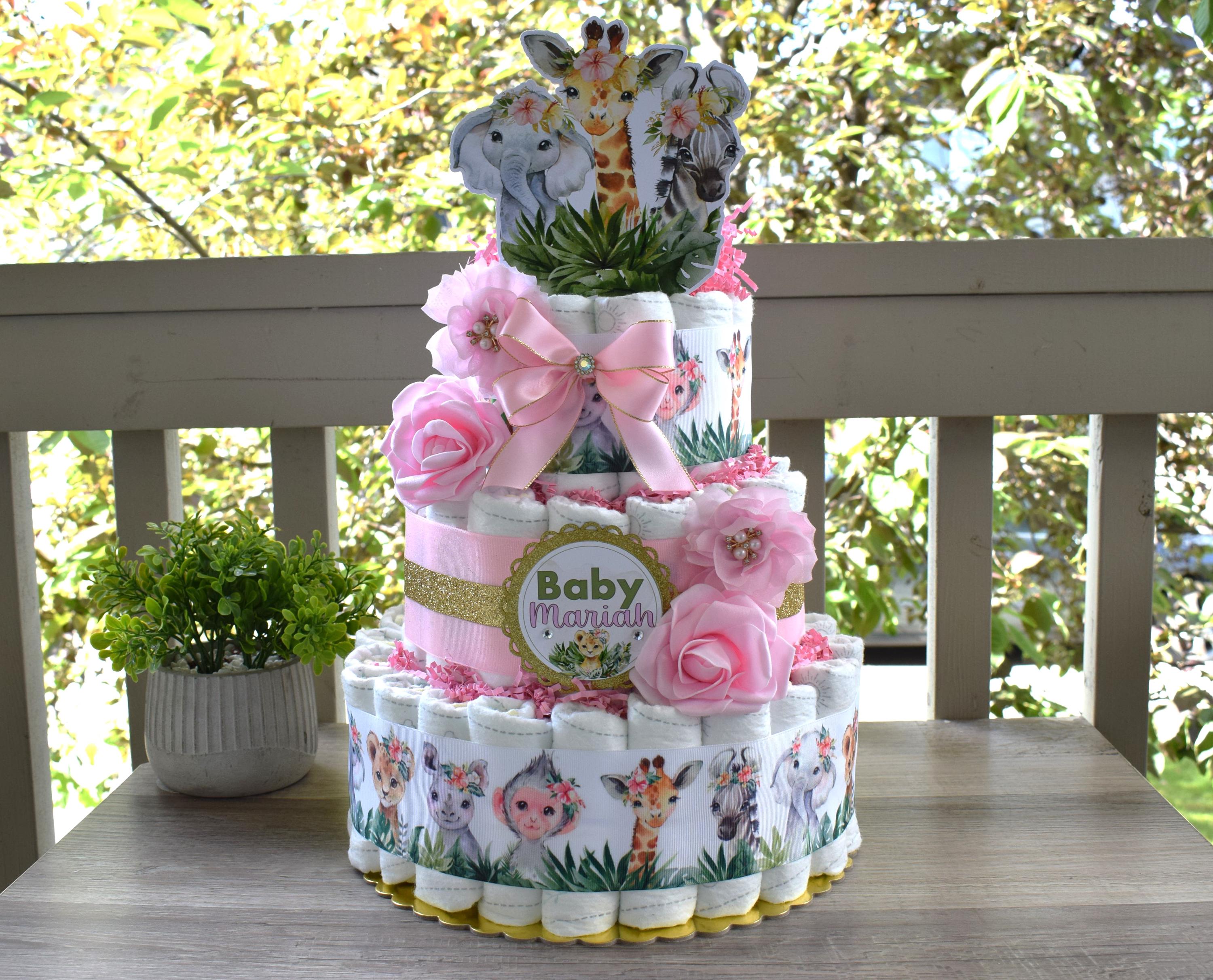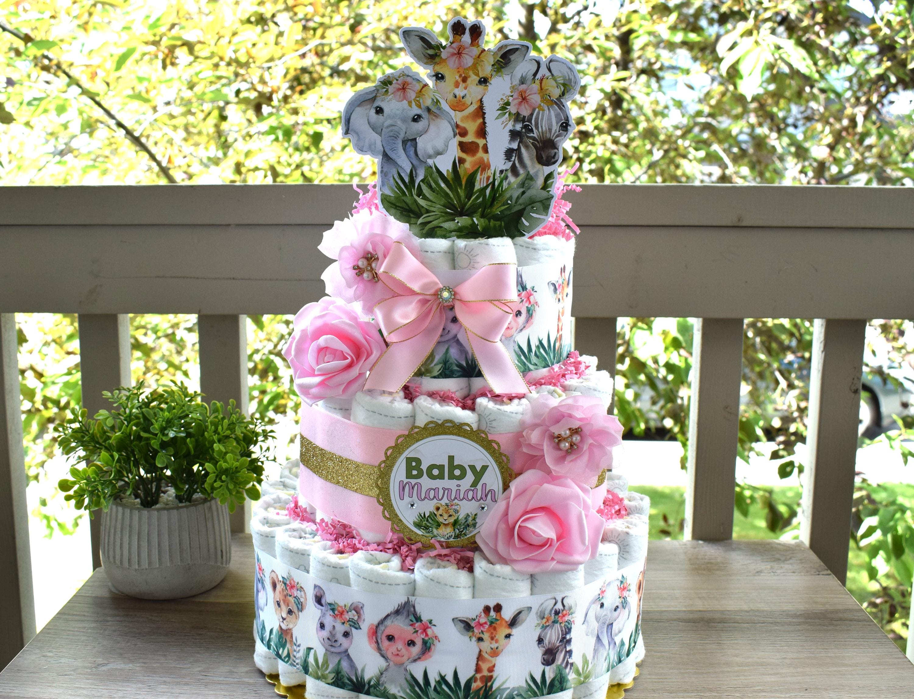 Girl Jungle Safari Mini Diaper Cake Baby Shower, Pink Baby Shower Centerpieces Decorations, Girls Room Nursery Decor, New Mom Gifts - S0001