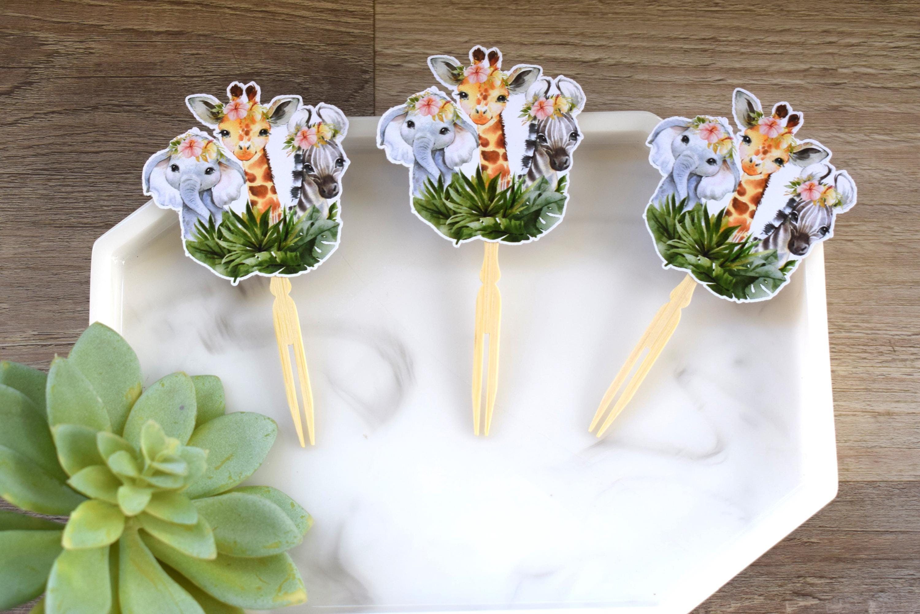 12 Girl Animal Safari Cupcake Toppers, Baby Shower, Party, Cupcake, Giraffe Zebra Elephant, Baby Shower Decorations - S0001