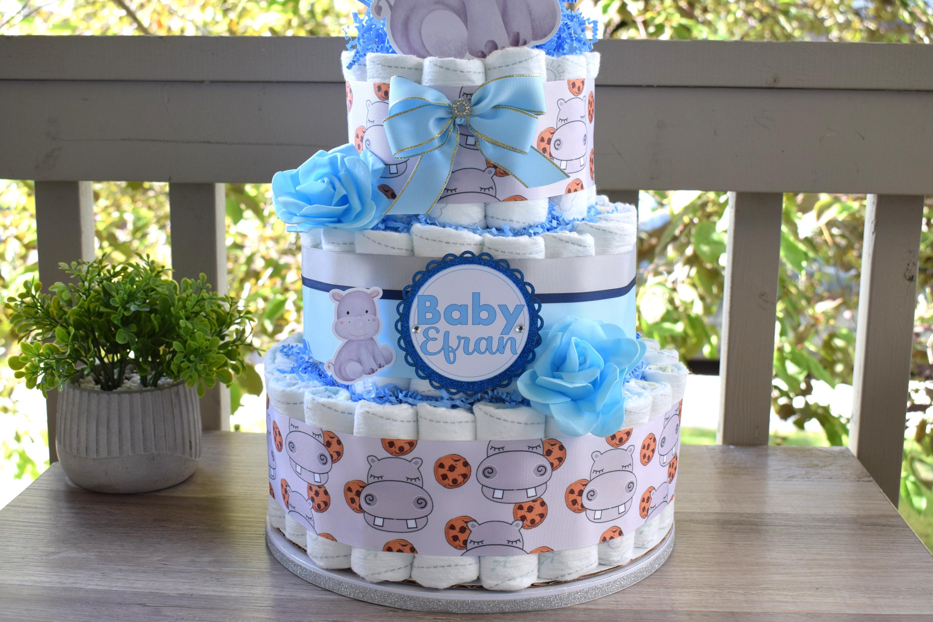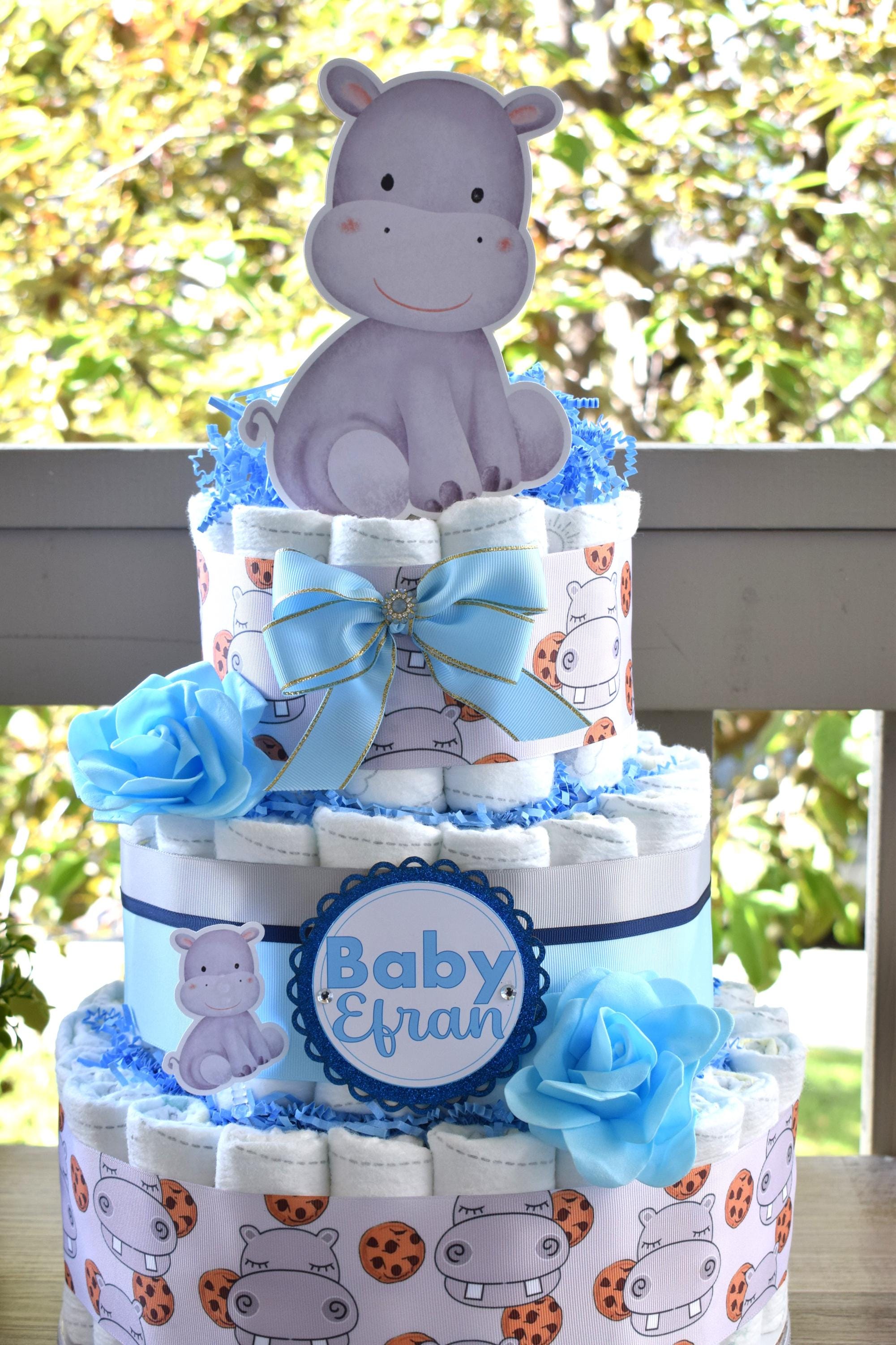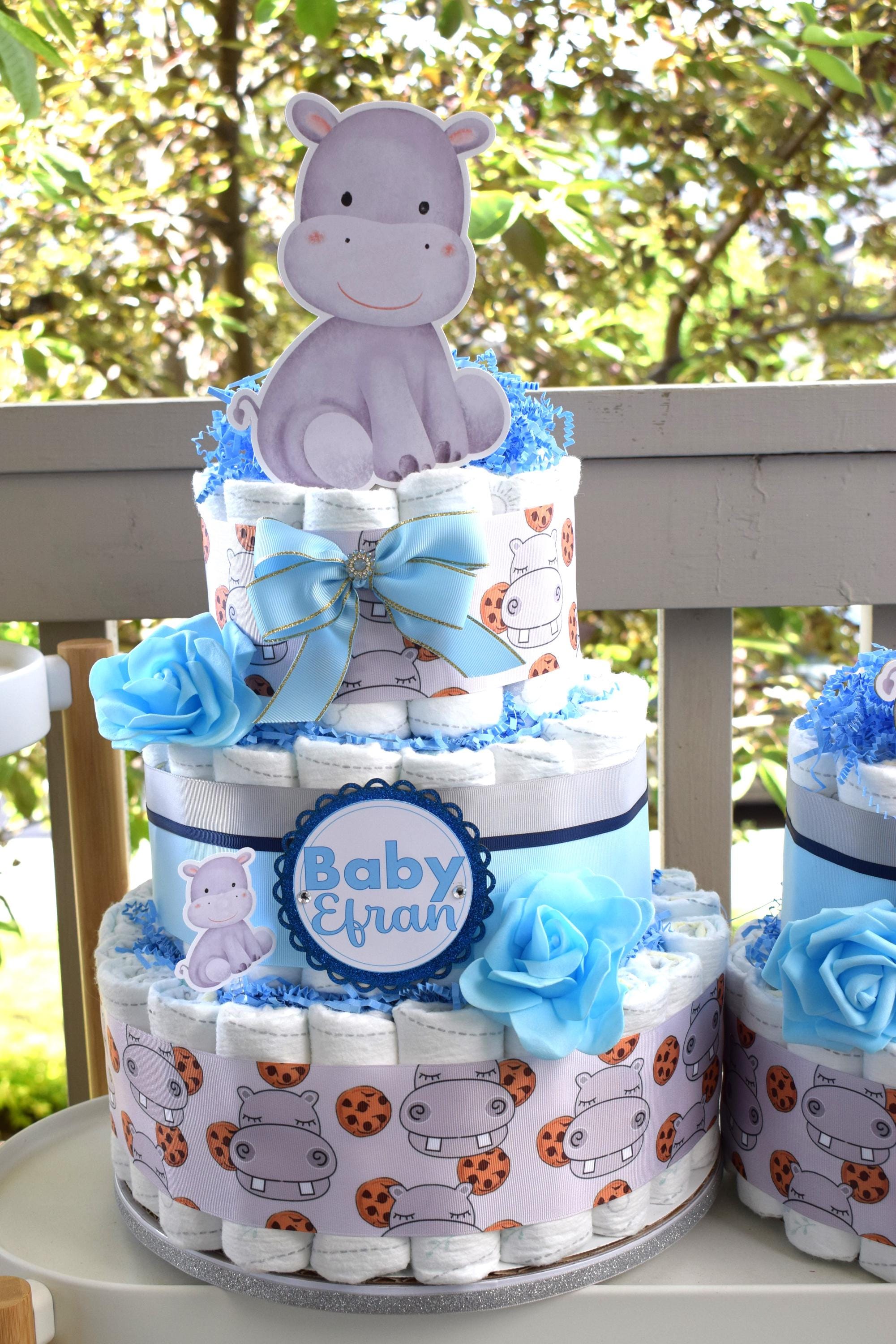 Rhino Baby Shower Diaper Cake, 3 Tier Diaper Cake Centerpieces Decor, Boy Rhino Baby Shower, Room Nursery Decor, New Mom Gifts - S00024