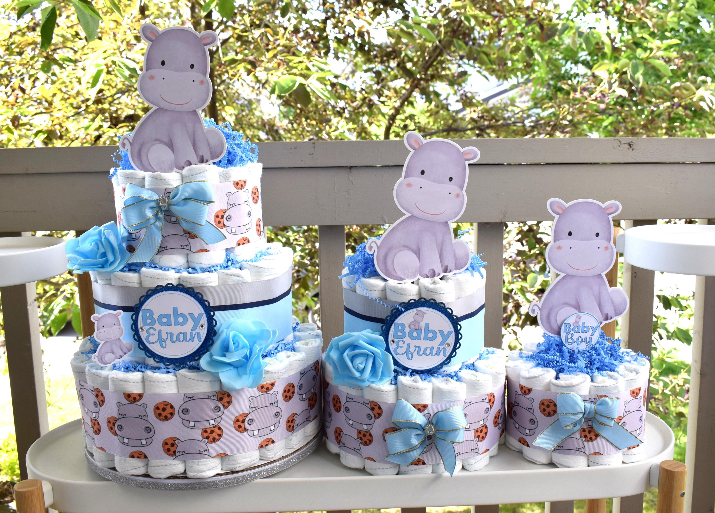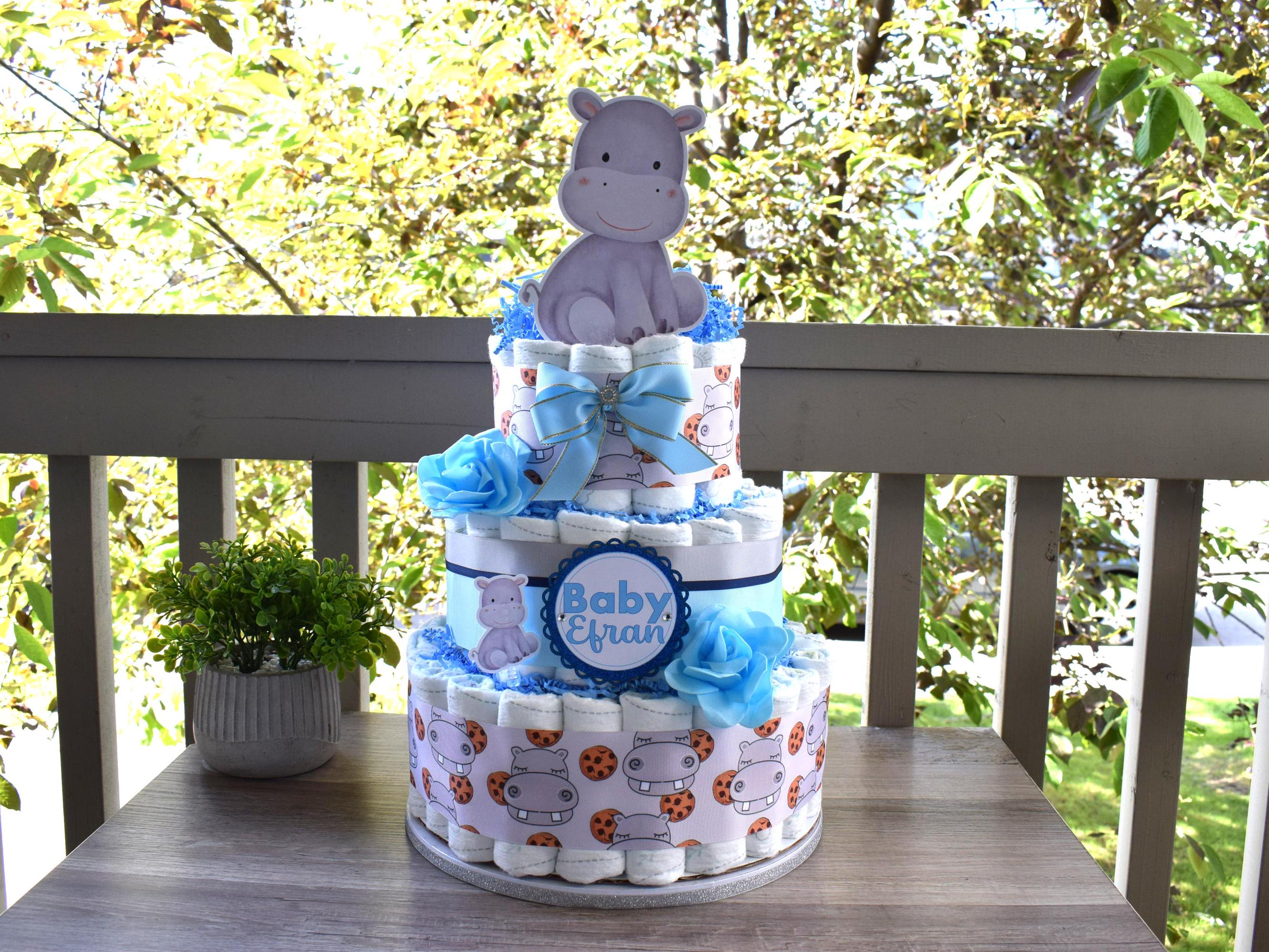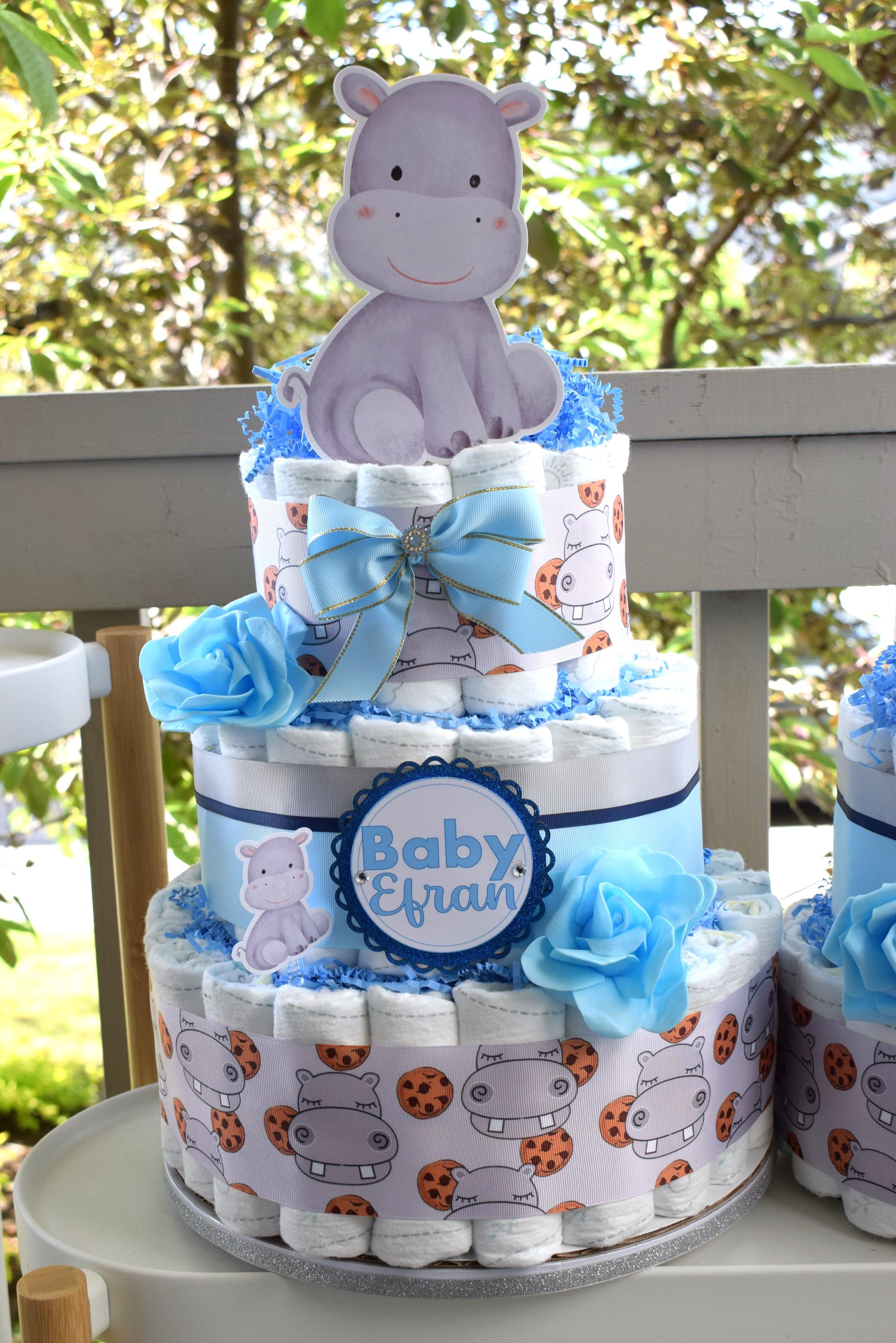 Rhino Baby Shower Diaper Cake, 3 Tier Diaper Cake Centerpieces Decor, Boy Rhino Baby Shower, Room Nursery Decor, New Mom Gifts - S00024