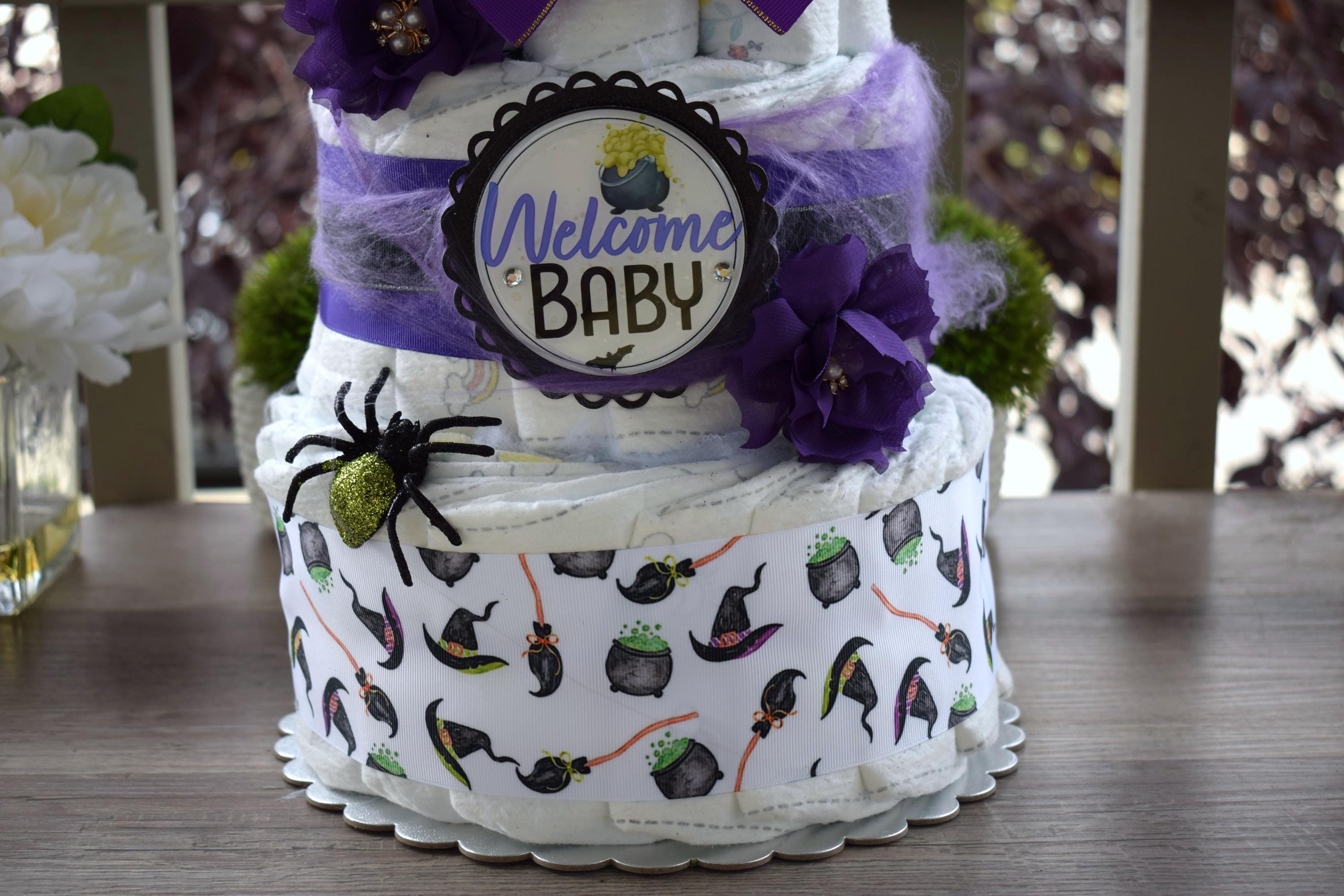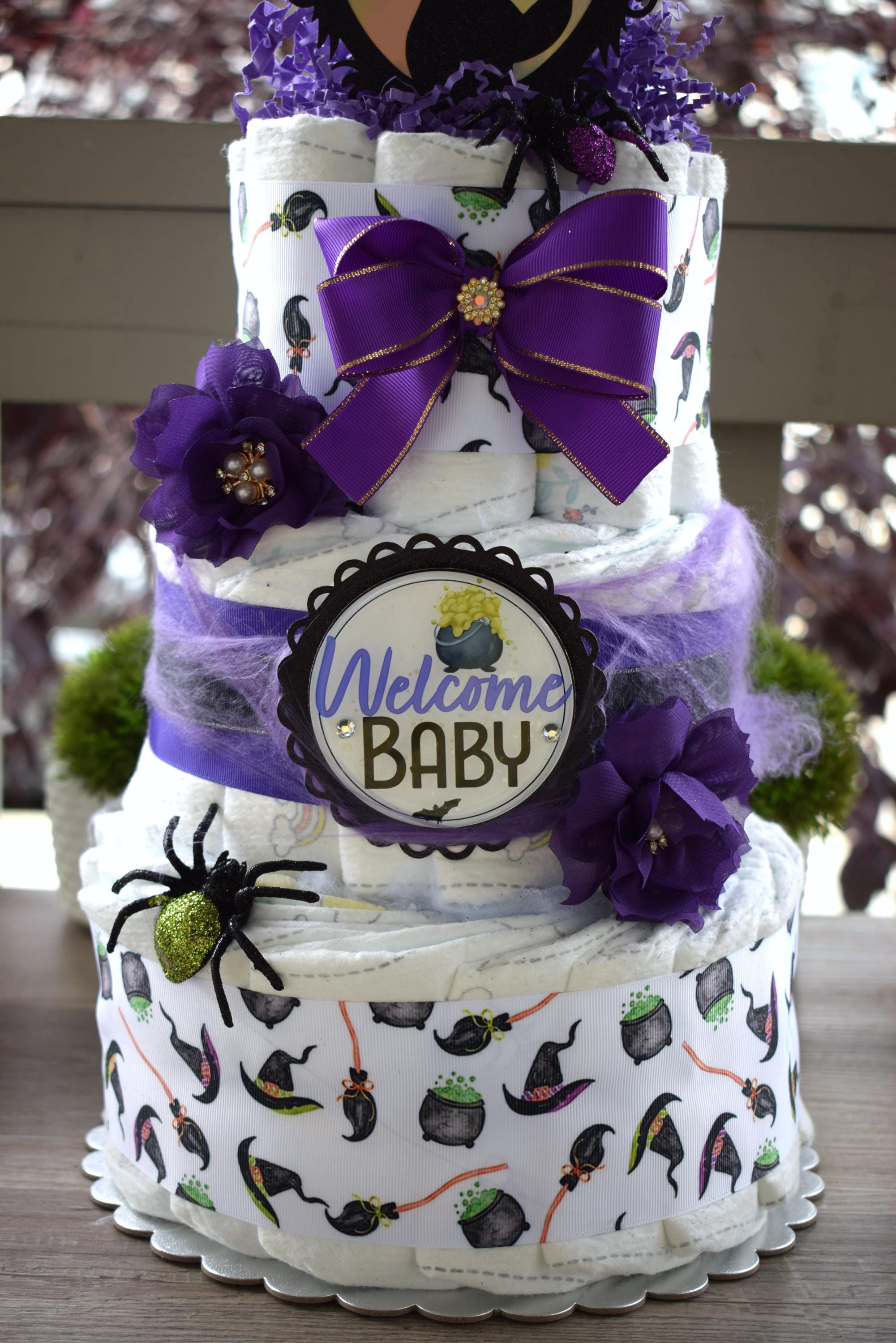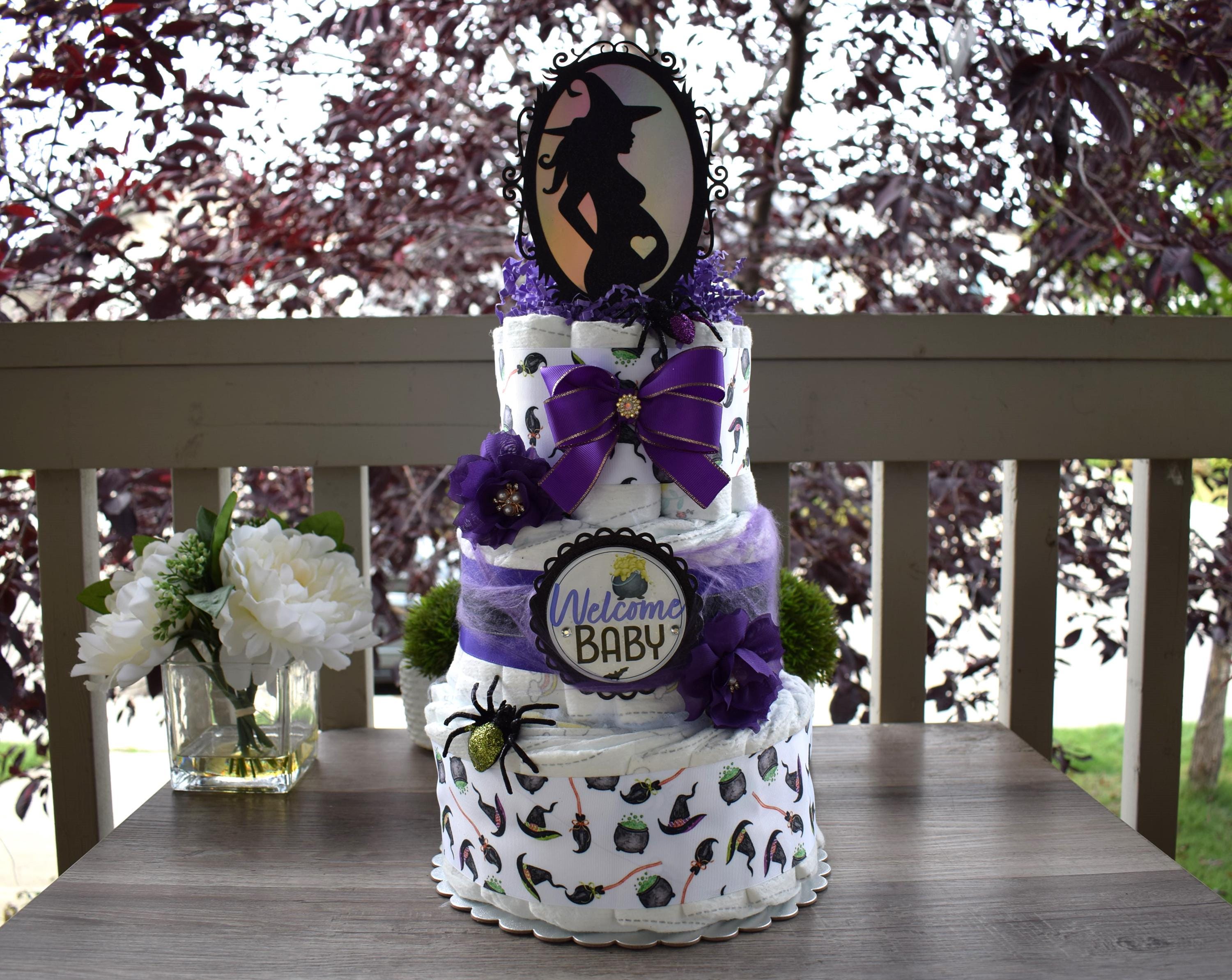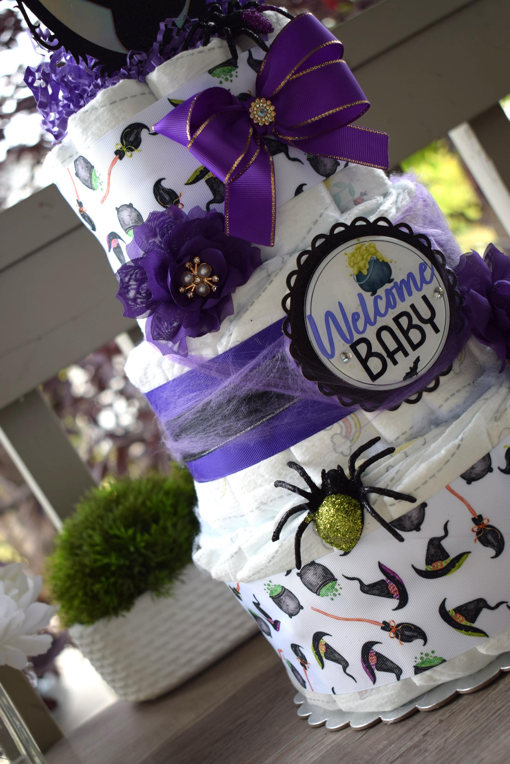❤ This DIAPER CAKE is decorated with Witchcraft theme in Purple, white & black colors.