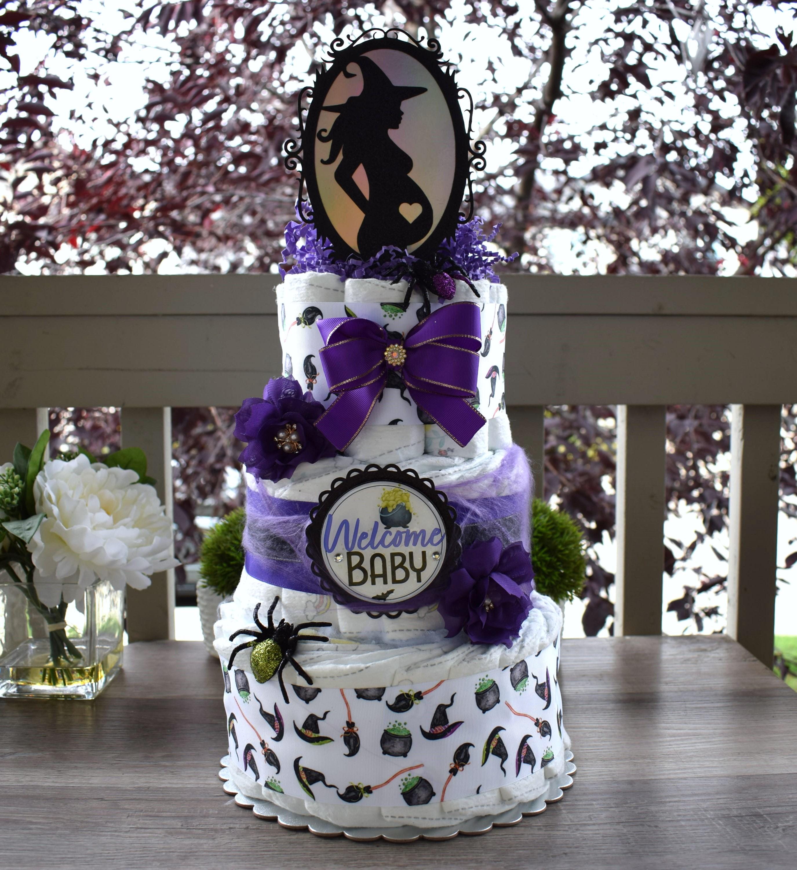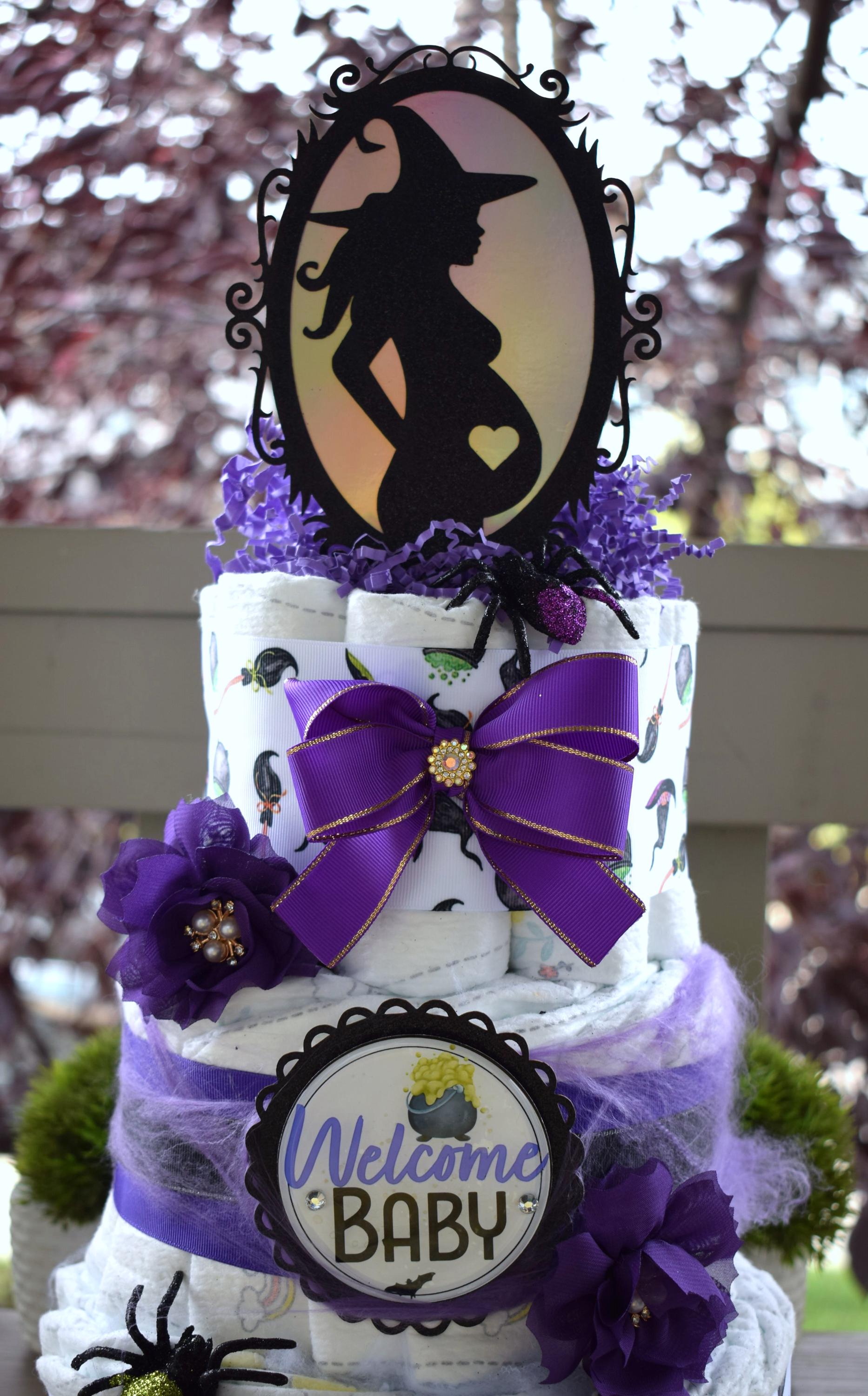 This Gorgeous Pregnant Witch Diaper 3 Tiers Cake is the perfect centerpieces for your baby shower. We can match any shower theme.