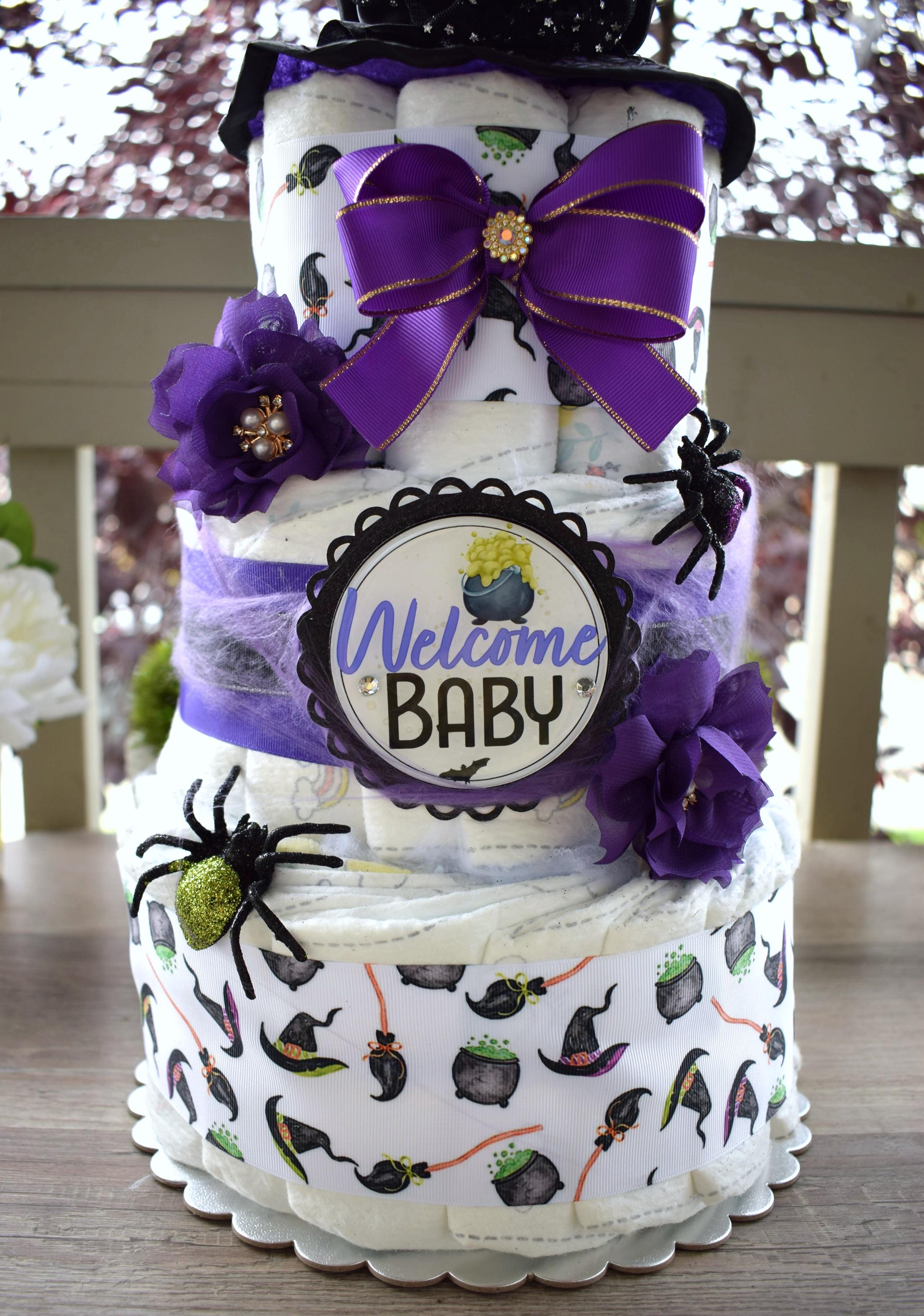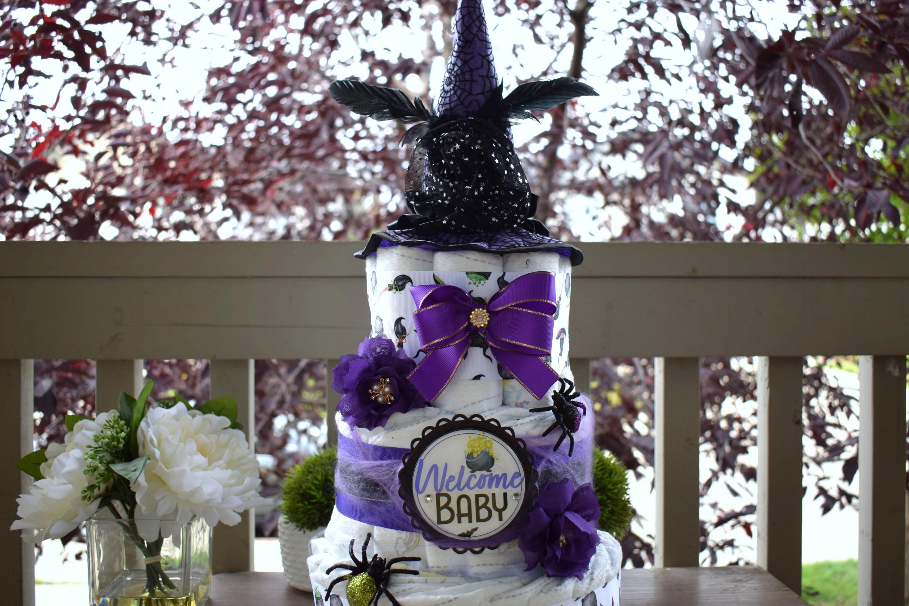❤ This DIAPER CAKE is decorated with Witchcraft theme in Purple, white & black colors.