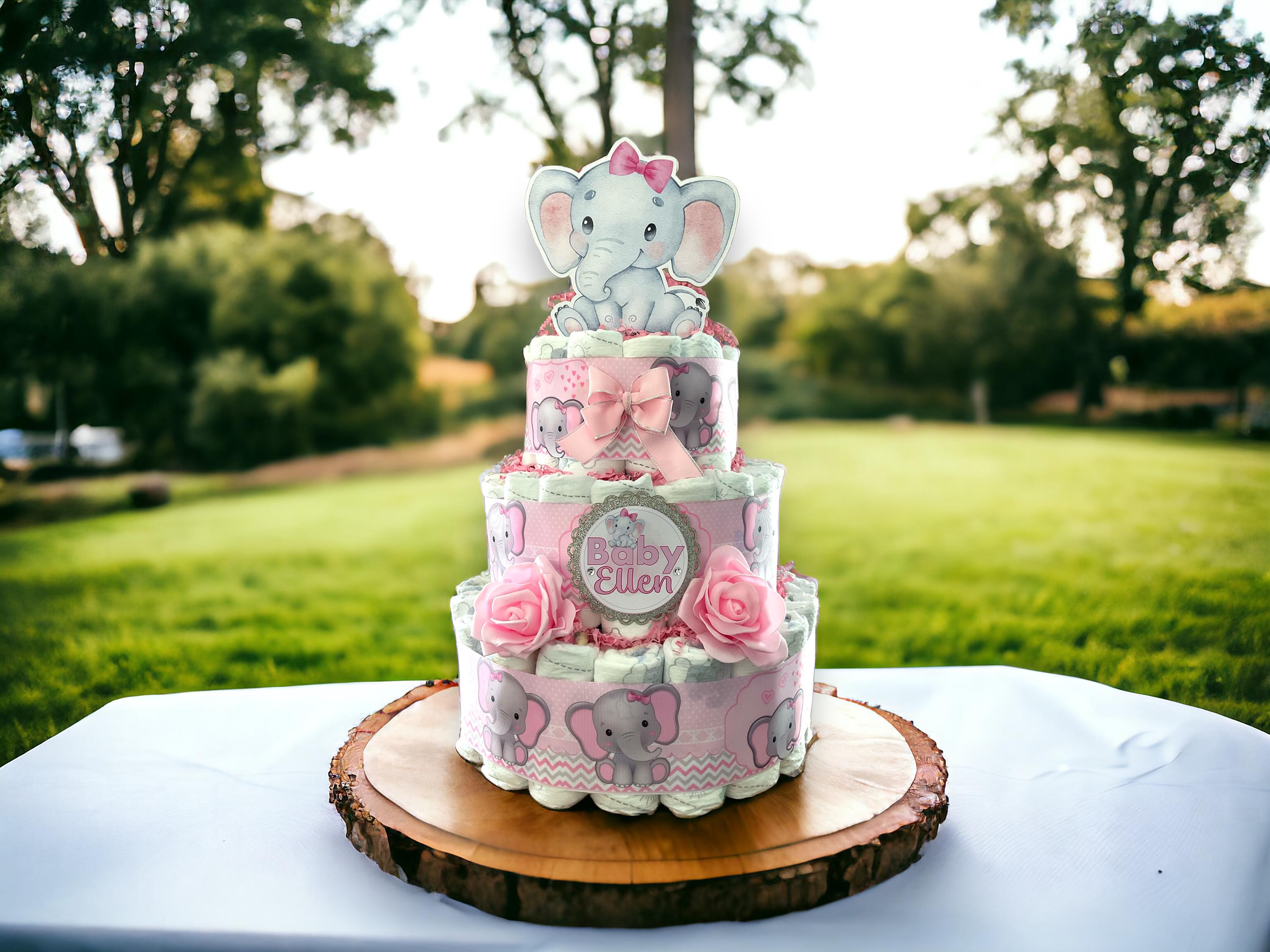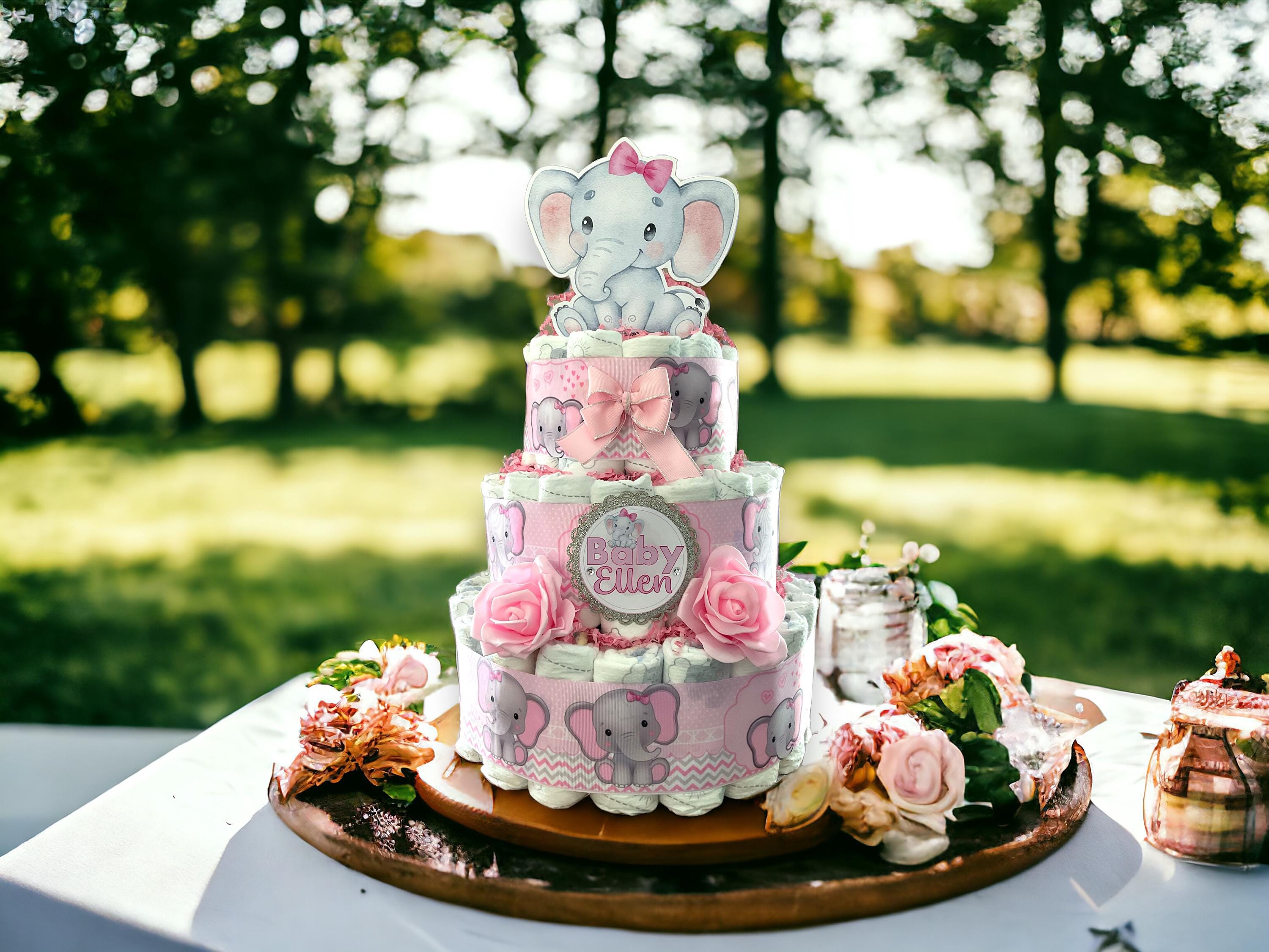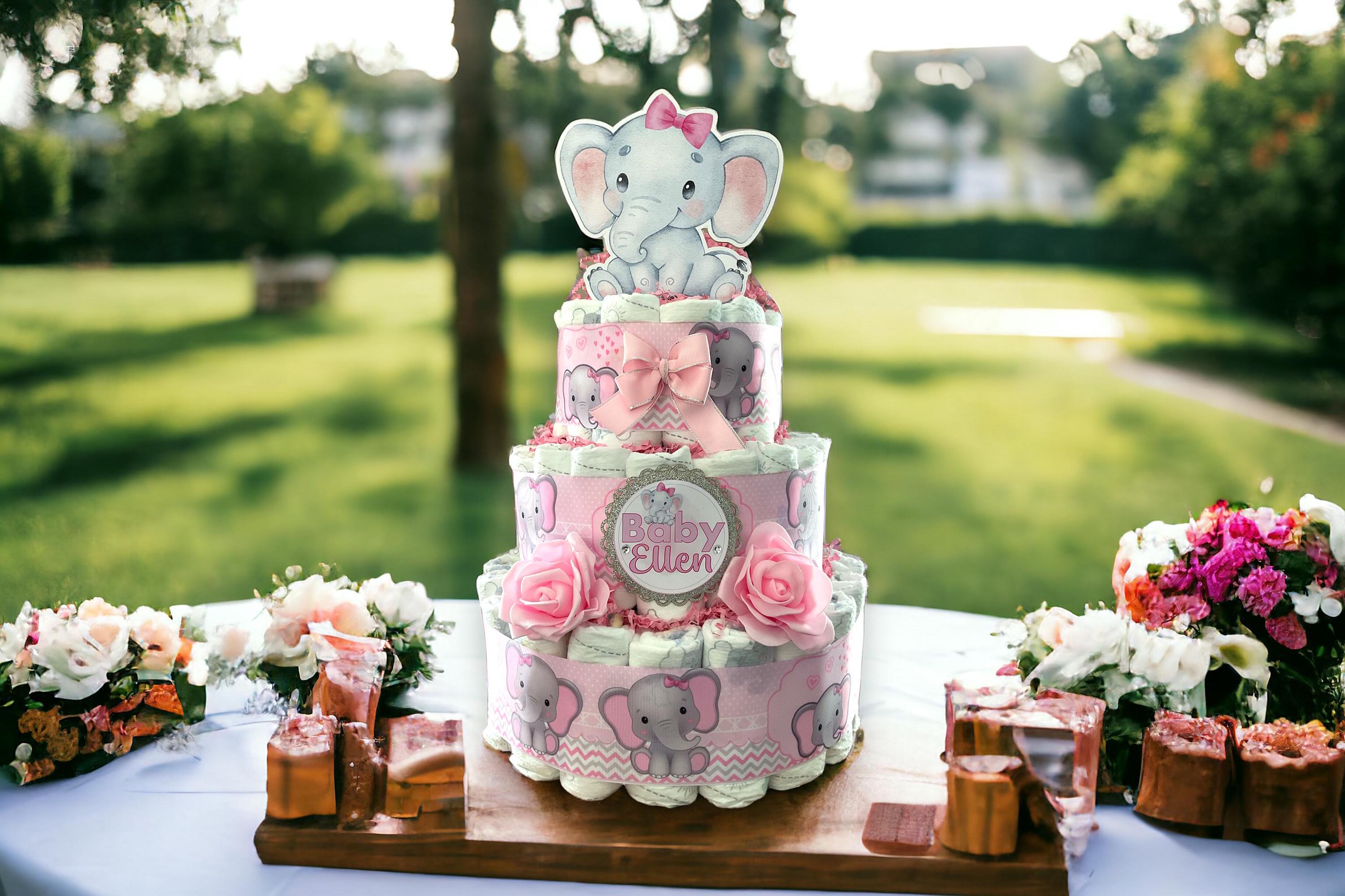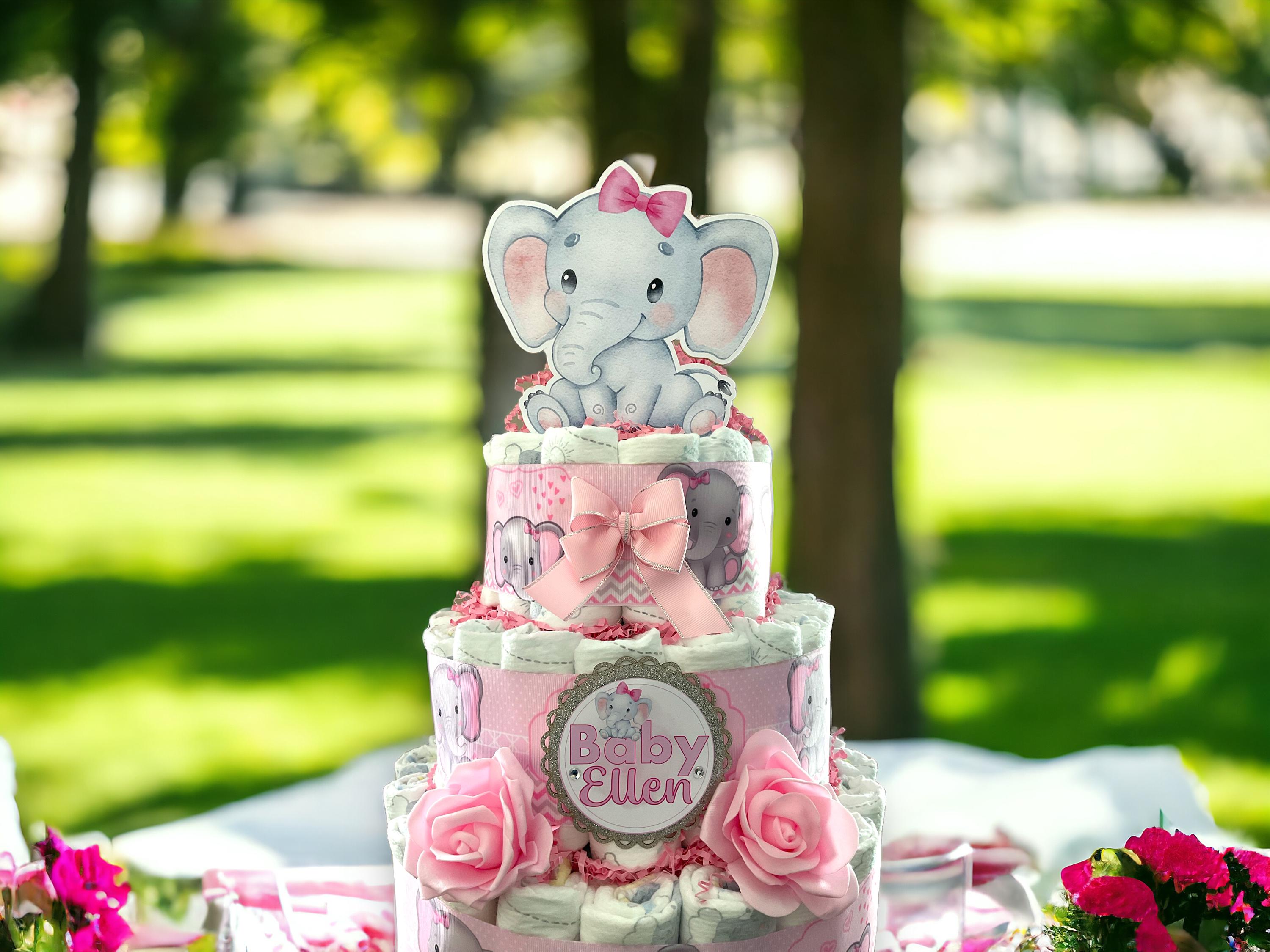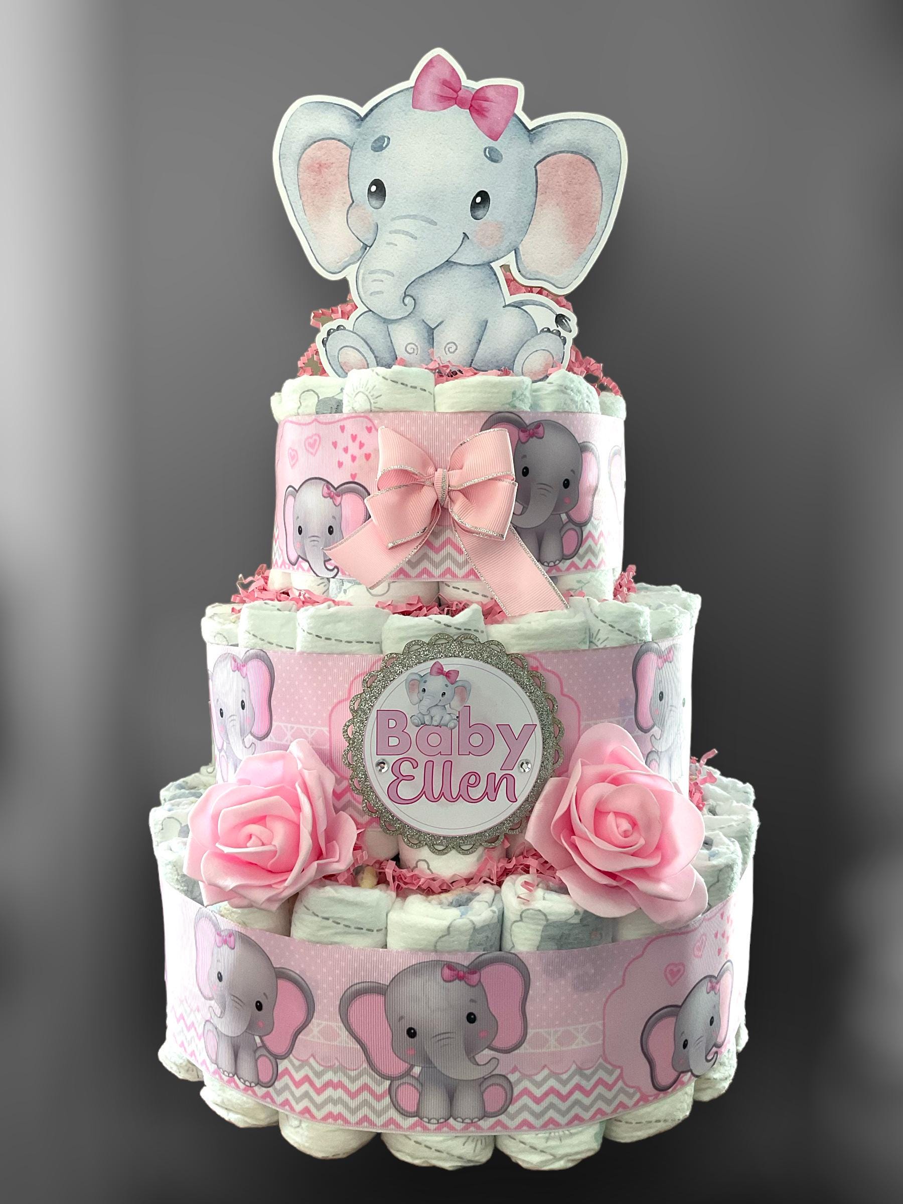 This Gorgeous Girl Elephant Diaper 3 Tiers Cake are the perfect centerpieces for your baby shower. We can match any shower theme.
