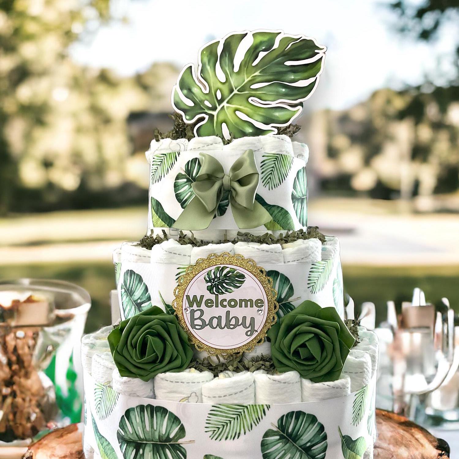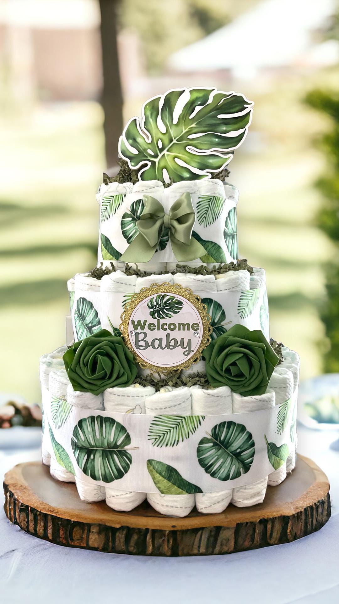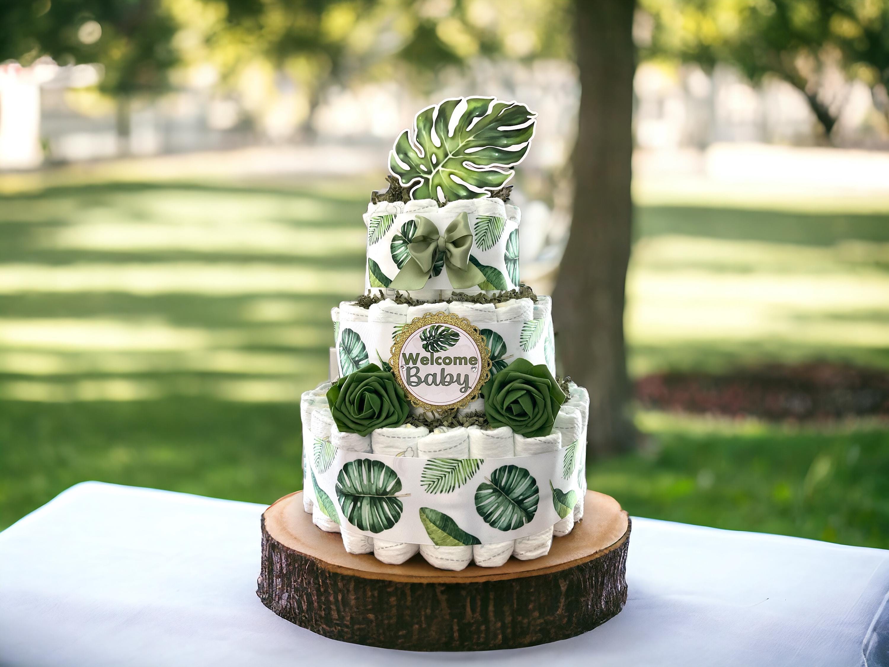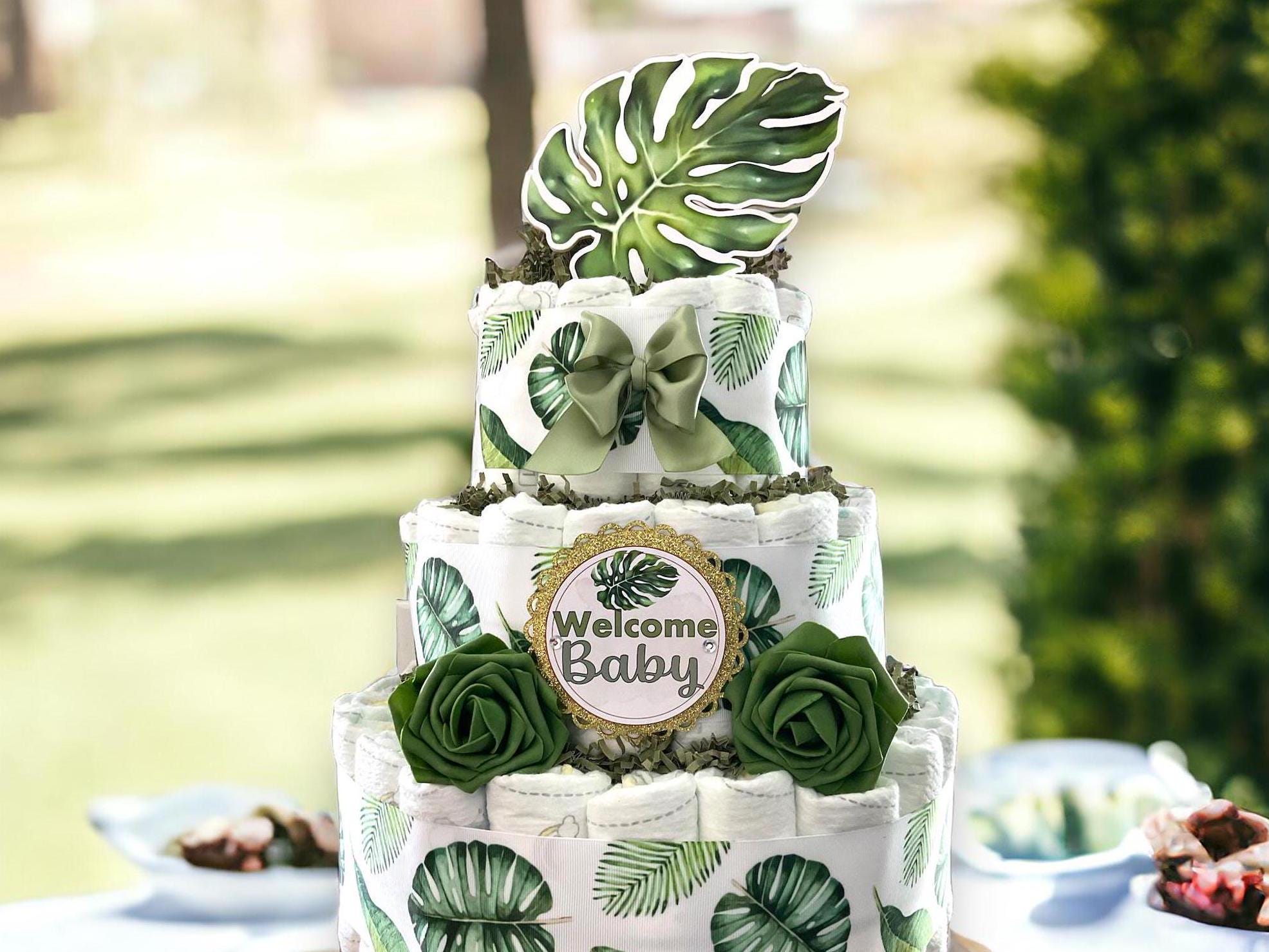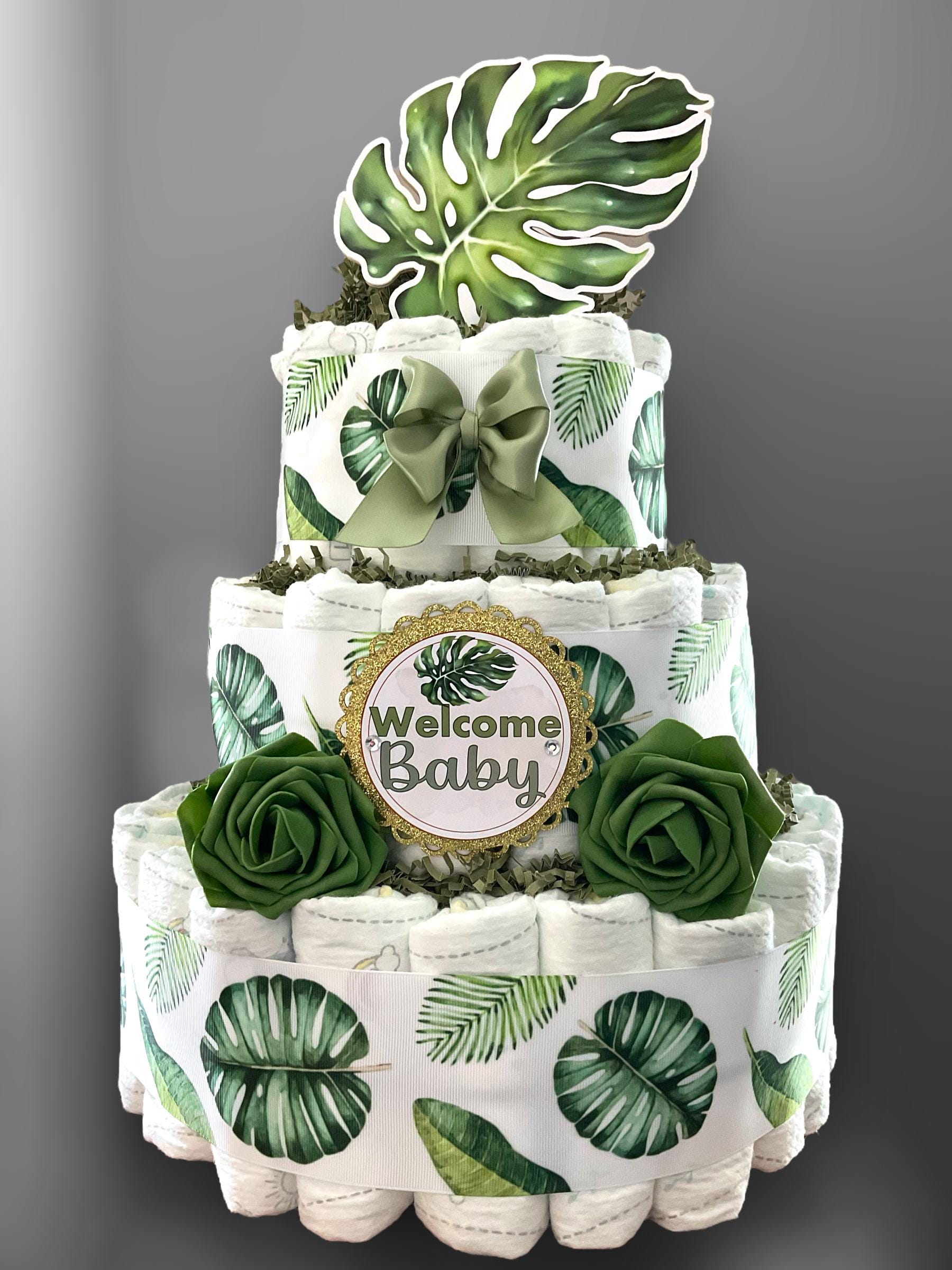 Greenery Diaper Cake Baby Shower, Green Leave Cake Centerpieces Decor, Greenery, Room Nursery Decor, New Mom Gifts II 3 Tier Diaper