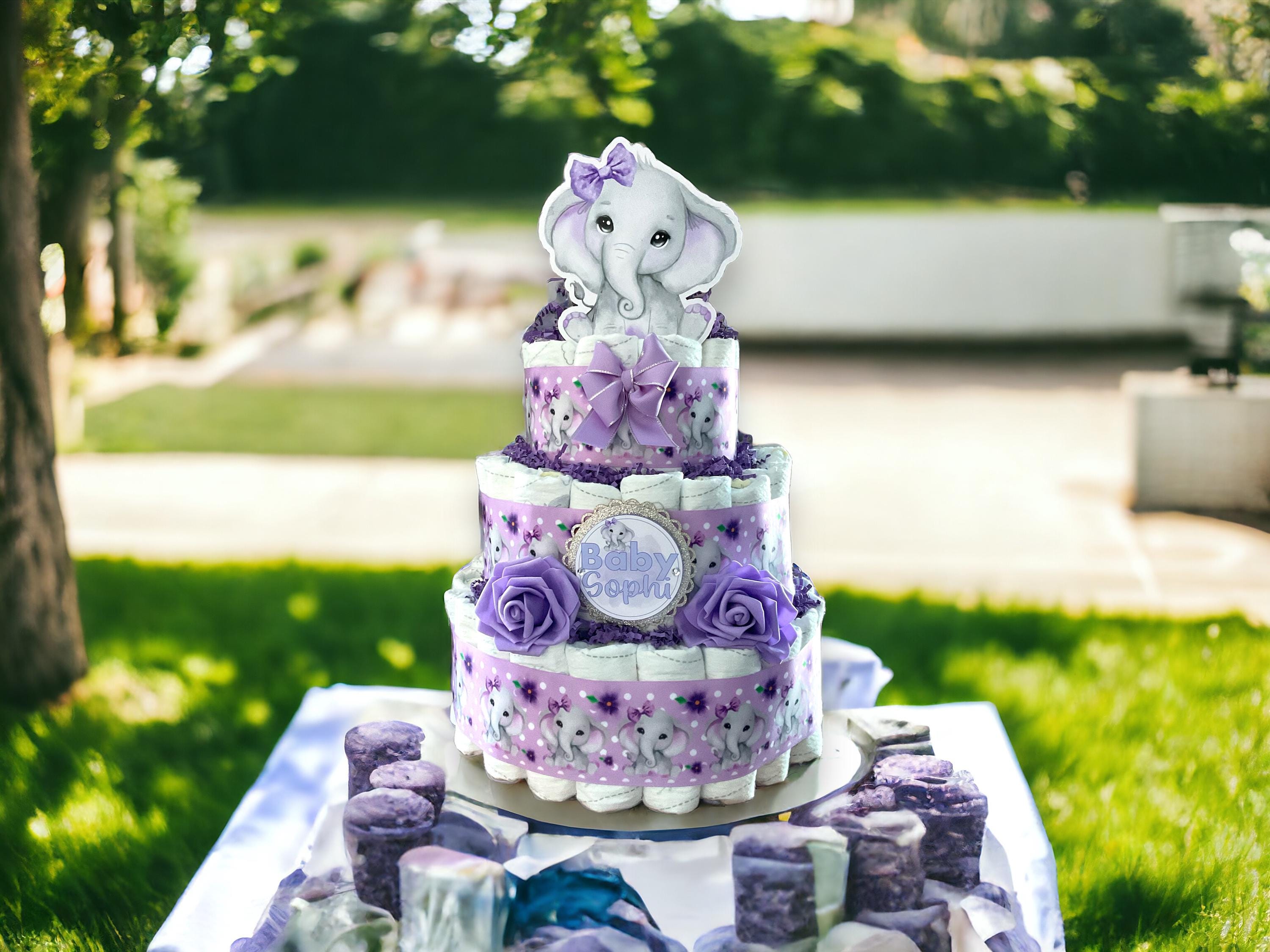 This Gorgeous Girl Elephant Diaper 3 Tiers Cake are the perfect centerpieces for your baby shower. We can match any shower theme.
