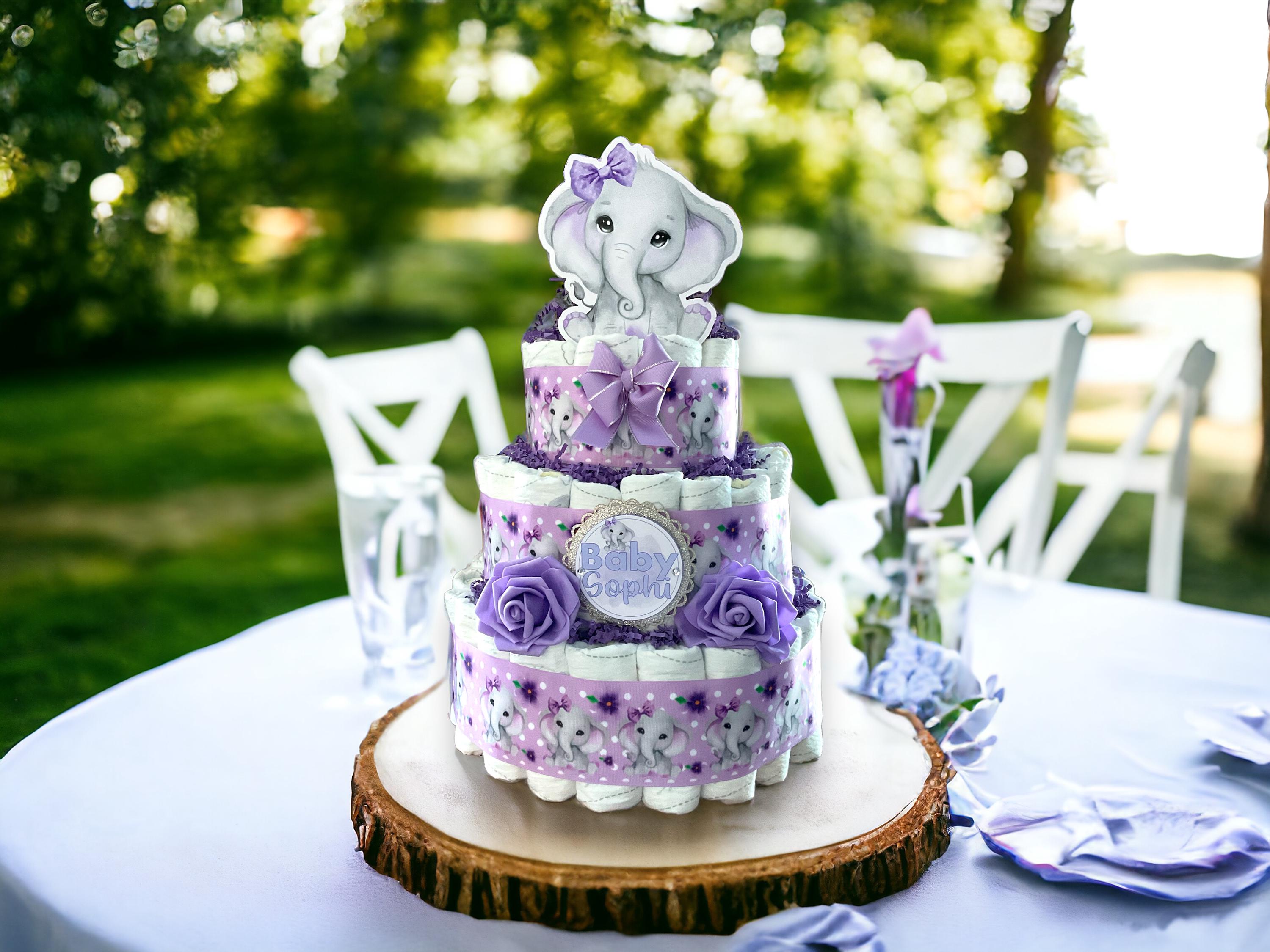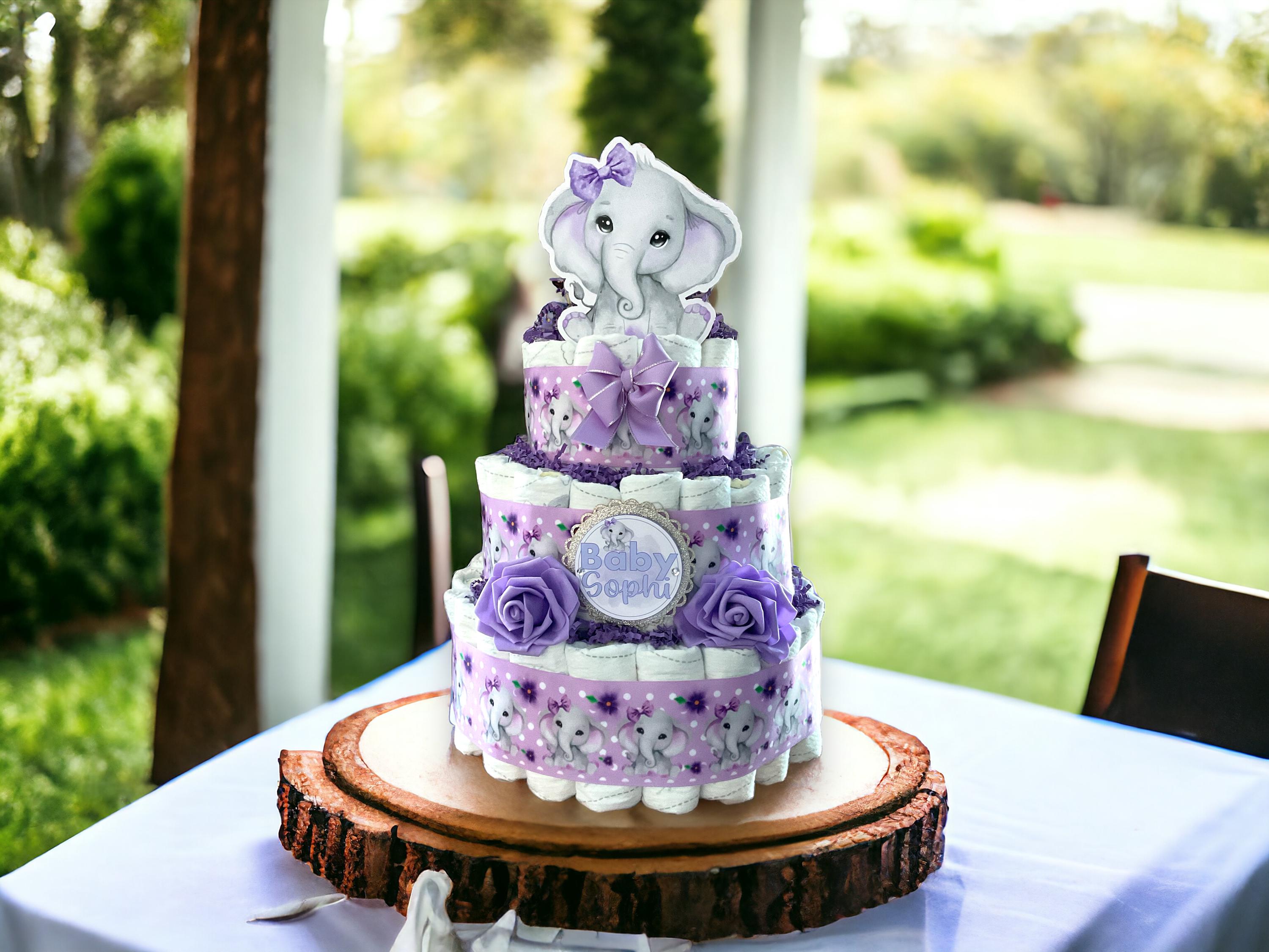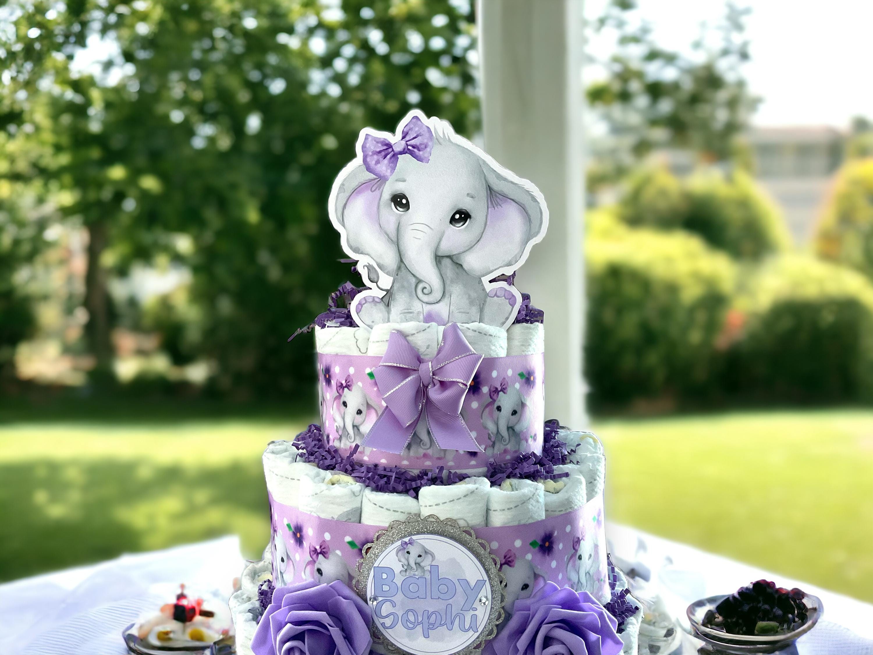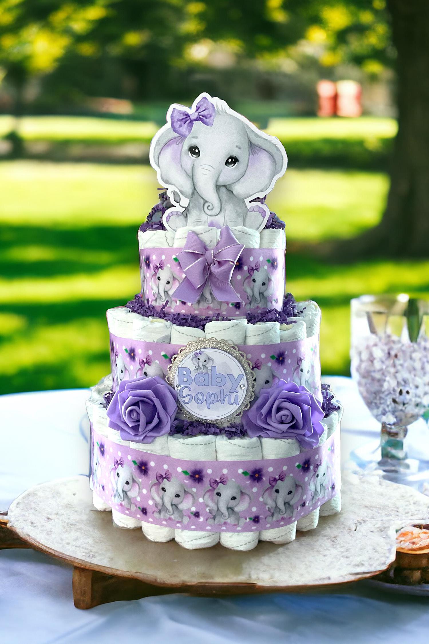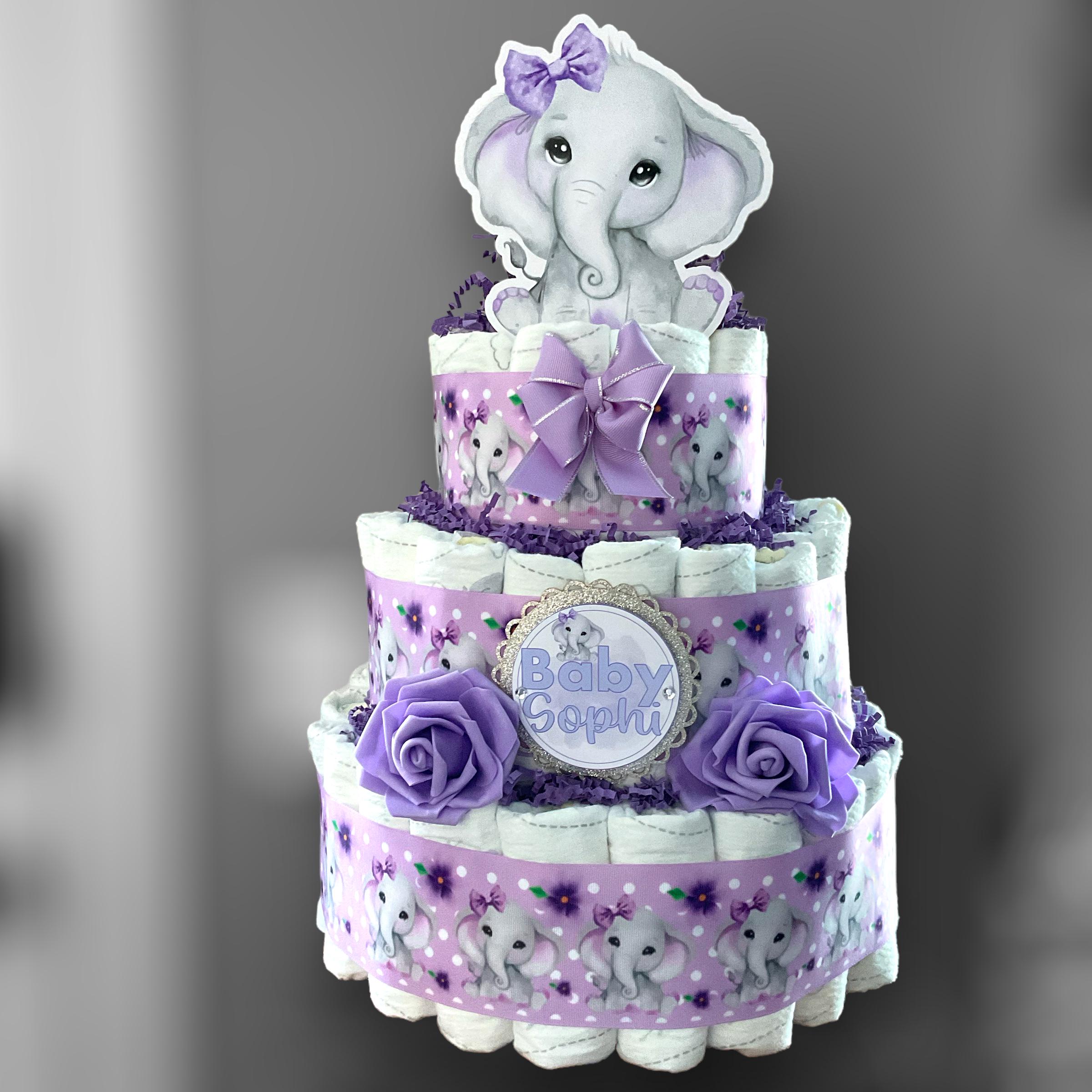 Lavender Elephant Diaper Cake Baby Shower, Girl Purple Elephant Centerpieces Decor, Room Nursery Decor, New Mom Gifts II 3 Tier Diaper Cake