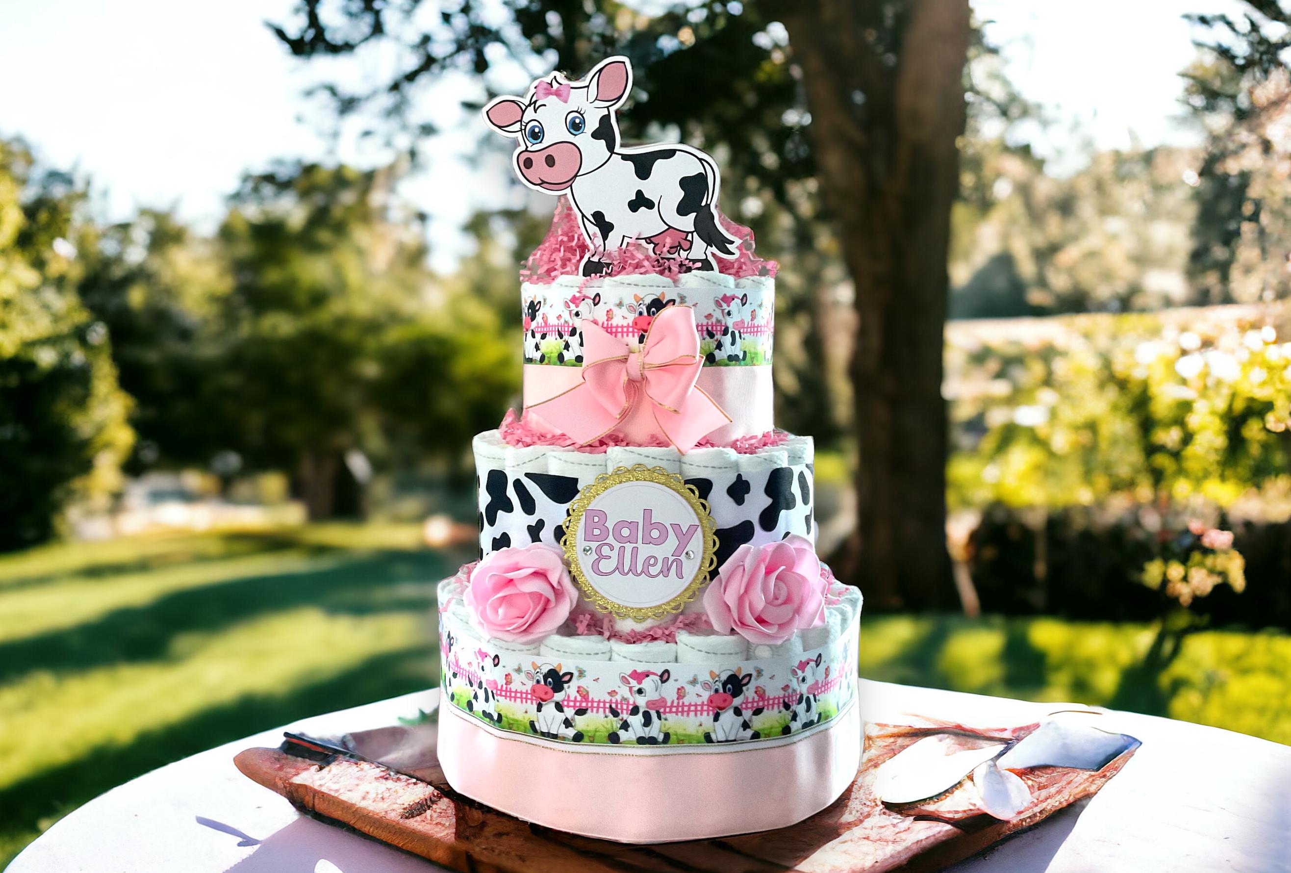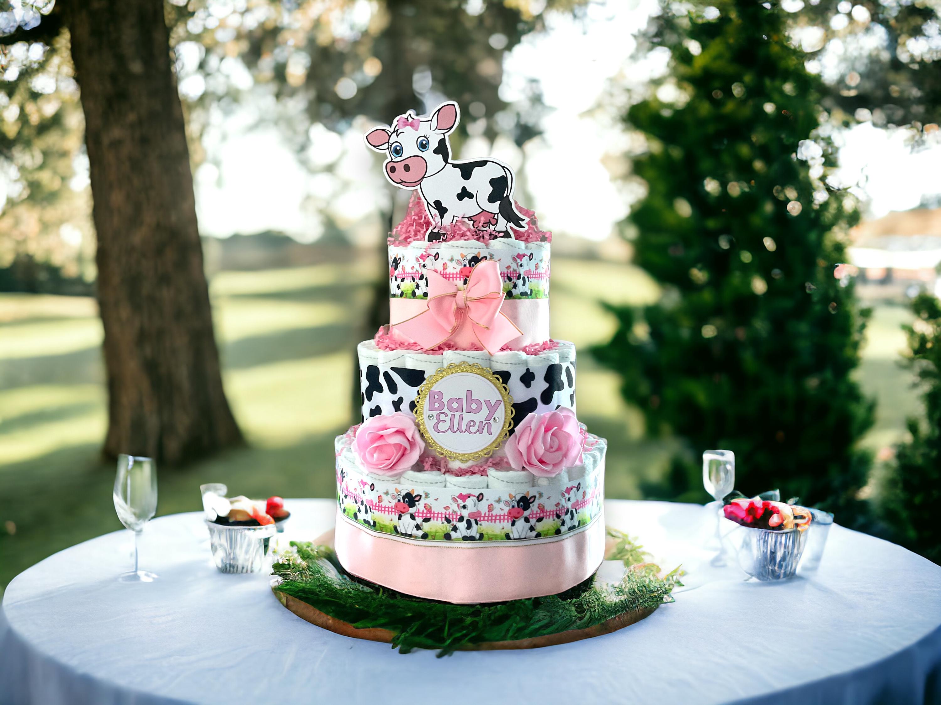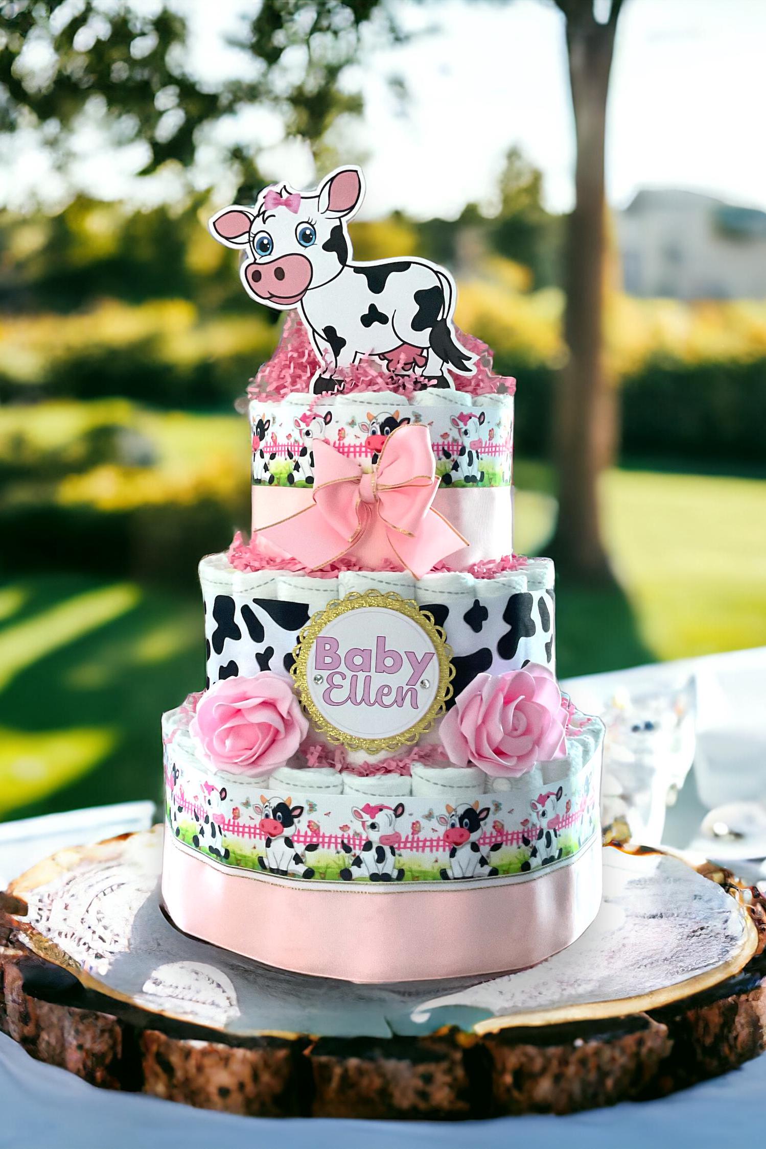 Pink Cow Diaper Cake Baby Shower, Cow Cake Centerpieces Decor, Girl Cow Room Nursery Decor, New Mom Gift II 3 Tier Diaper