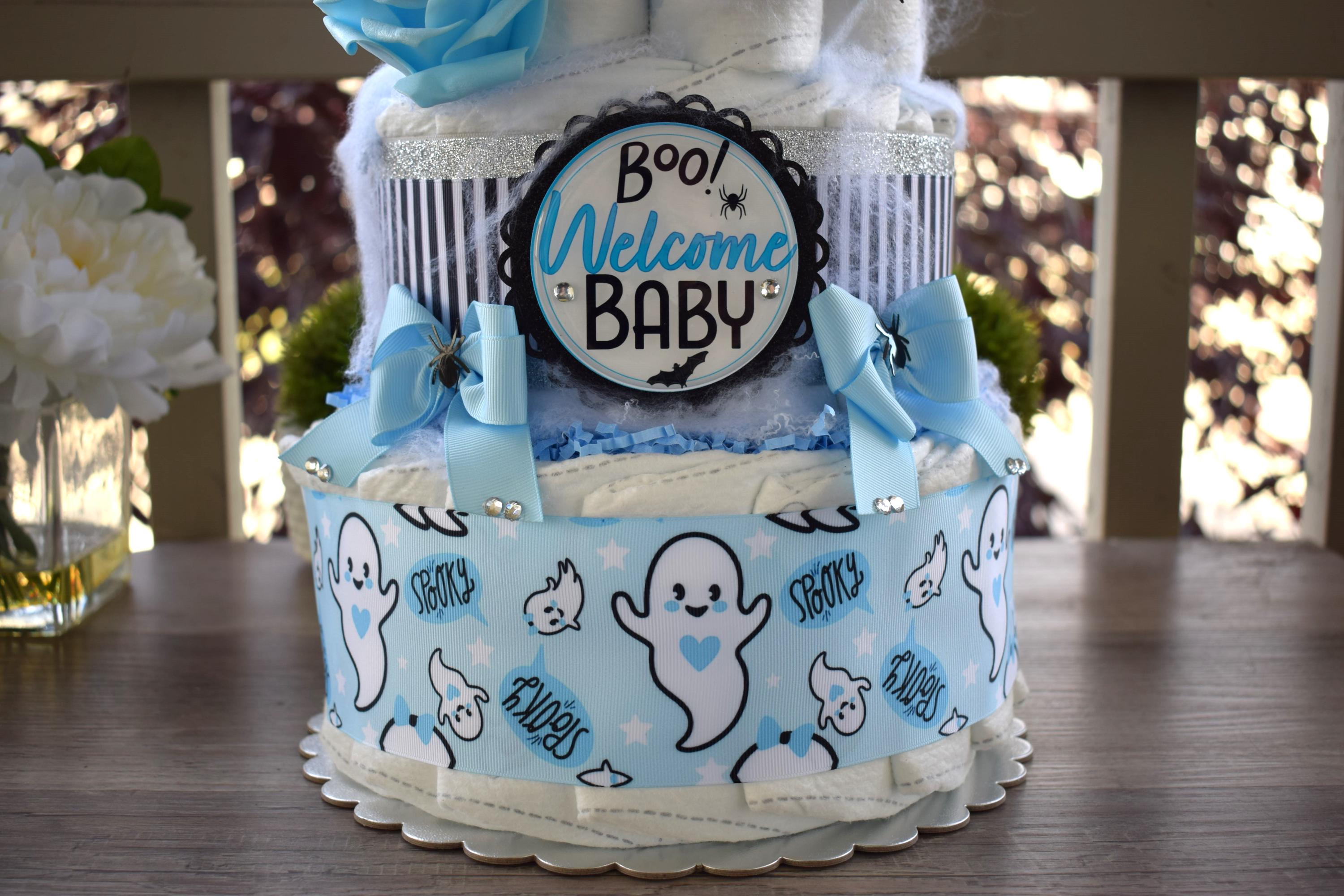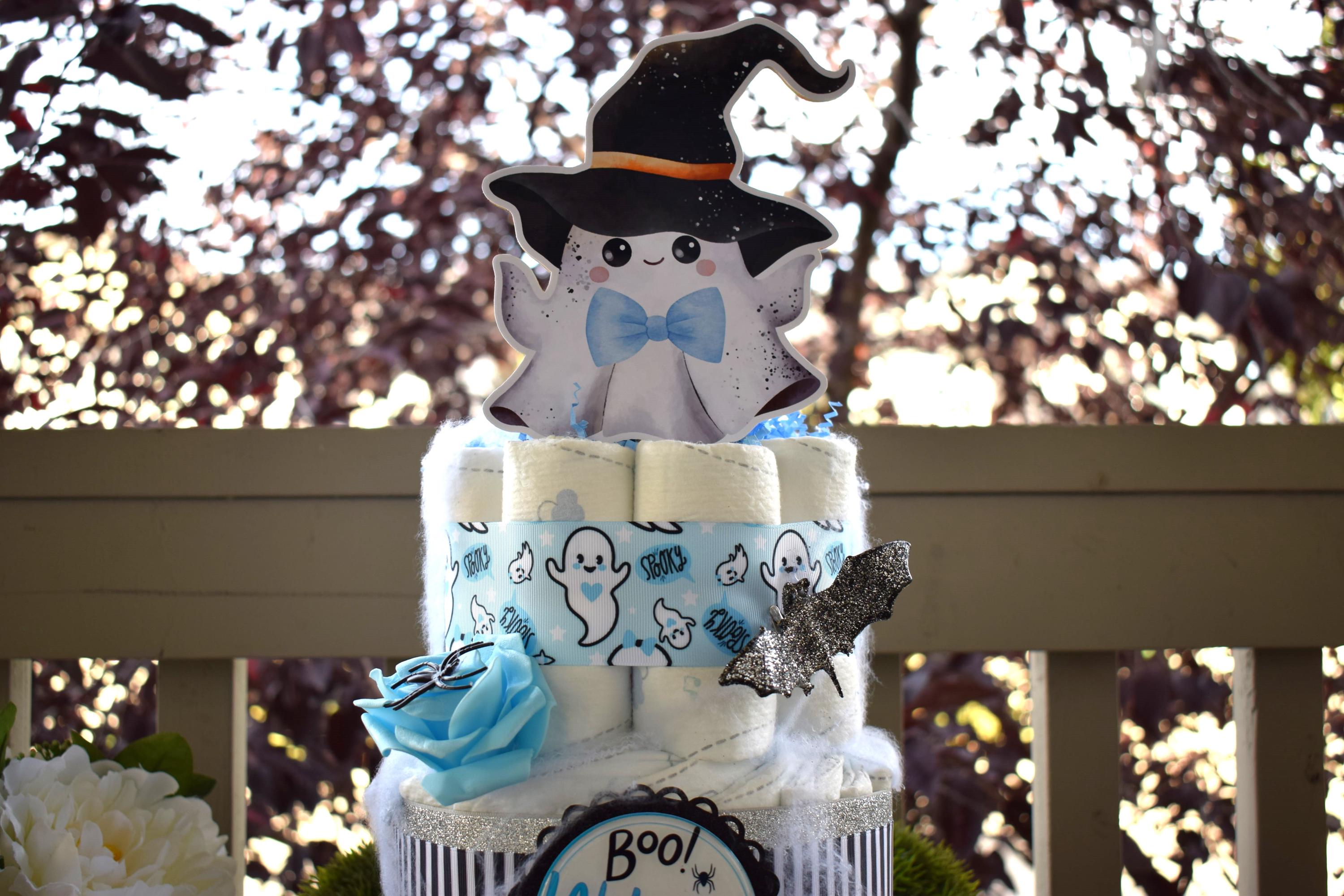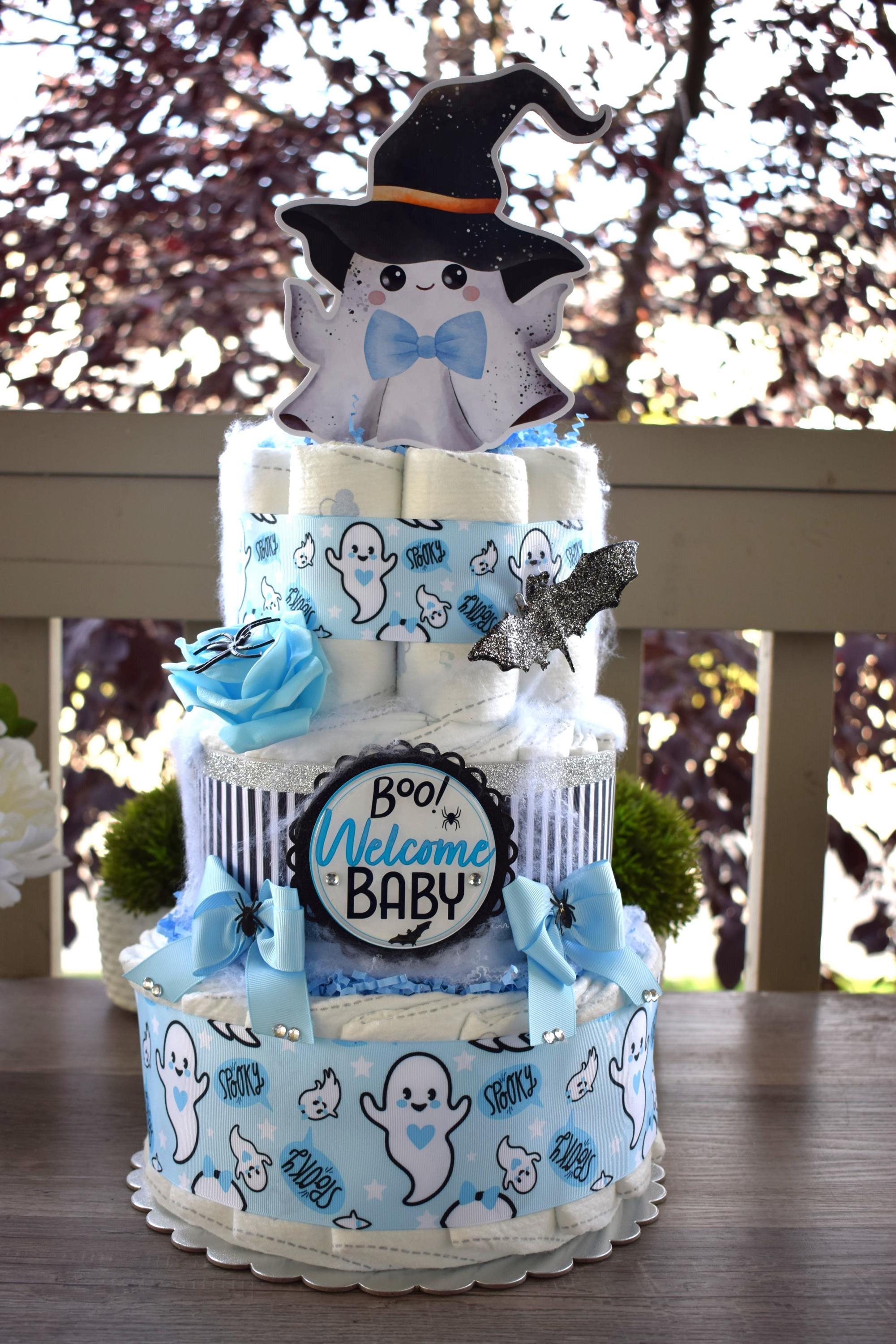 ❤ This DIAPER CAKE is decorated with ghost theme in blue, white & black colors.