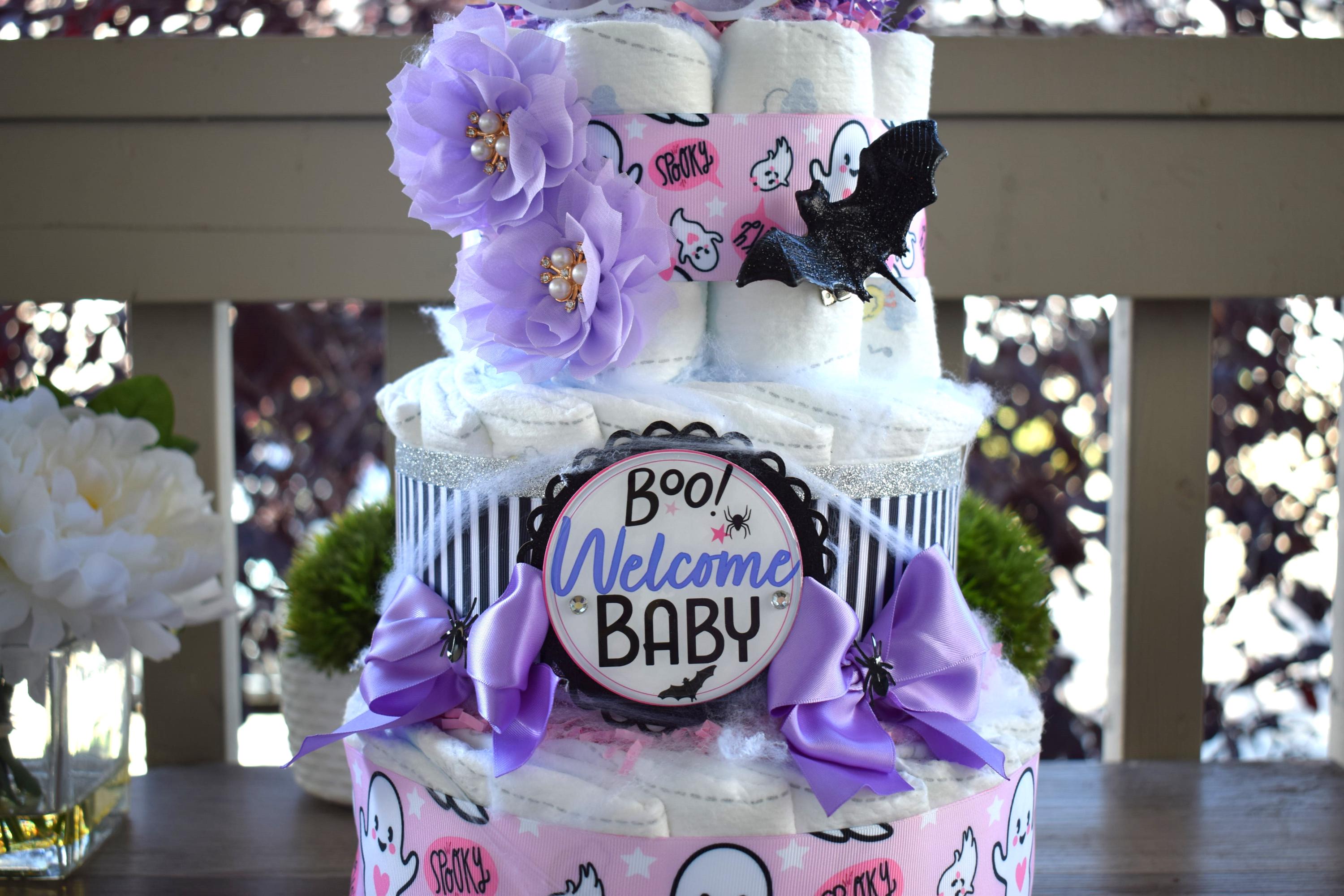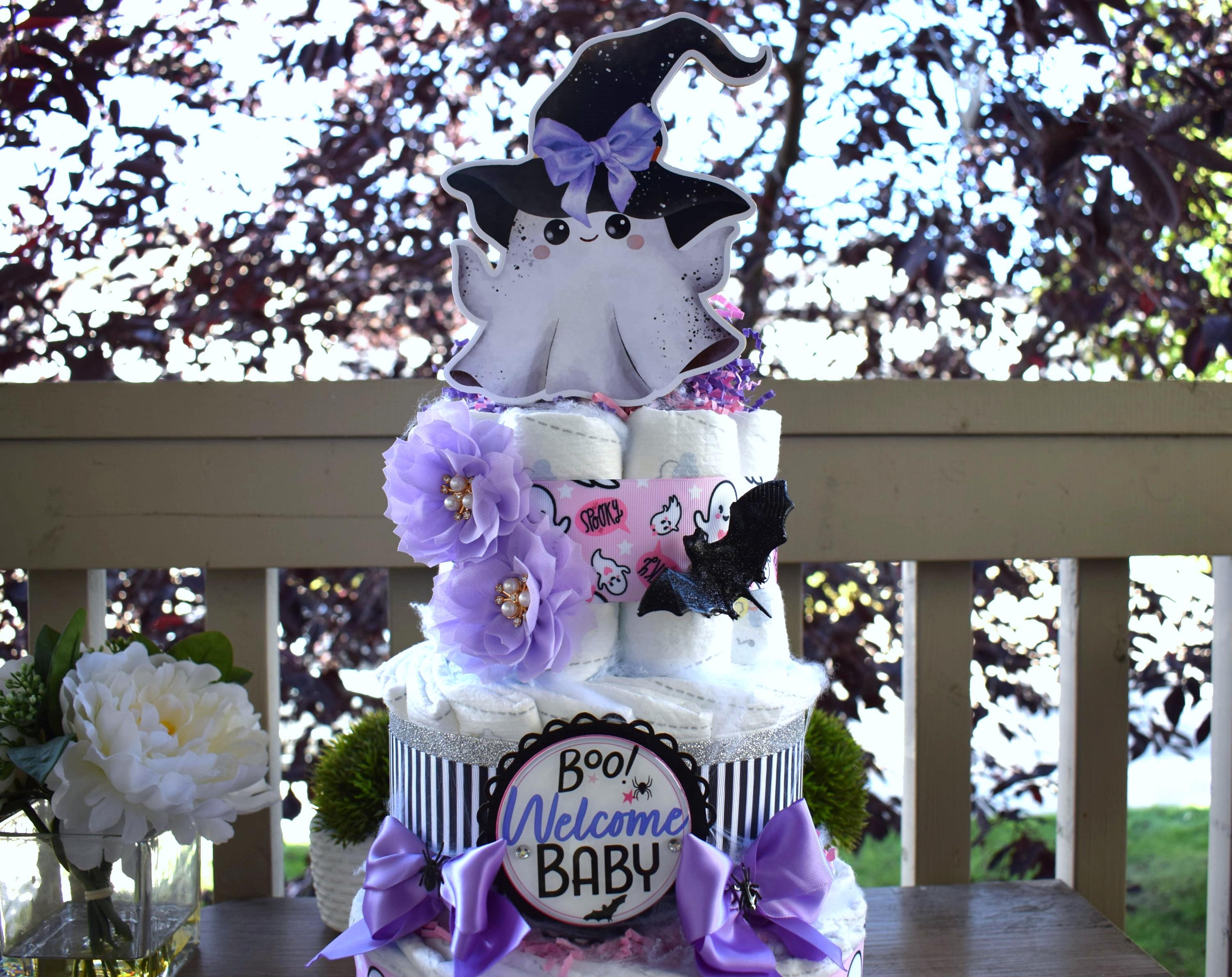 This Gorgeous Lavender Girl Witch Ghost Diaper 3 Tiers Cake is the perfect centerpieces for your baby shower. We can match any shower theme.