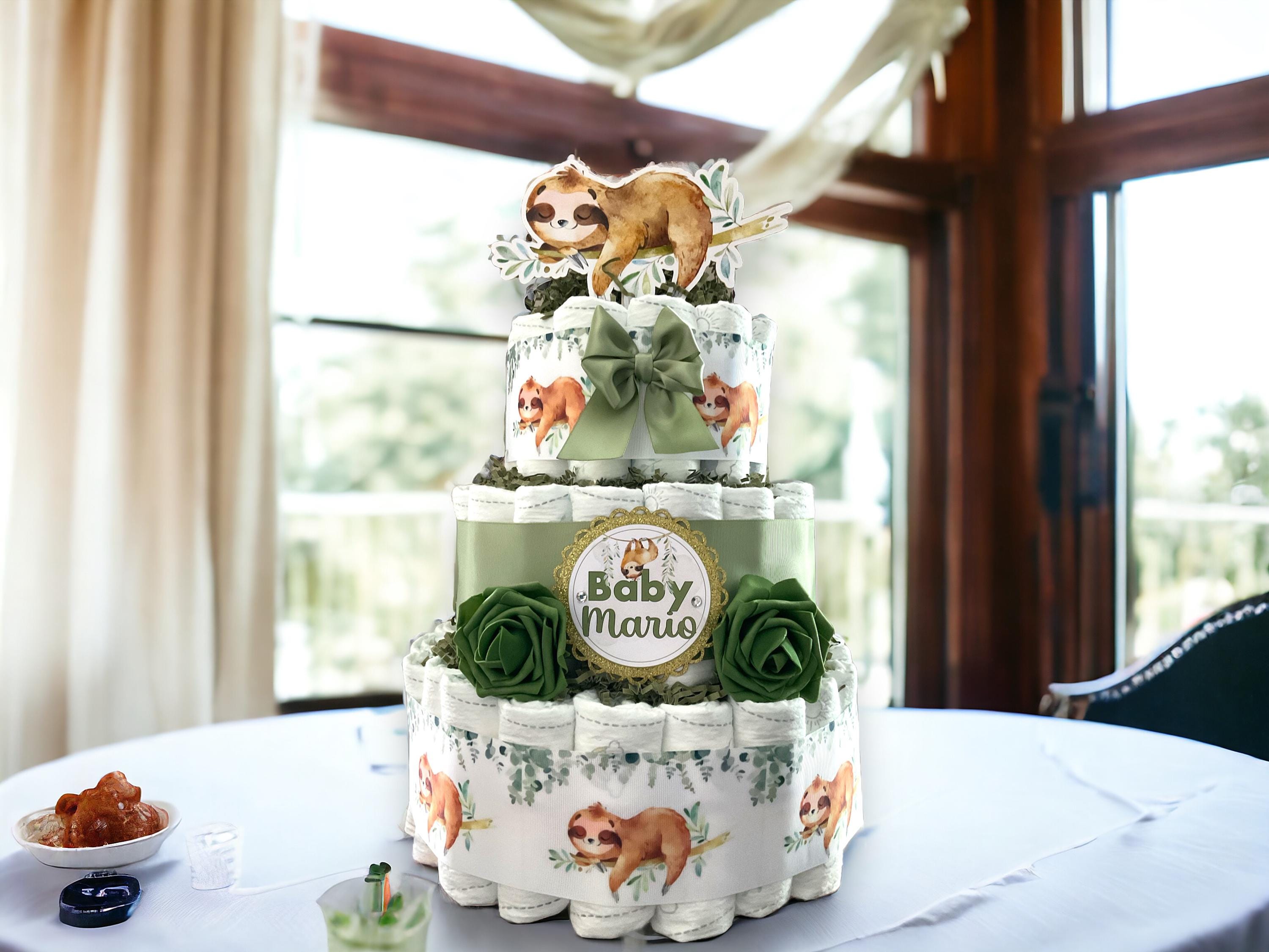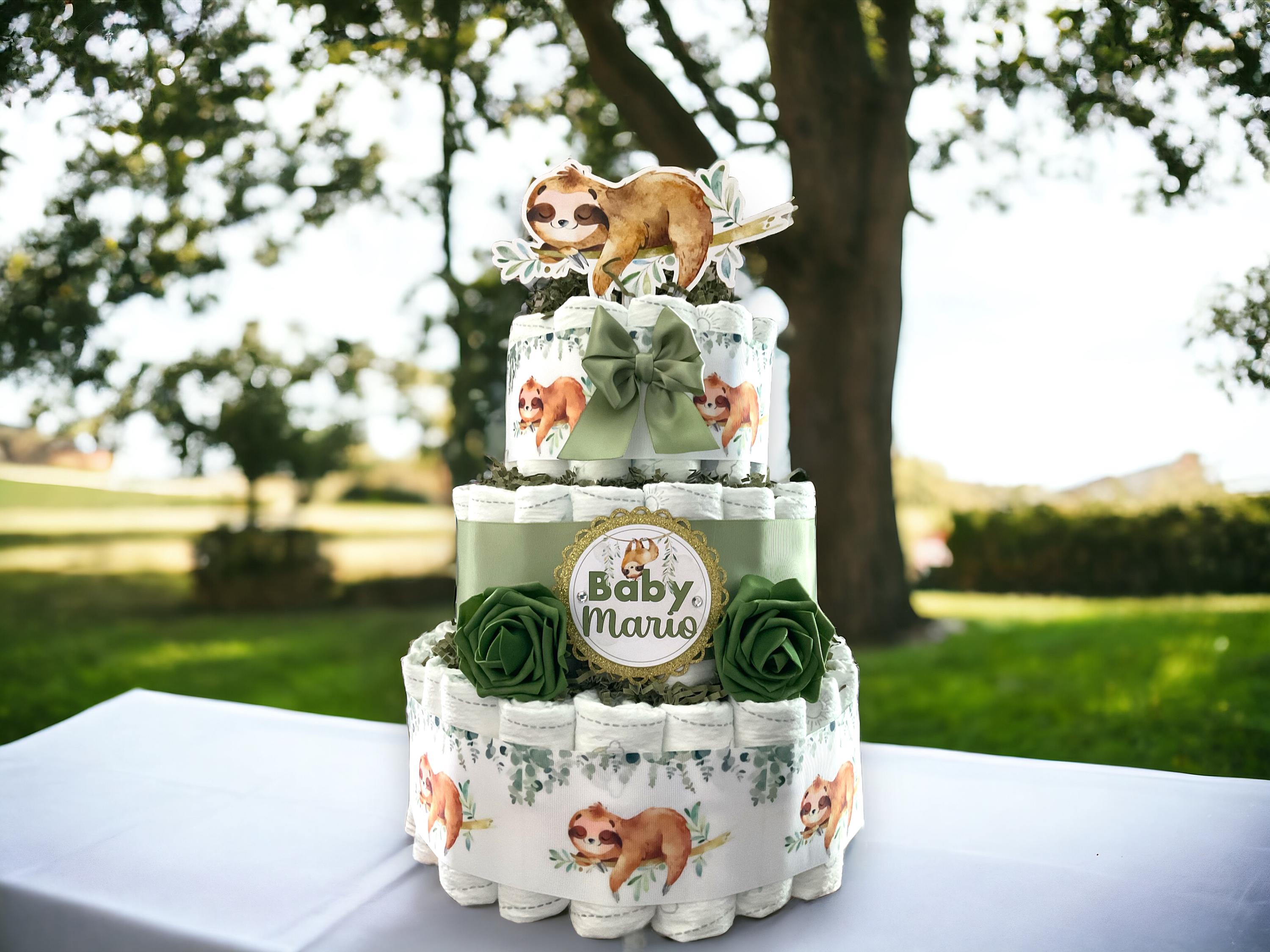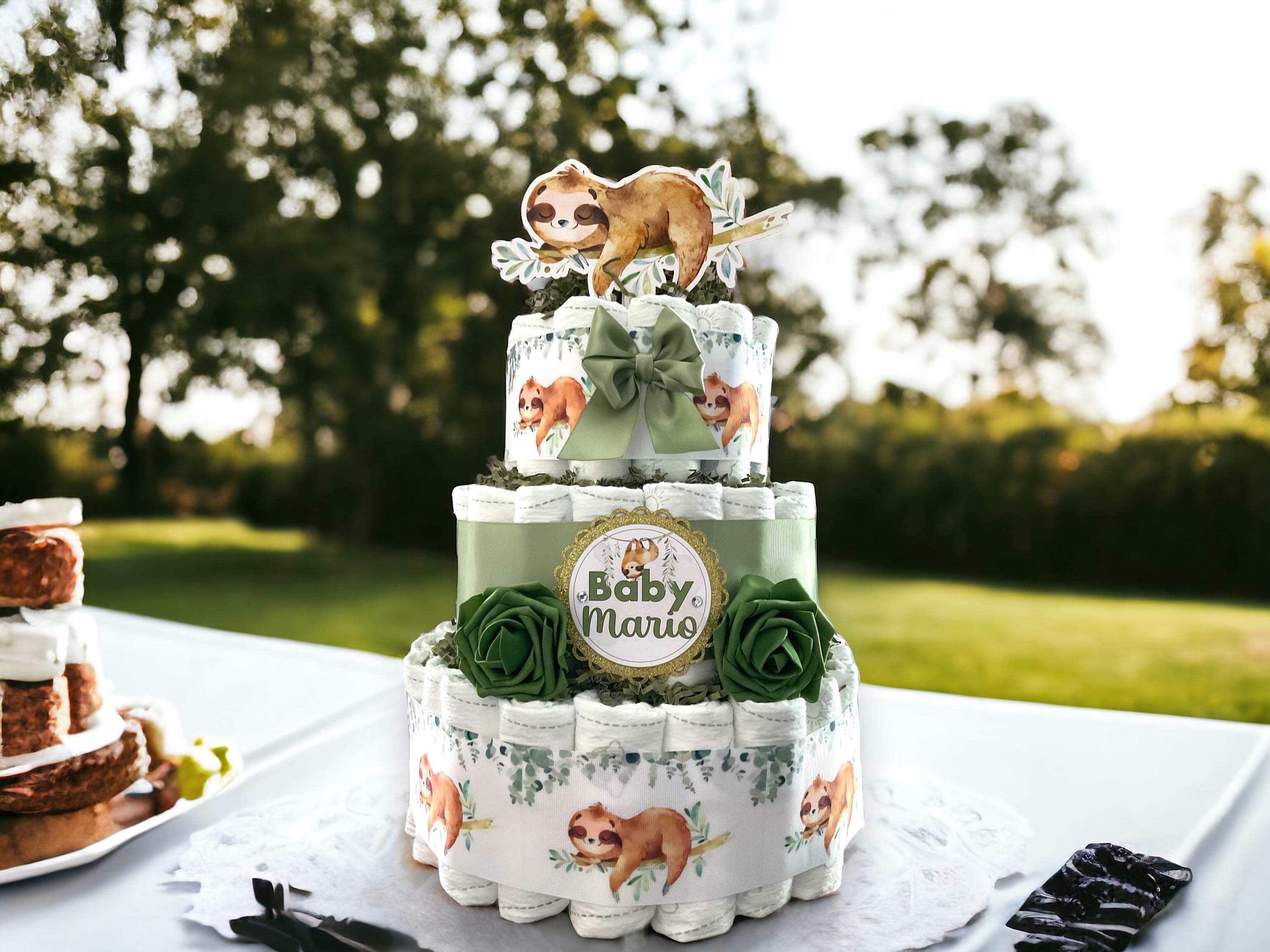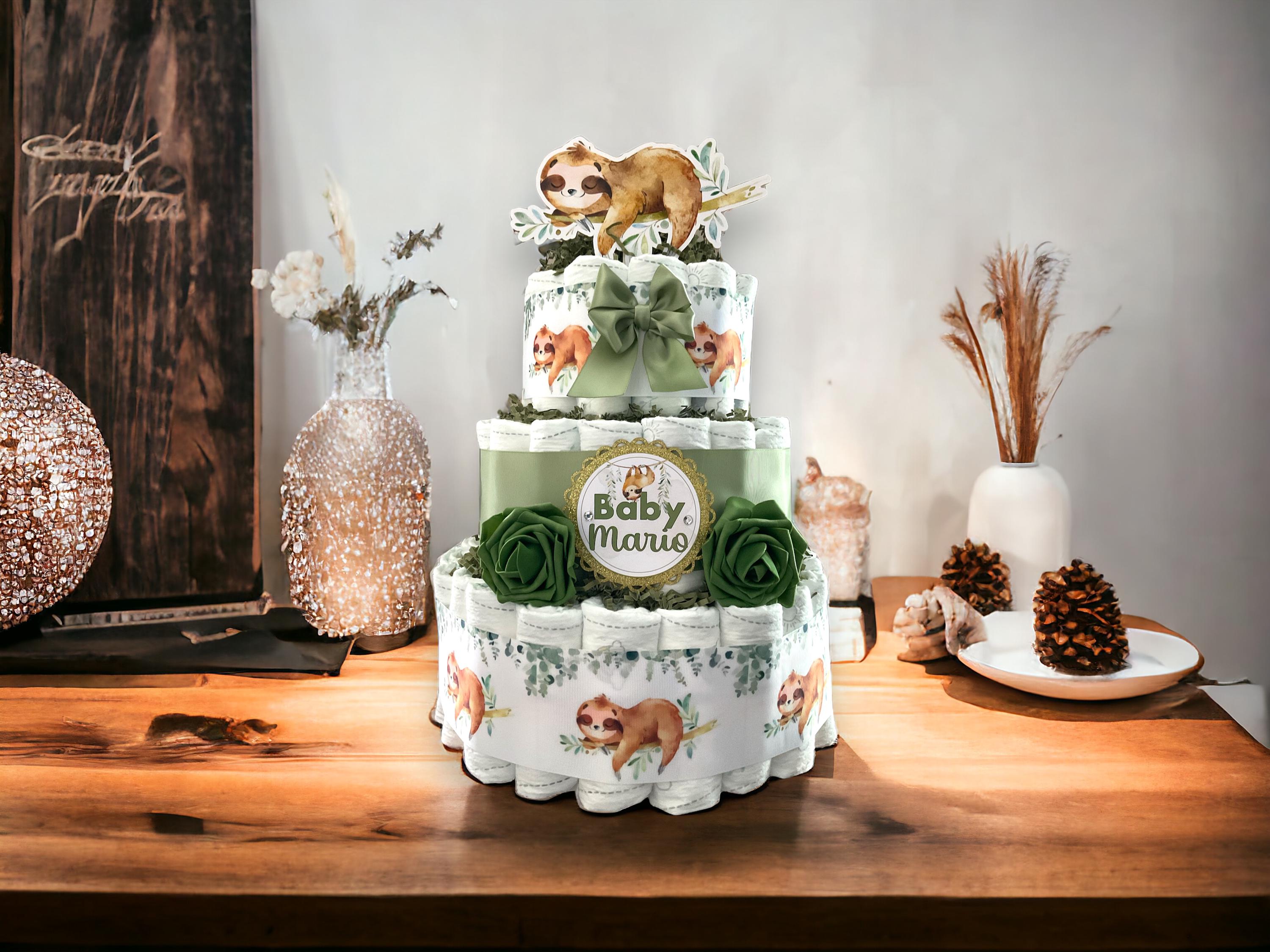 Sloth Greenery Diaper Cake Baby Shower, Green Leave Cake Centerpieces Decor, Greenery, Room Nursery Decor, New Mom Gifts II 3 Tier Diaper