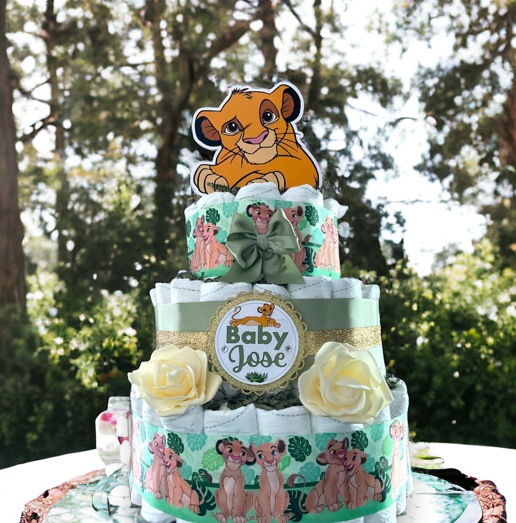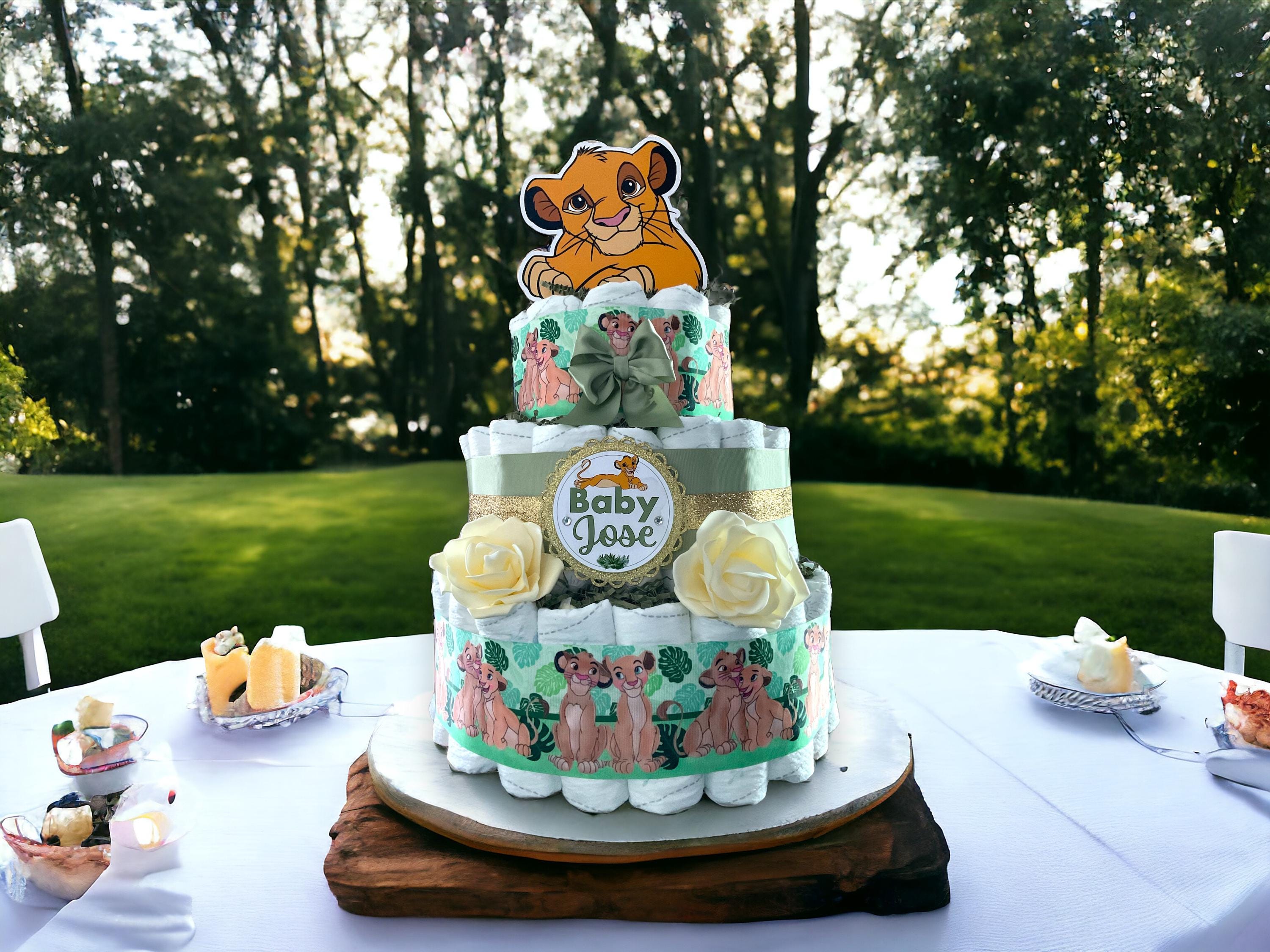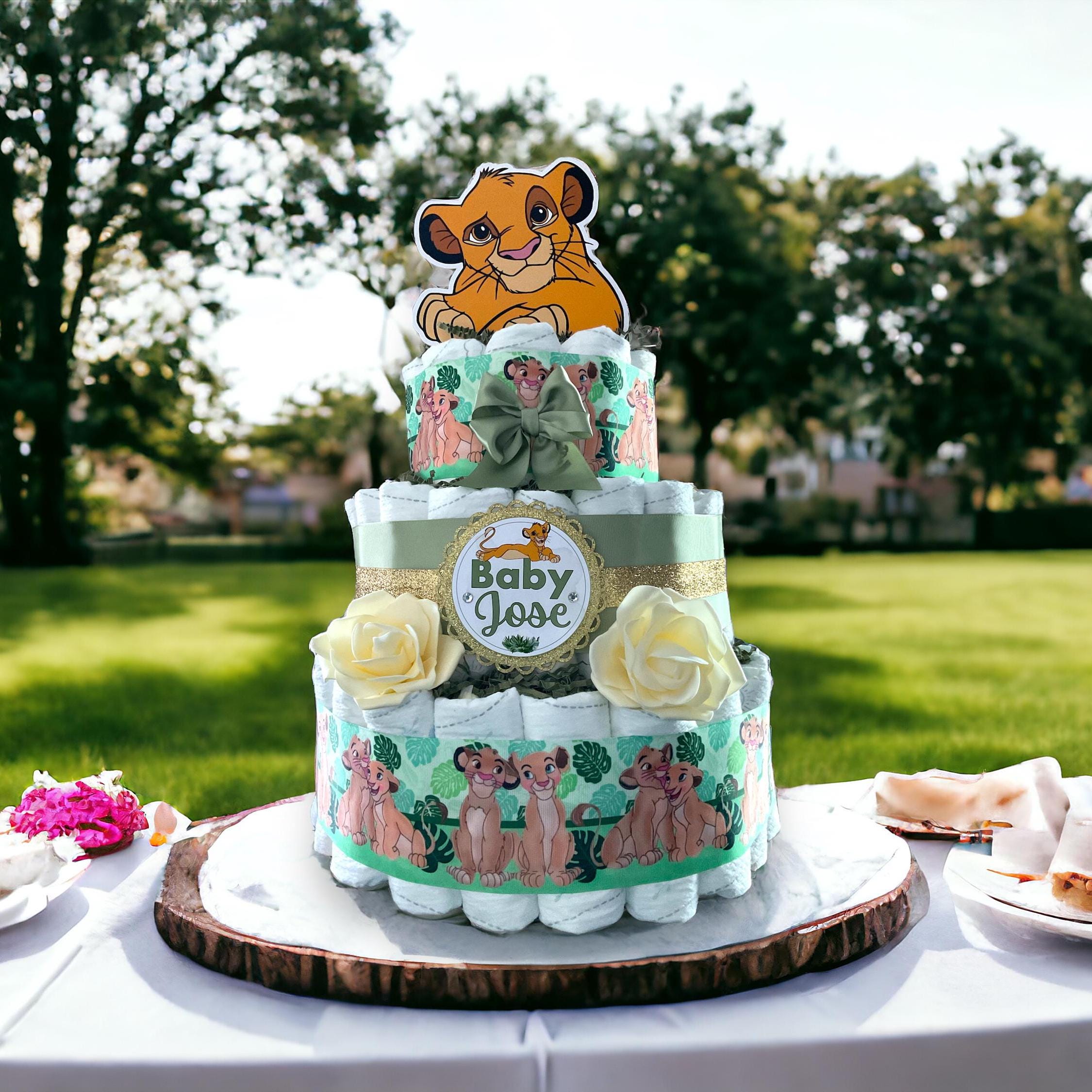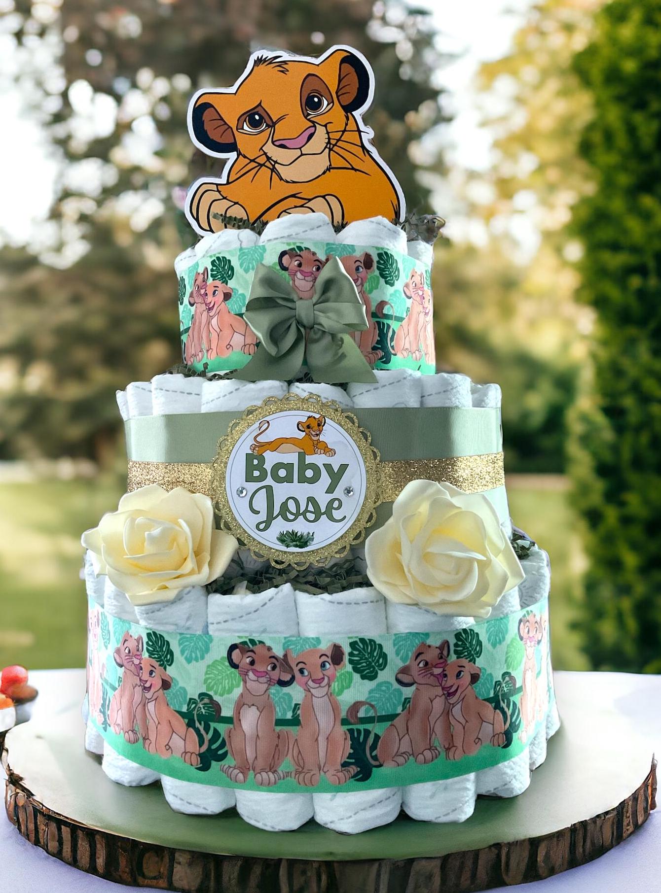 This Gorgeous Lion King 3 Tiers DiaperCake are the perfect centerpieces for your baby shower. We can match any shower theme.