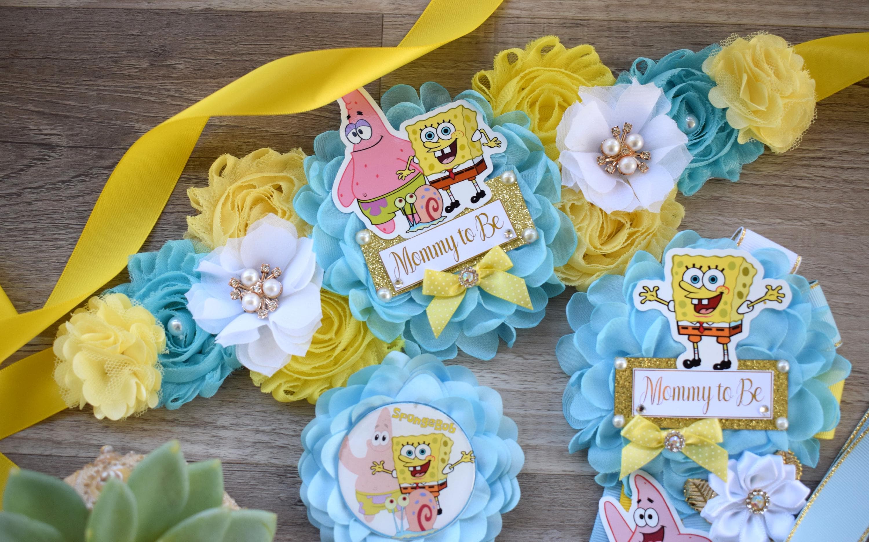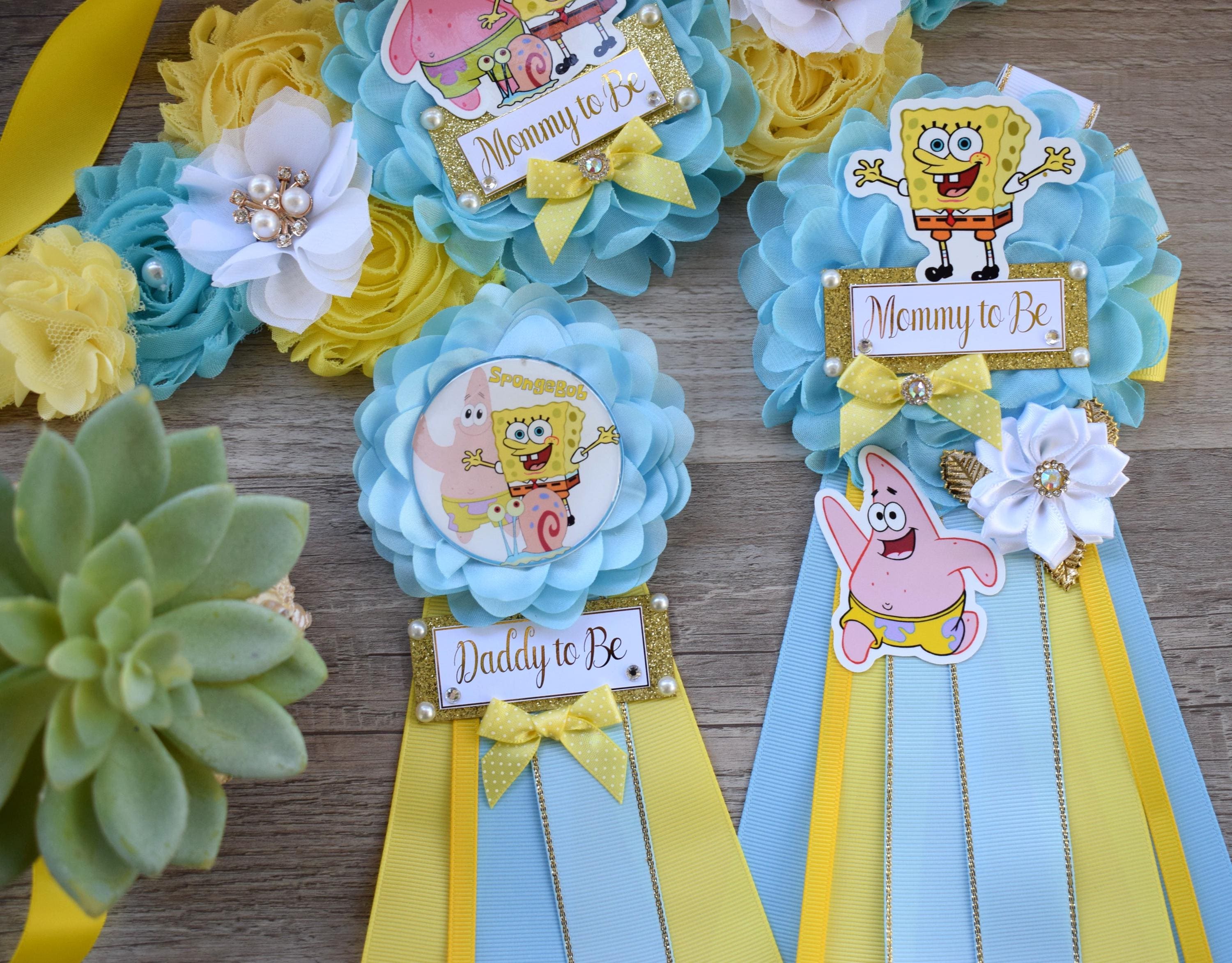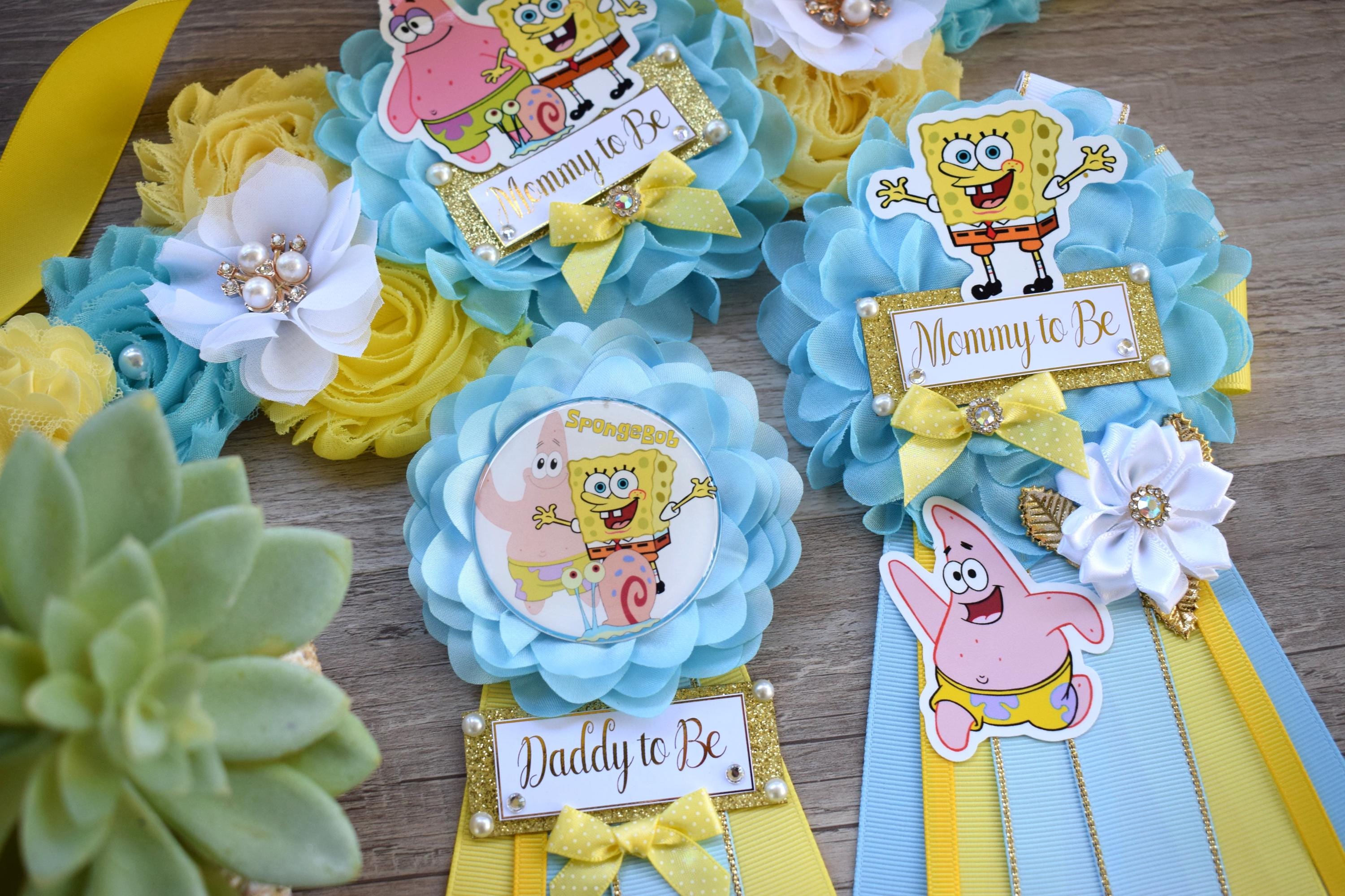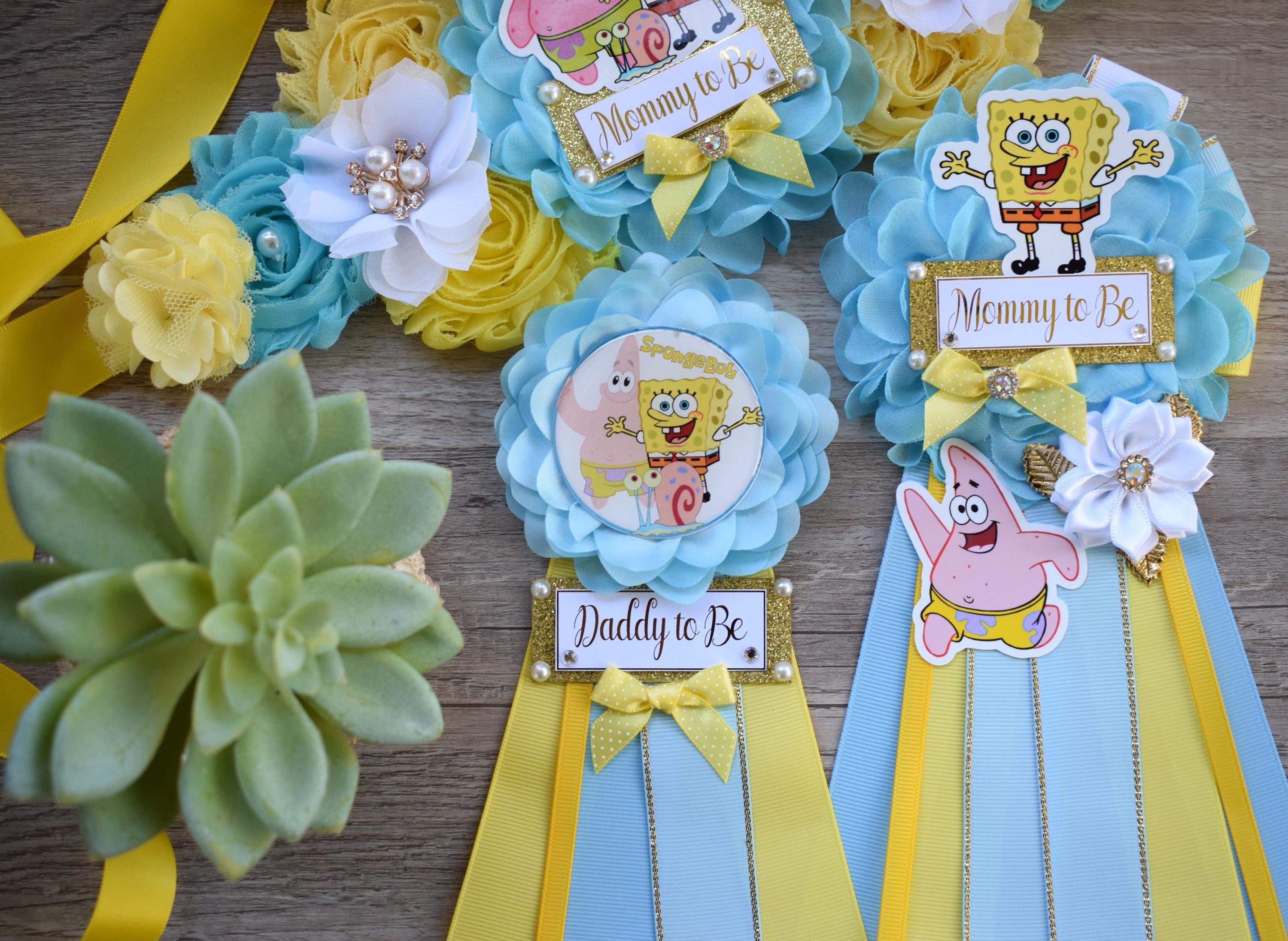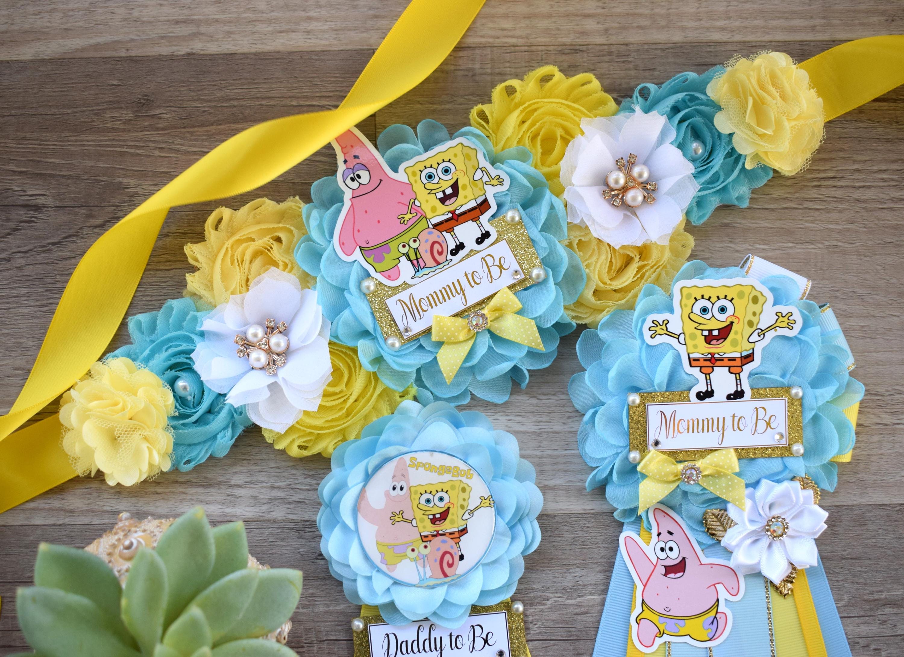 Sponge Baby Shower, Yellow Blue Maternity Sash, Mommy To Be Ribbon Badge Pin, Daddy To Be Pin, Baby Shower Gift