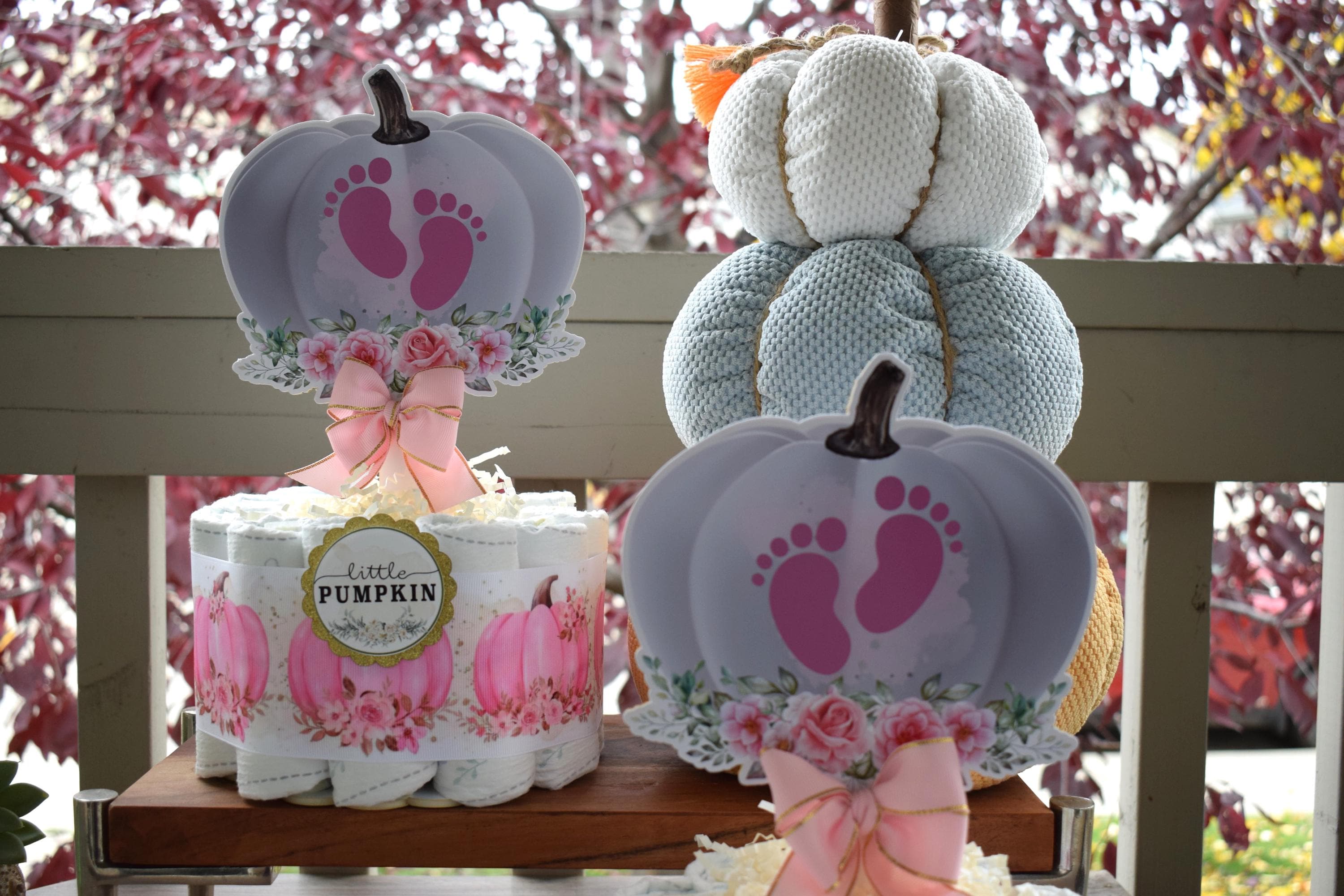 This Gorgeous Girl Pumpkin Mini Diaper Cake is the perfect centerpieces for your baby shower. We can match any shower theme.